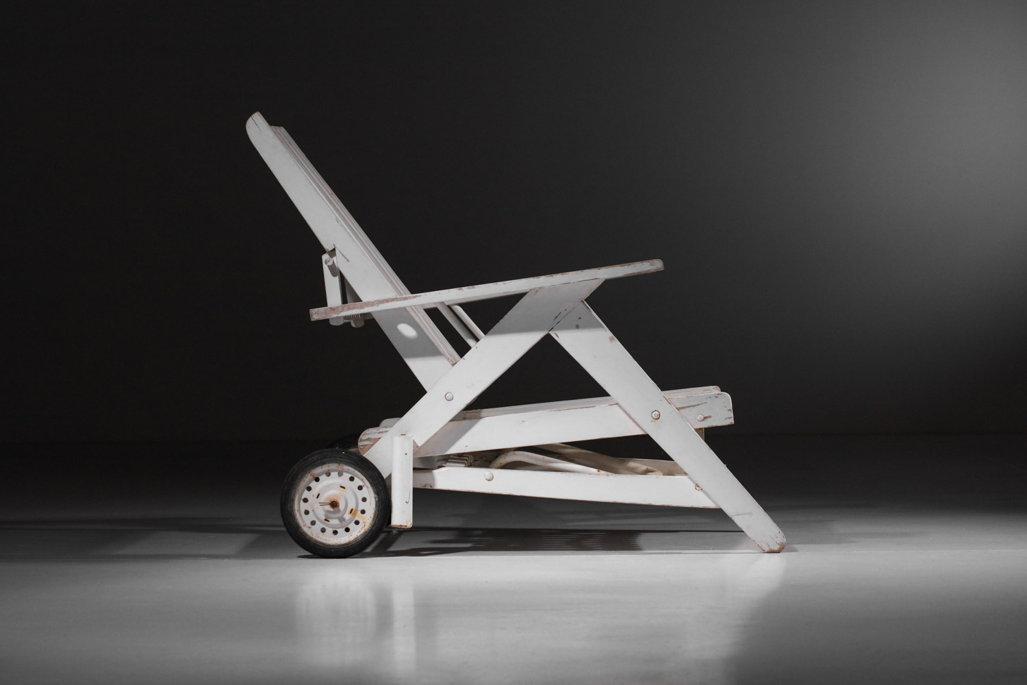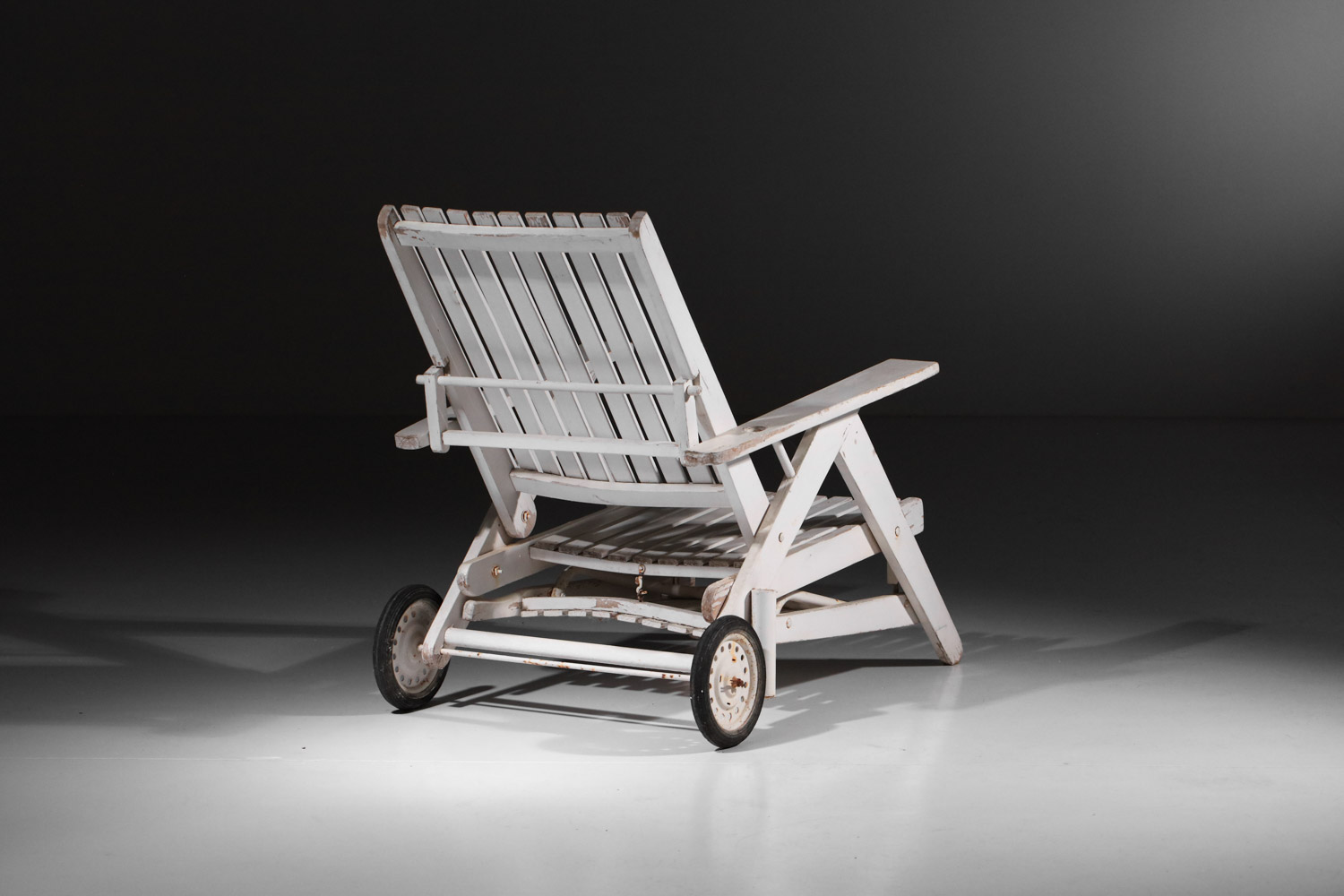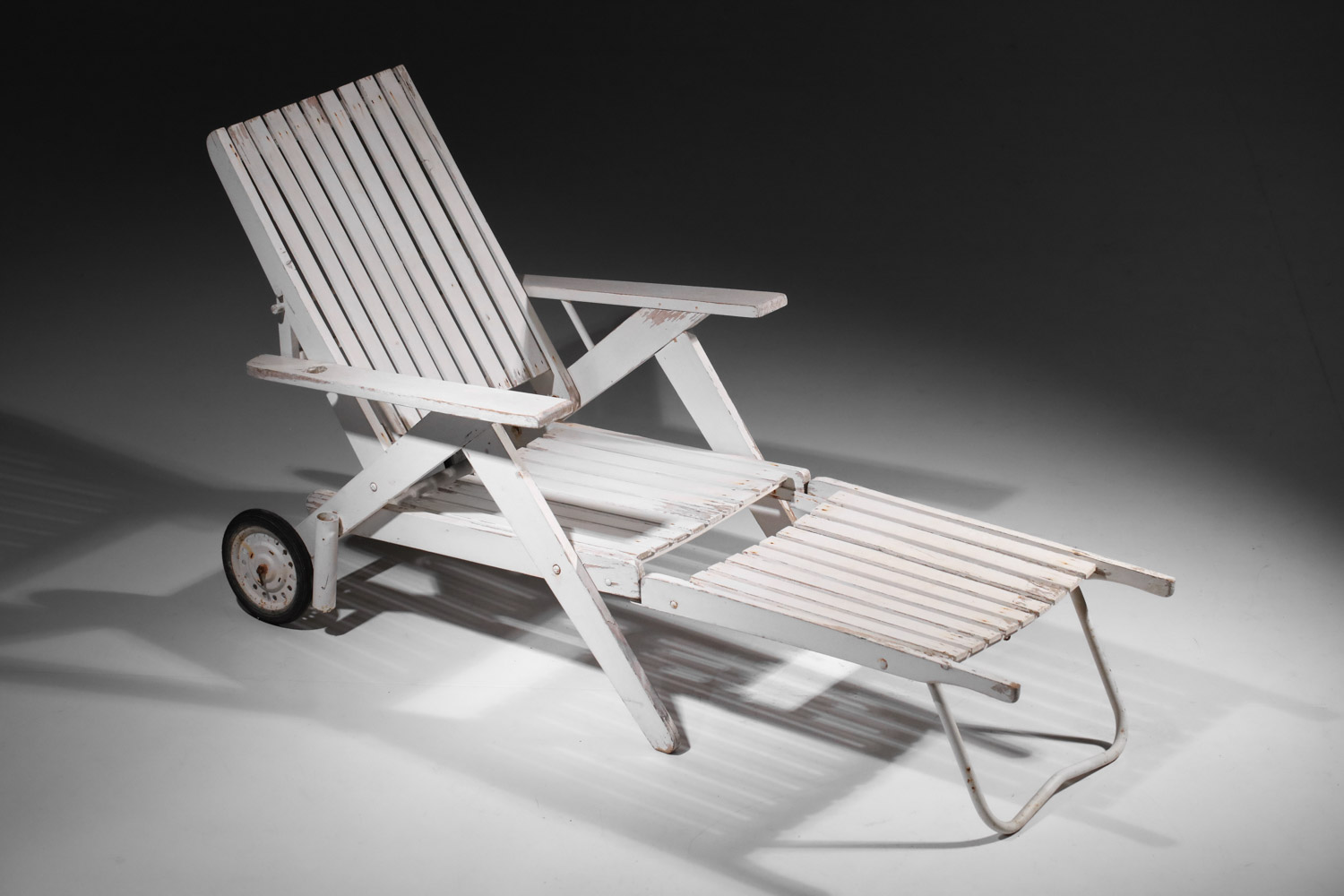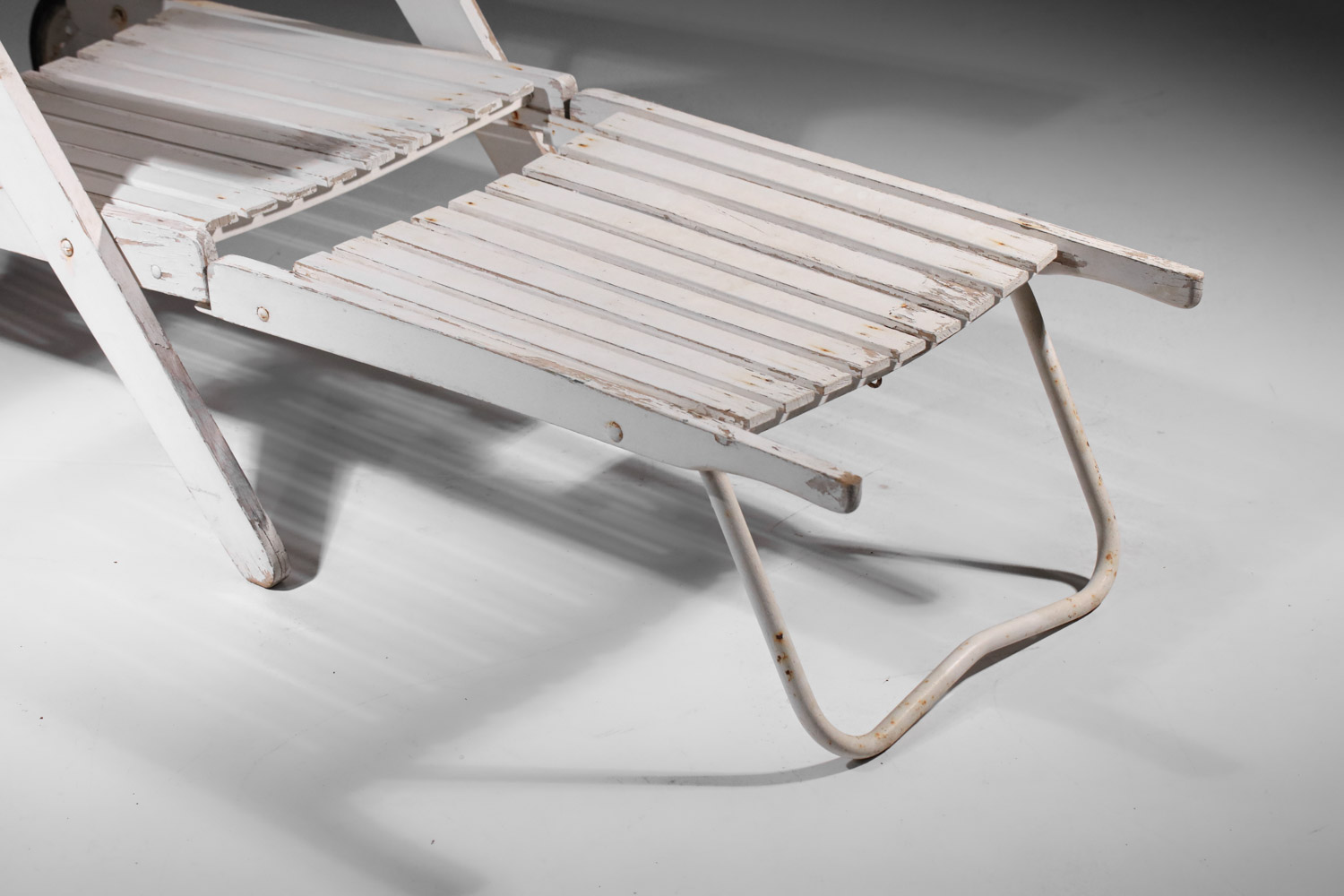 French sun lounger from the 1950s in solid wood with a white lacquered finish (original paint). Folding slatted backrest, seat, and footrest; base with two wheels at the rear. Beautiful patina throughout, showing signs of age and significant use, which we have chosen to preserve (see photos).
