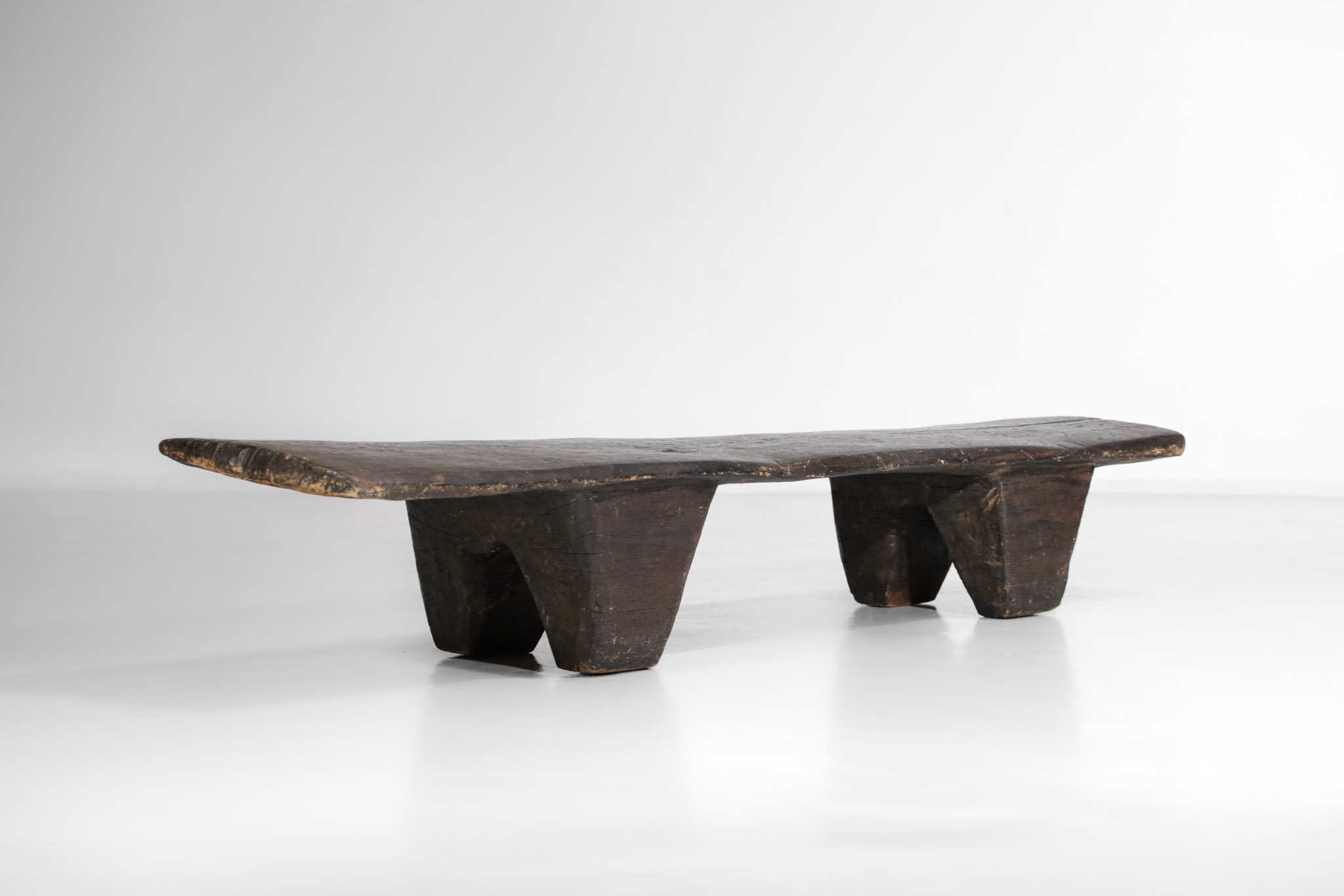 Asymmetrical African bench that can also be used as a large coffee table. Entirely carved from a single piece of solid wood.