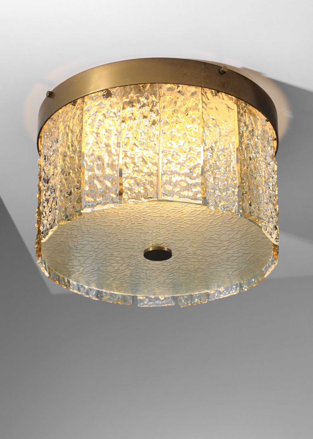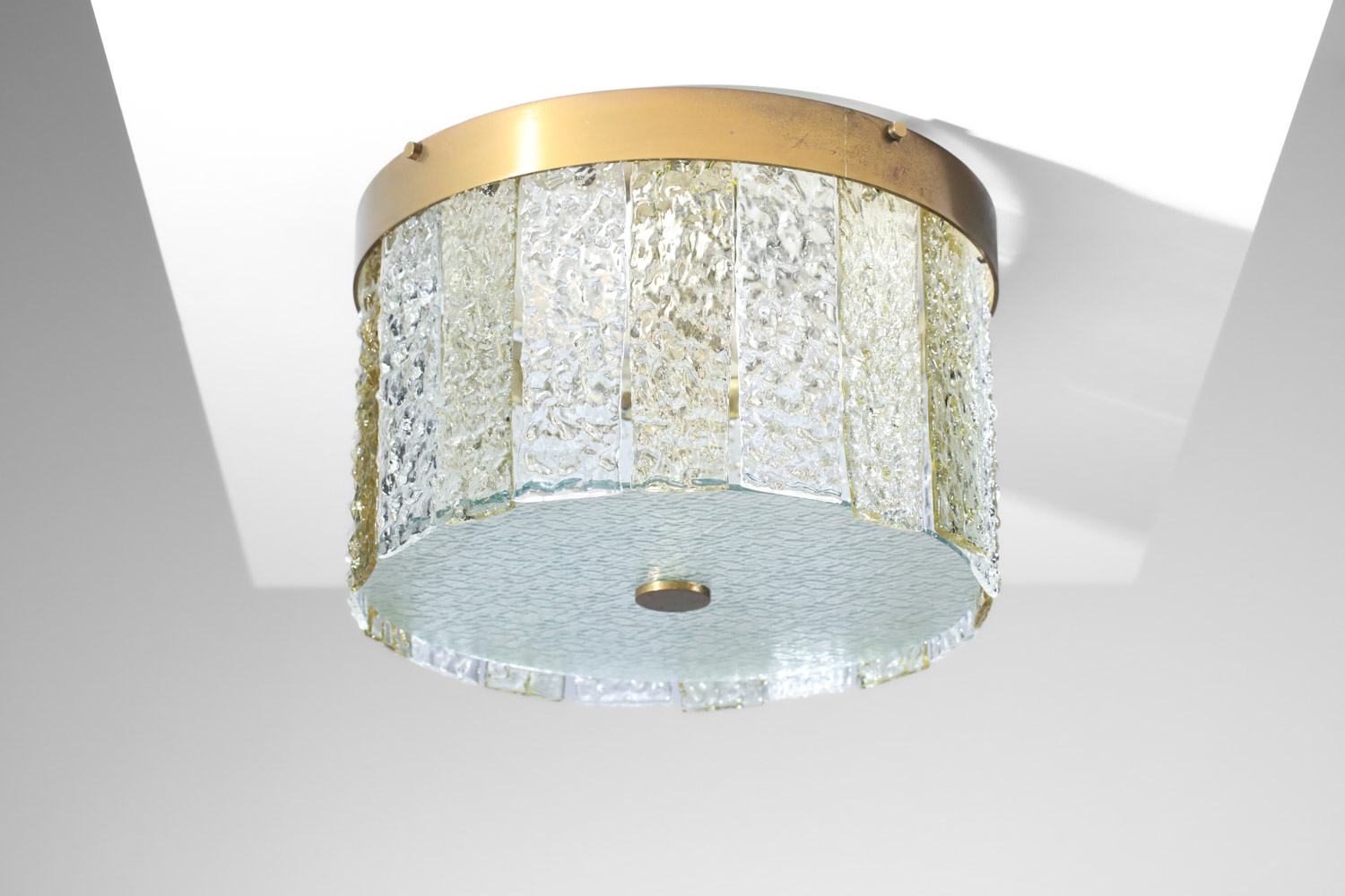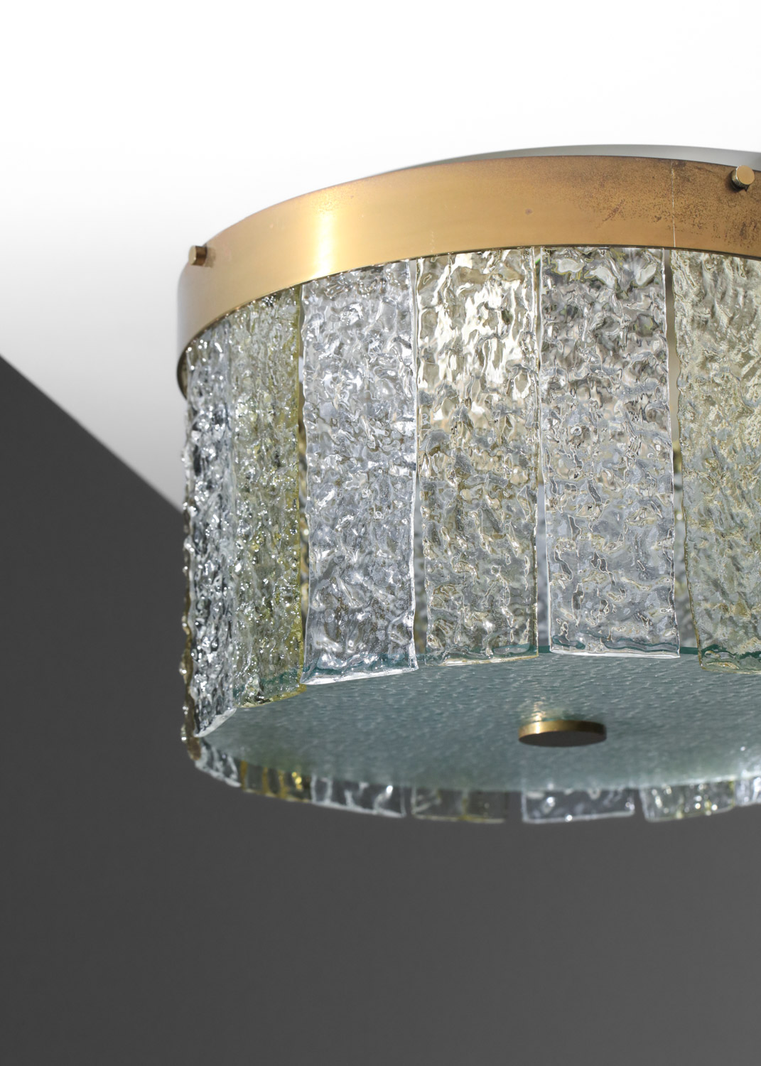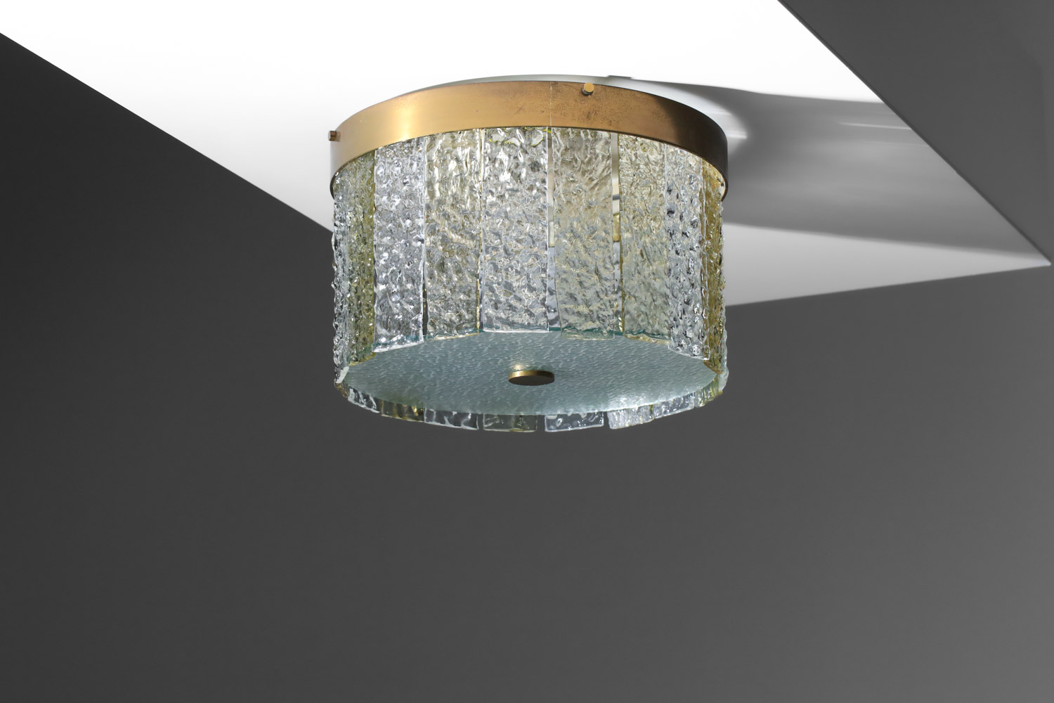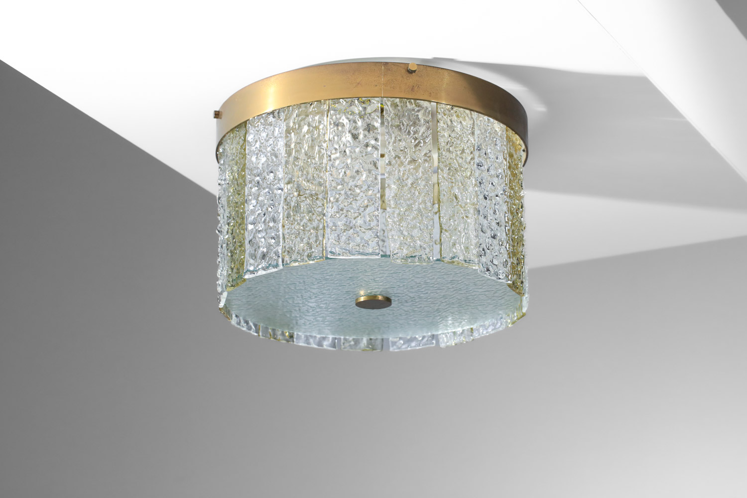 Italian ceiling light from the 1950s by designer Angelo Lelli for Arredoluce. Structure in solid patinated brass and white lacquered metal (original paint). The ceiling light consists of 19 textured glass plates: 10 smoked glass plates and 9 transparent glass plates. In the center is a large disc, also made of textured glass. Very good vintage condition, slight signs of age and use, particularly on the brass (see photos). We recommend two E27 LED bulbs.