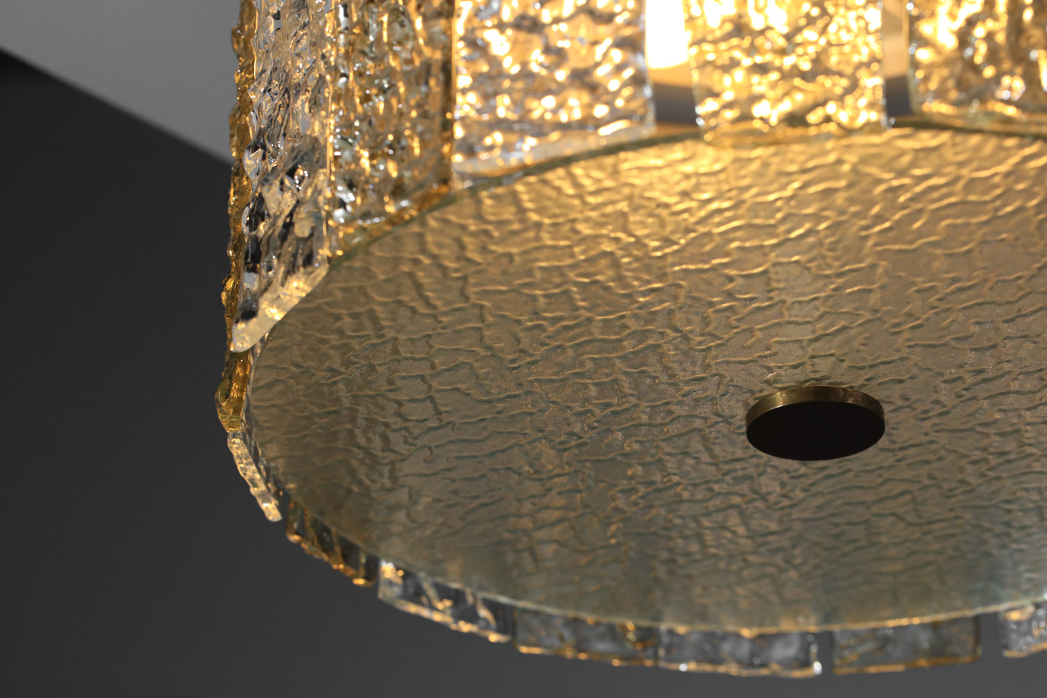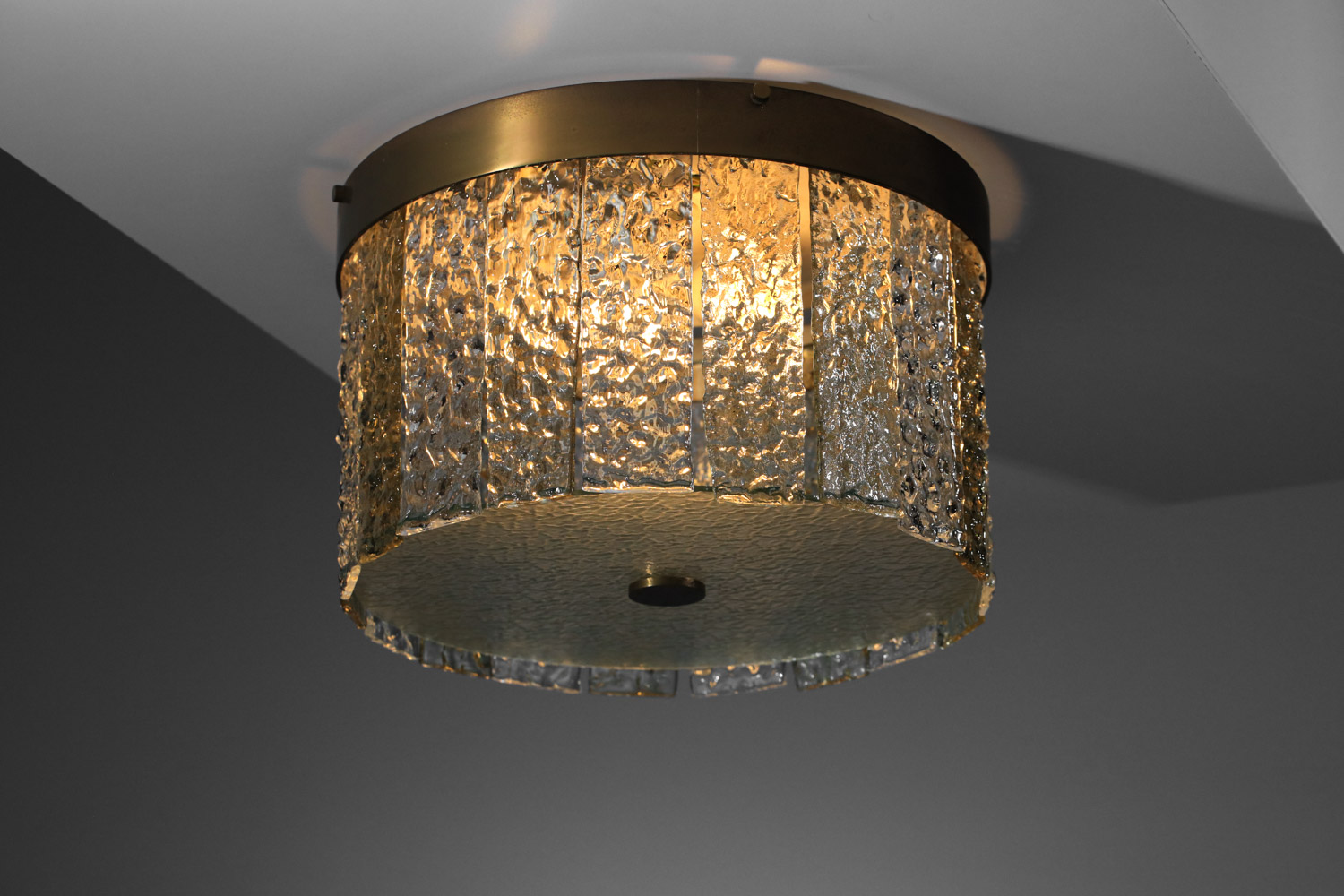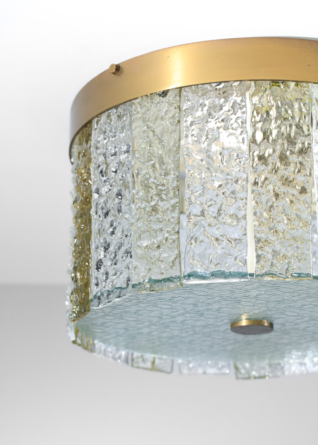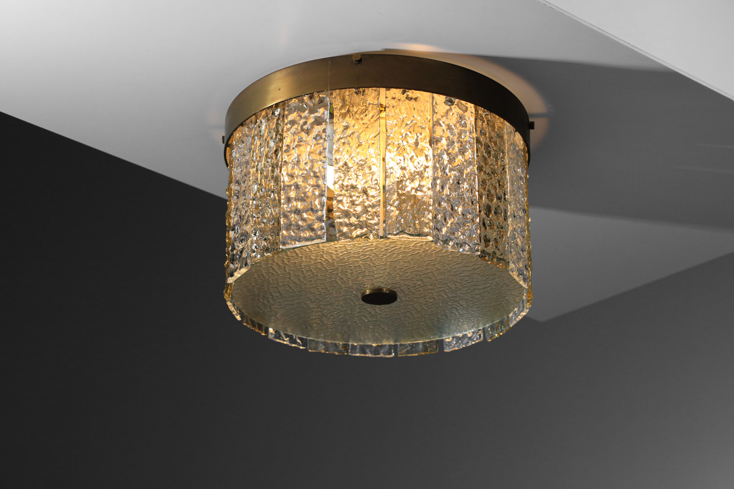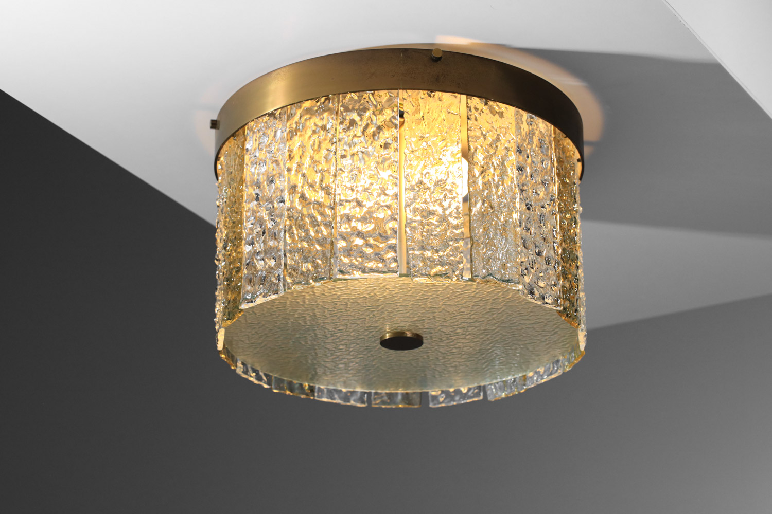 Italian ceiling light from the 1950s by designer Angelo Lelli for Arredoluce. Structure in solid patinated brass and white lacquered metal (original paint). The ceiling light consists of 19 textured glass plates: 10 smoked glass plates and 9 transparent glass plates. In the center is a large disc, also made of textured glass. Very good vintage condition, slight signs of age and use, particularly on the brass (see photos). We recommend two E27 LED bulbs.