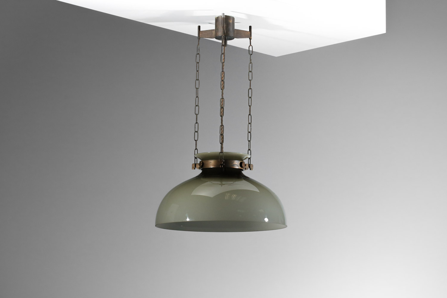 Italian hanging lamp from the 60s by Paolo Cagliari for Venini. Solid, patinated brass structure and large, thick, gray glass shade. Simple, elegant design. Beautiful vintage condition, with traces of age and use (see photos). Electrical system refurbished, we recommend an E27 LED bulb.