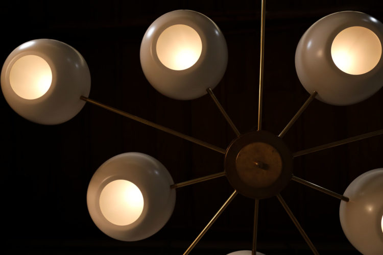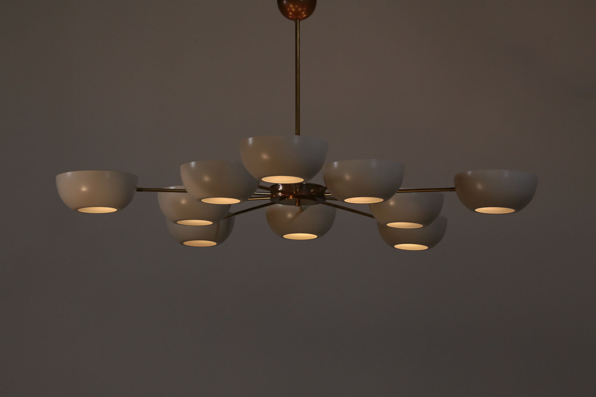 Large contemporary Italian chandelier with ten branches. Work in the style of the 60s such as Stilnovo or Gino Sarfatti. Solid brass structure, creamy white lacquered steel lampshade and frosted glass cup diffusers. Diffuser colours available on request. Polished or oxidized brass finish.
