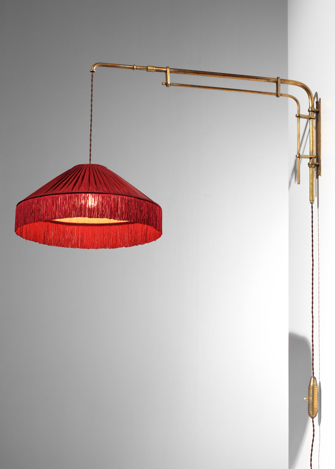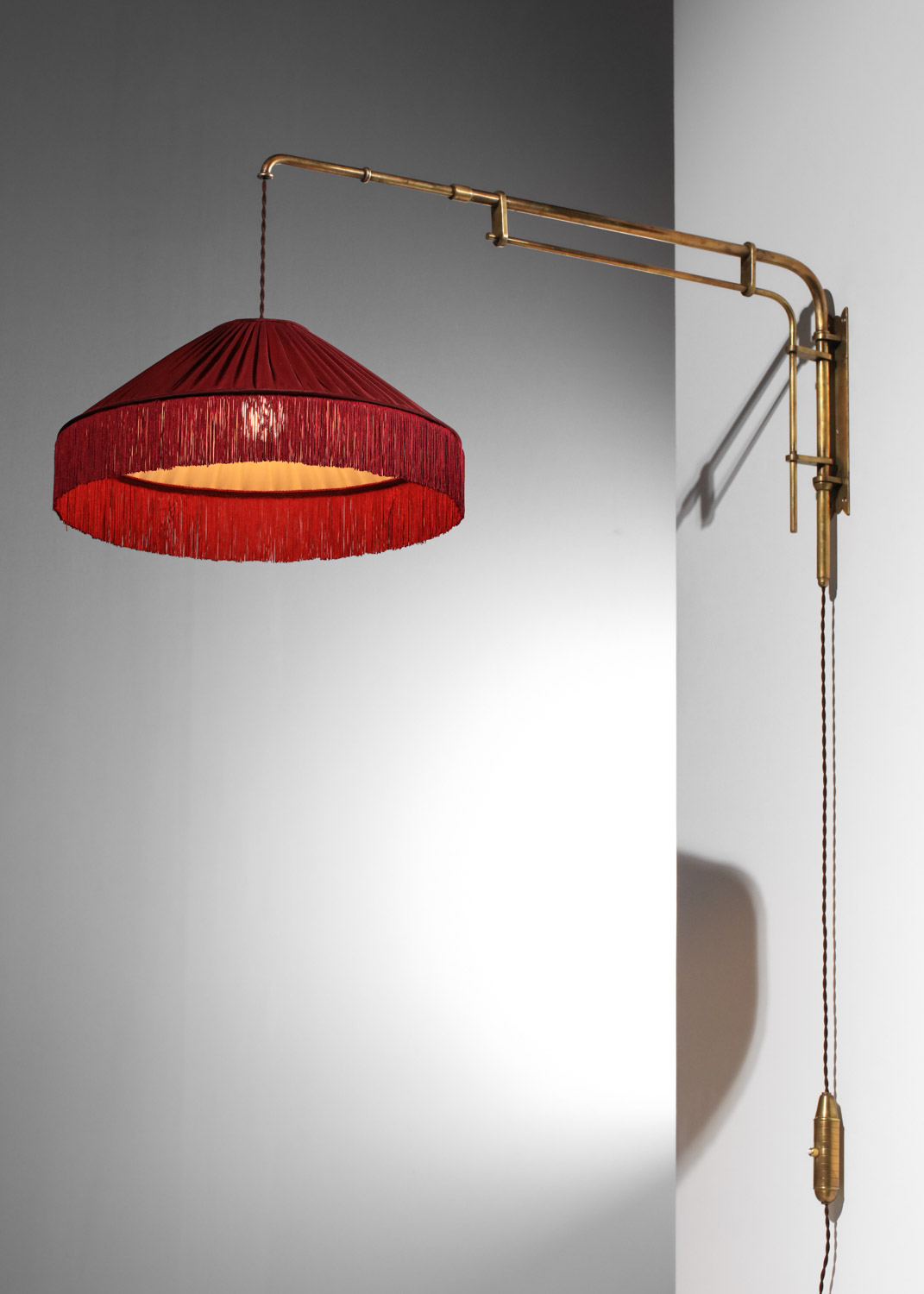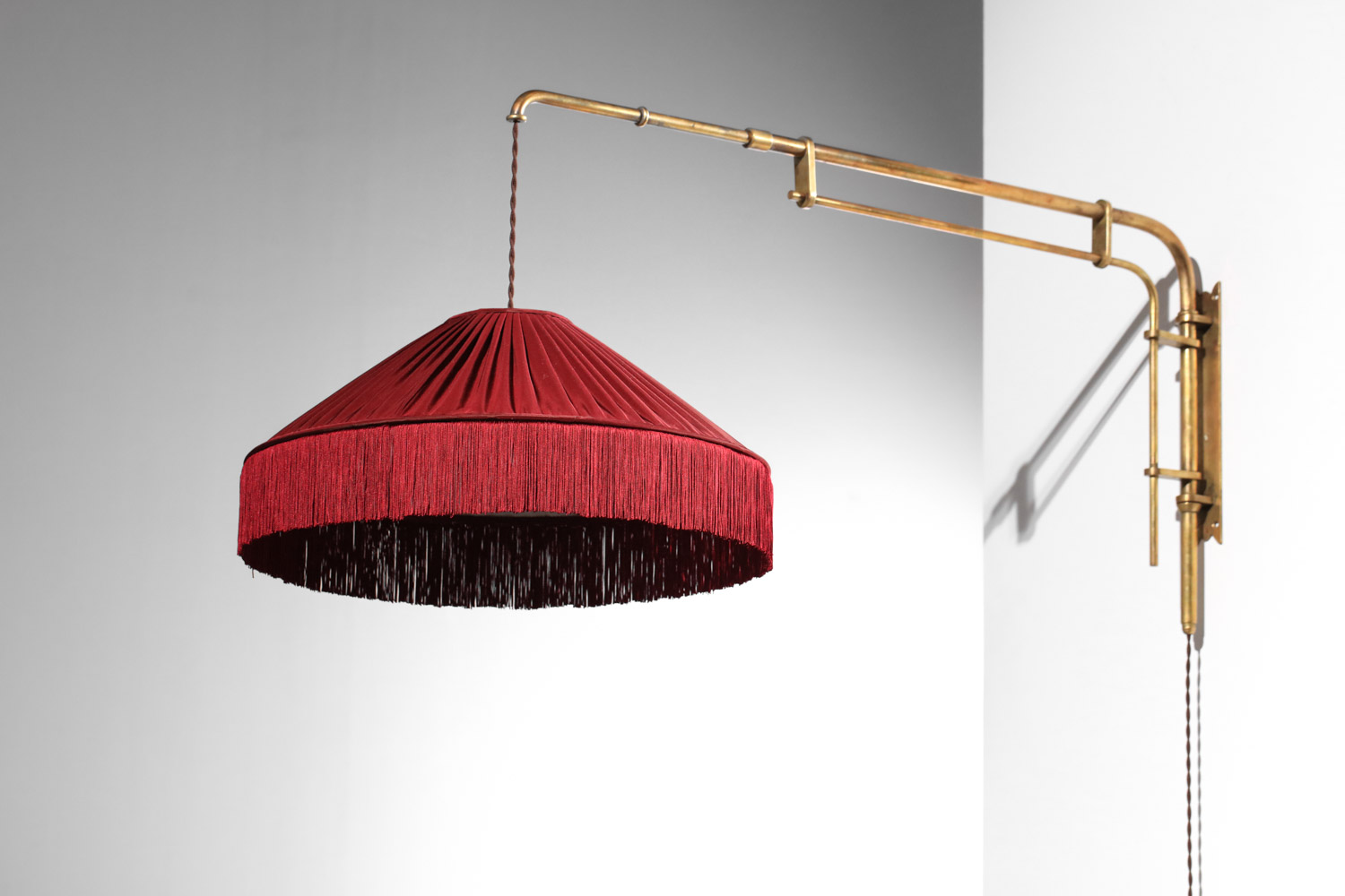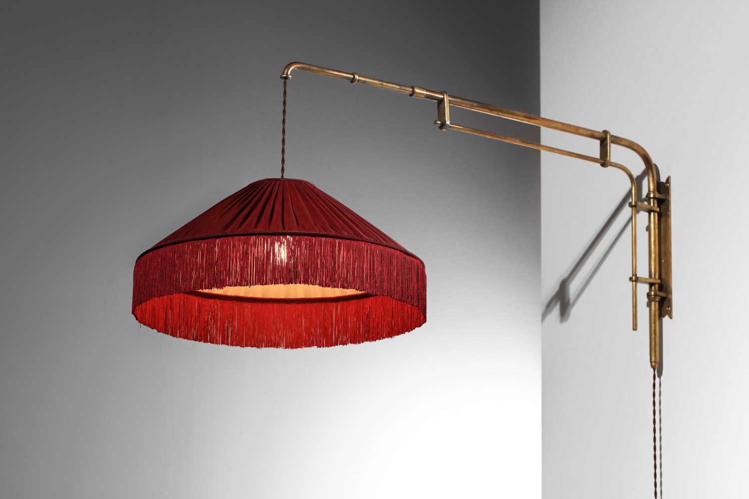 Large Italian wall sconce from the 1950s. Solid brass frame with a counterweight system for adjusting the shade height and a telescopic arm. Very good vintage condition, with minor scratches on the brass (see photos). Custom-made burgundy silk shade with fringe. We recommend an E27 LED bulb.