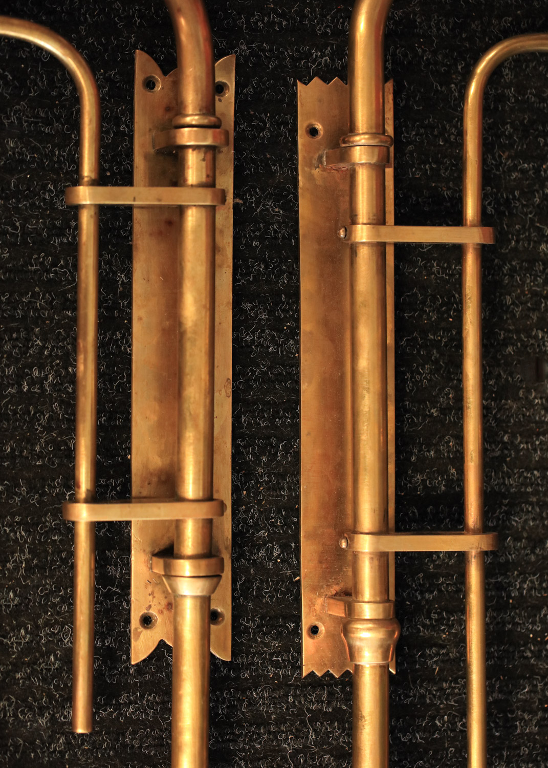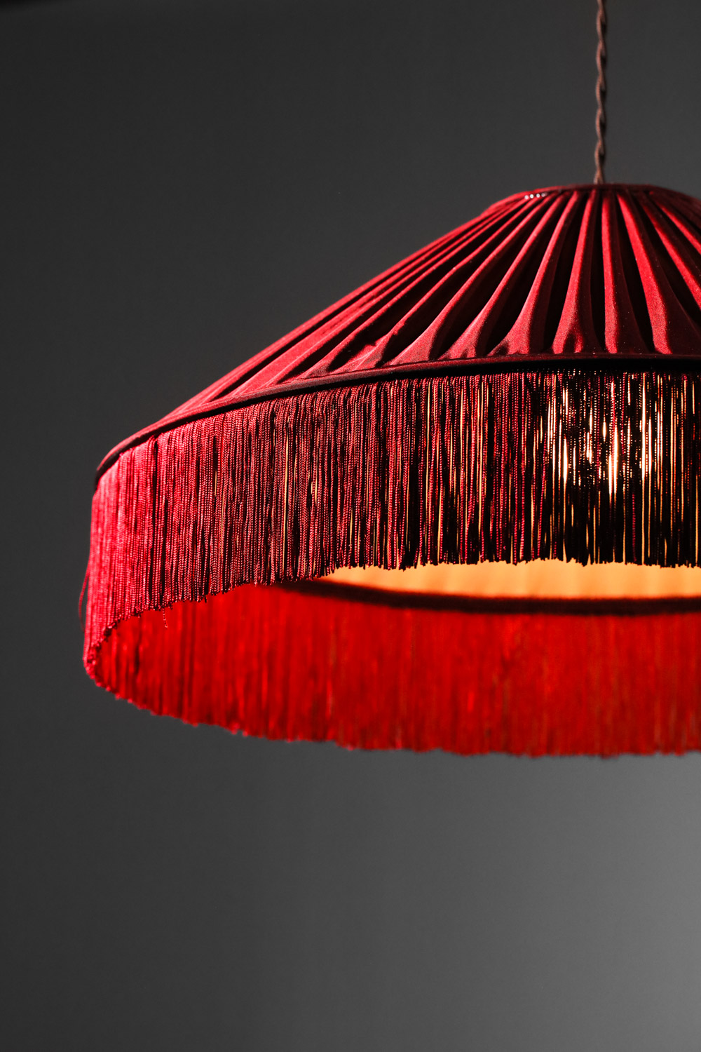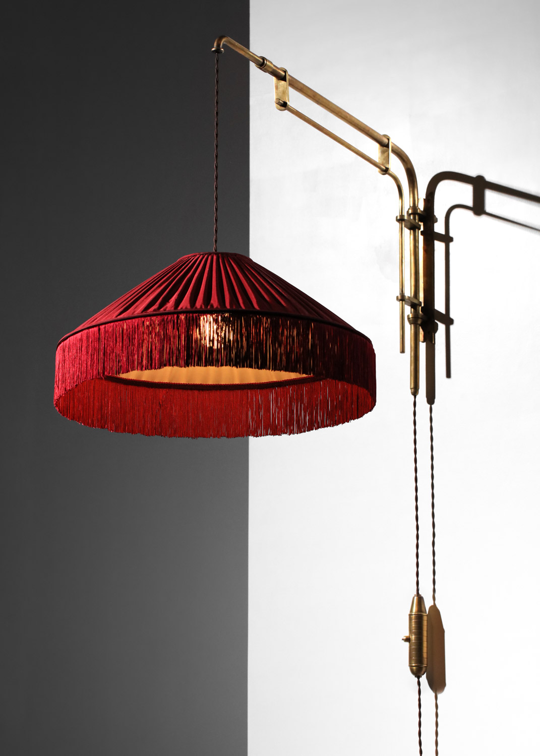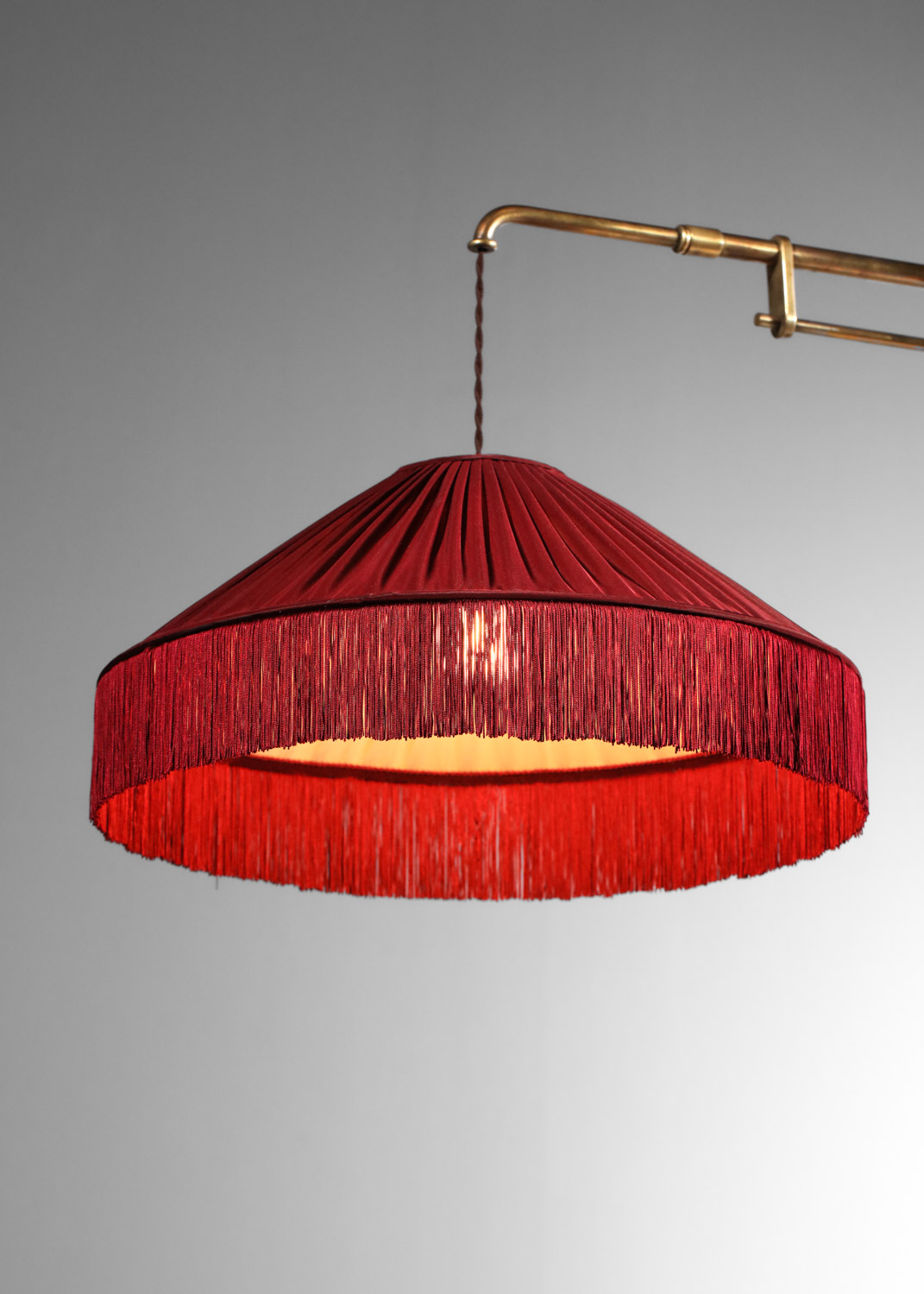 Large Italian wall sconce from the 1950s. Solid brass frame with a counterweight system for adjusting the shade height and a telescopic arm. Very good vintage condition, with minor scratches on the brass (see photos). Custom-made burgundy silk shade with fringe. We recommend an E27 LED bulb.