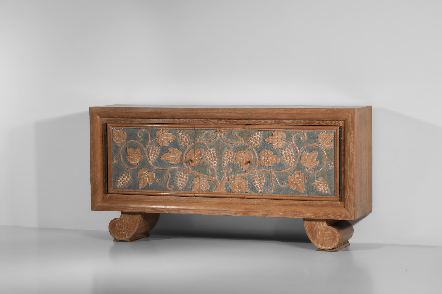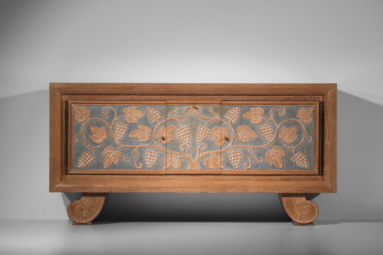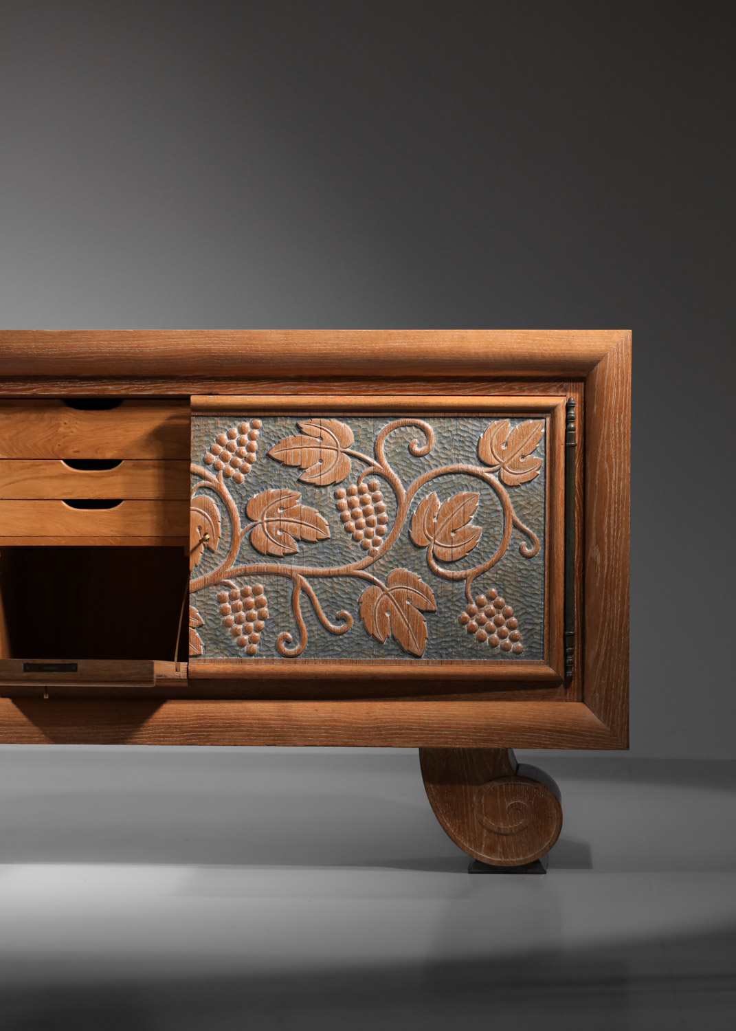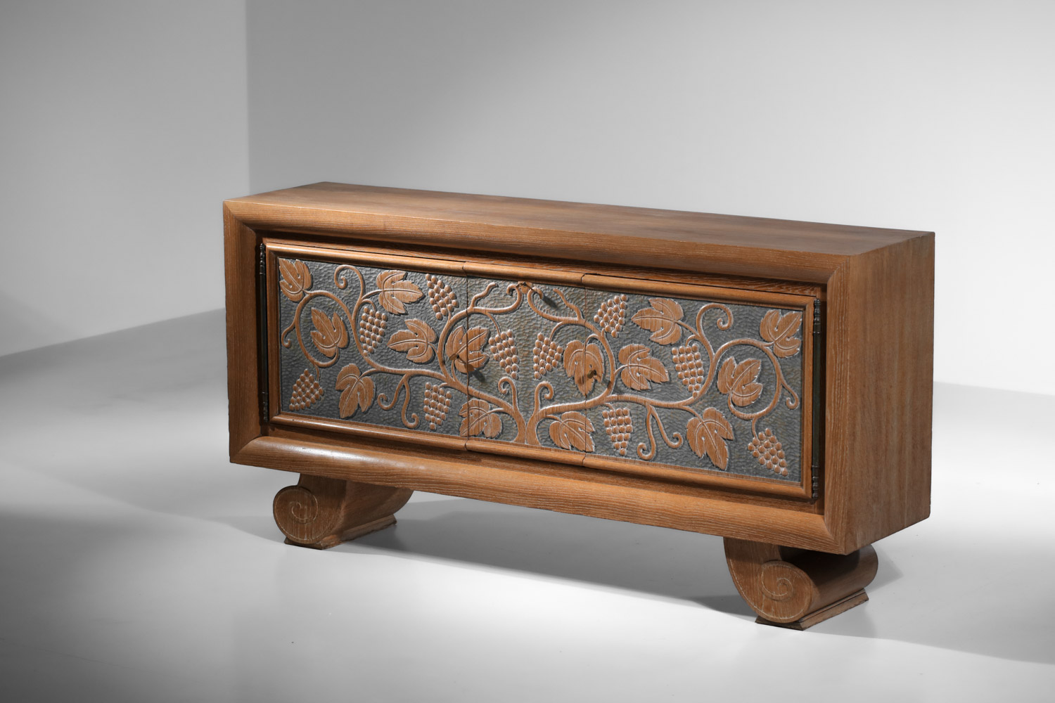Large French sideboard from the 1940s/1950s by René and Gilbert Schmitt in solid oak and veneer with a limed finish. Superb gouged decoration on the doors depicting grape clusters and vine leaves. Unique piece. Very good vintage condition, note three restorations to the veneer on the top, signs of age and use (see photos). The three keys are provided with the piece.