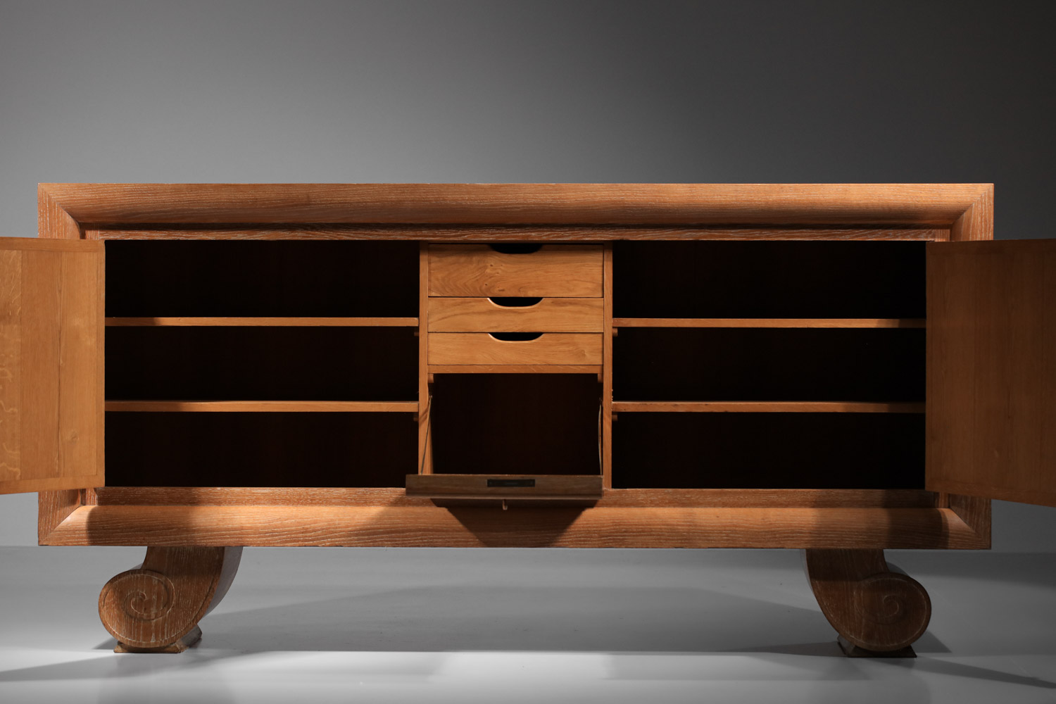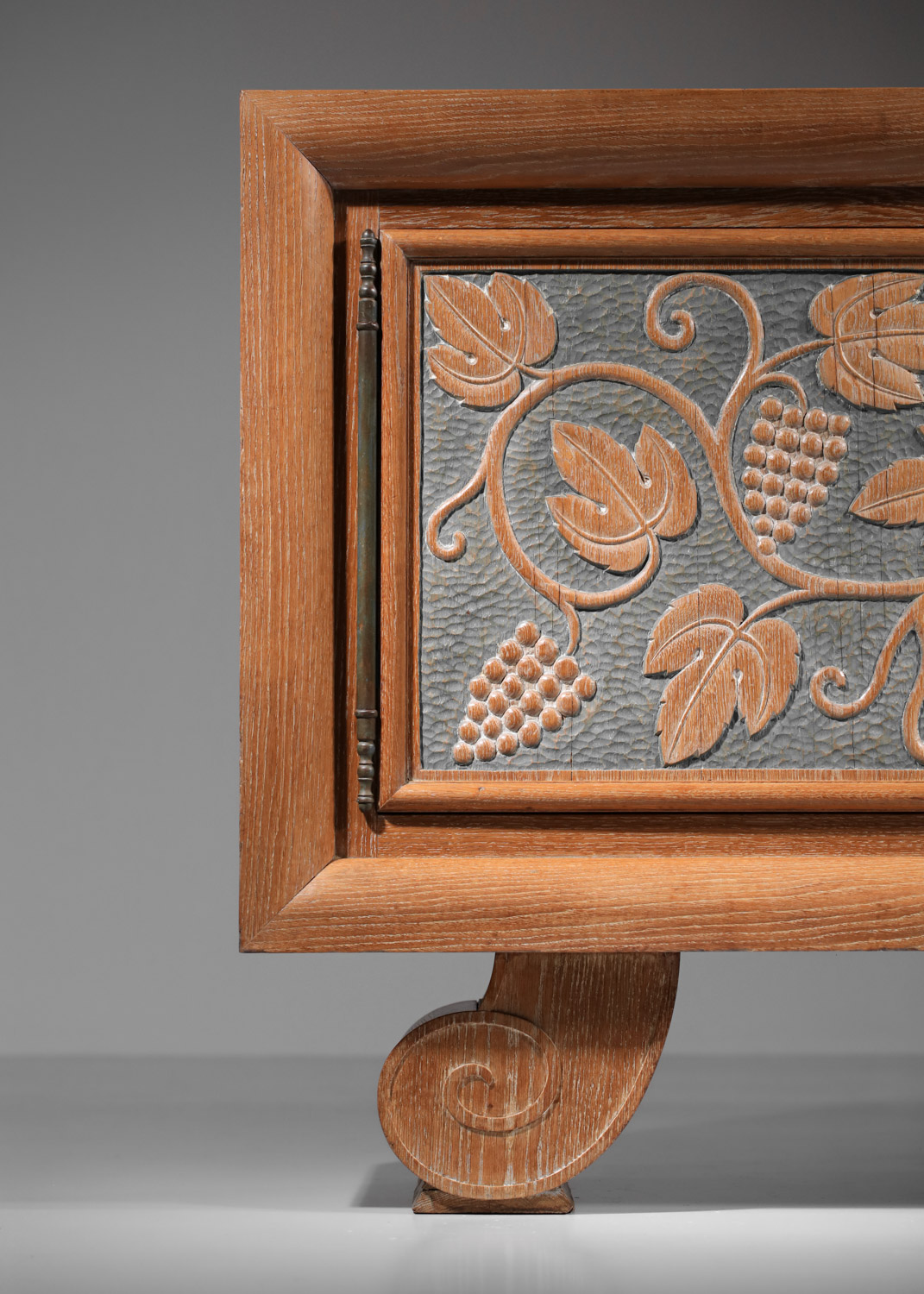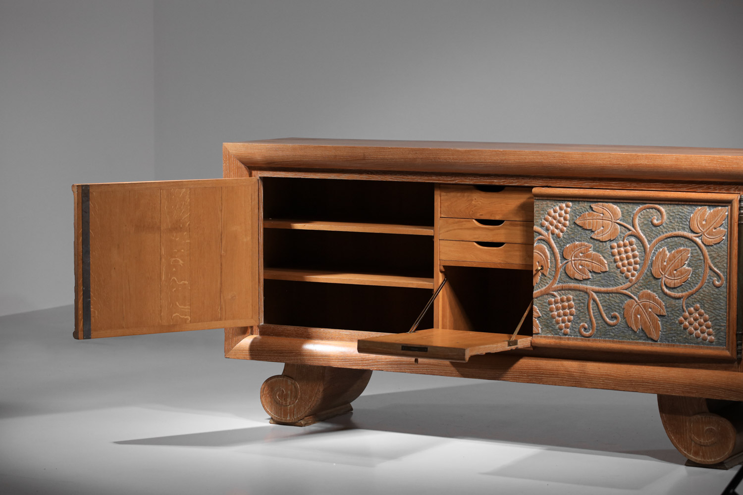Large French sideboard from the 1940s/1950s by René and Gilbert Schmitt in solid oak and veneer with a limed finish. Superb gouged decoration on the doors depicting grape clusters and vine leaves. Unique piece. Very good vintage condition, note three restorations to the veneer on the top, signs of age and use (see photos). The three keys are provided with the piece.
