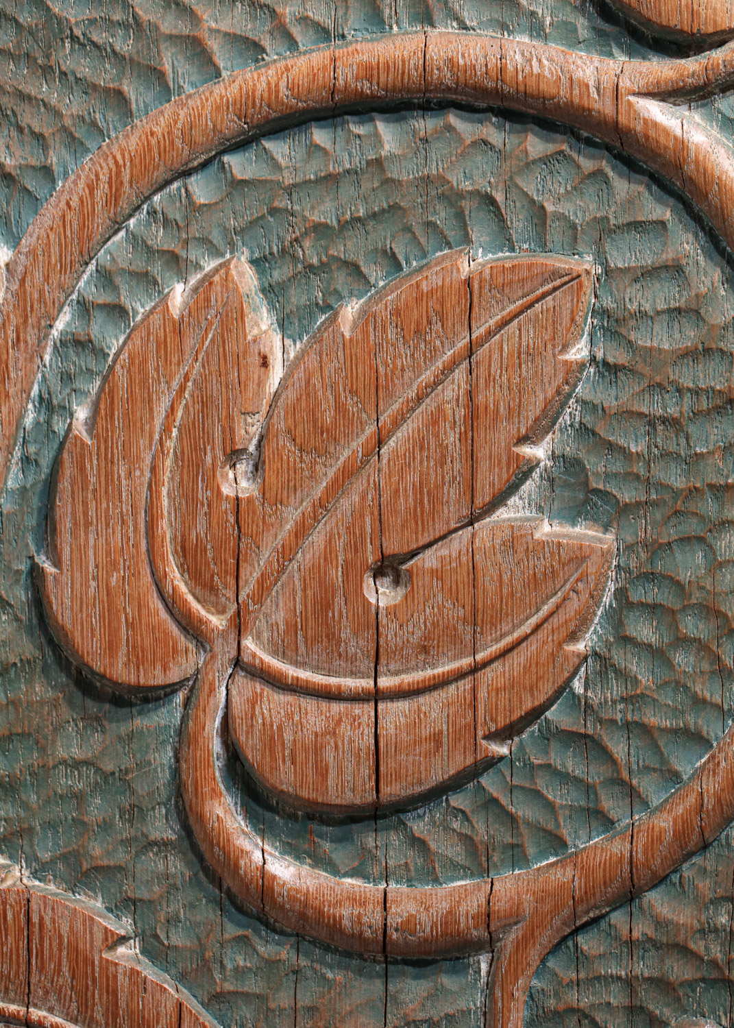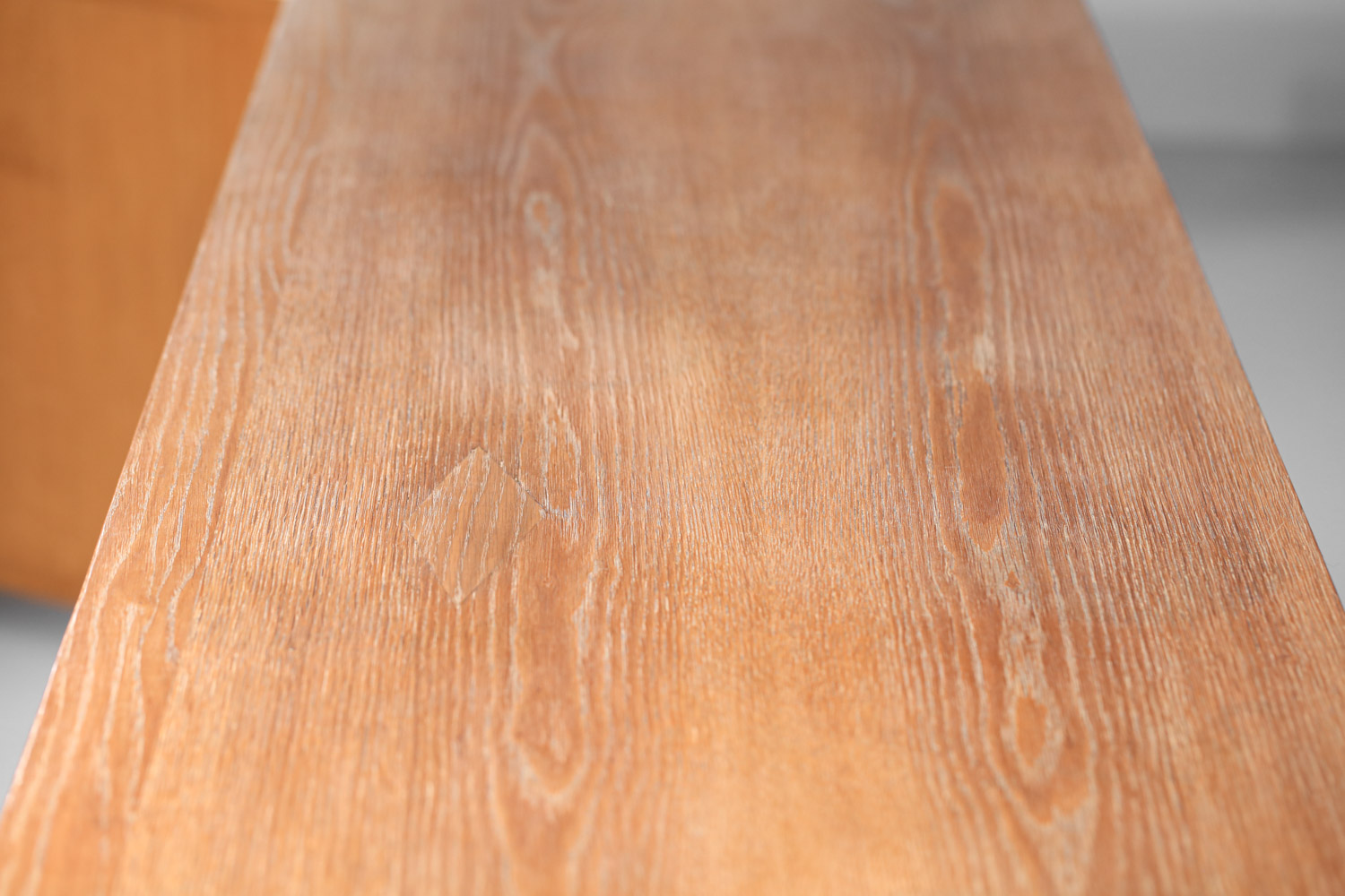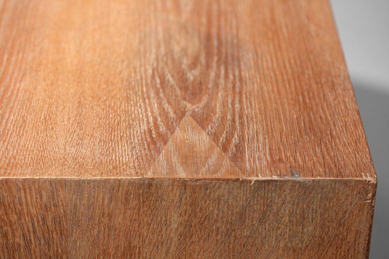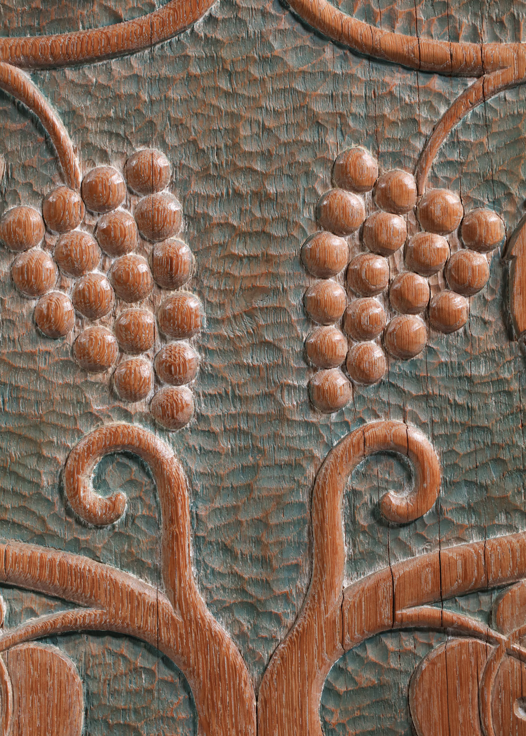 Large French sideboard from the 1940s/1950s by René and Gilbert Schmitt in solid oak and veneer with a limed finish. Superb gouged decoration on the doors depicting grape clusters and vine leaves. Unique piece. Very good vintage condition, note three restorations to the veneer on the top, signs of age and use (see photos). The three keys are provided with the piece.