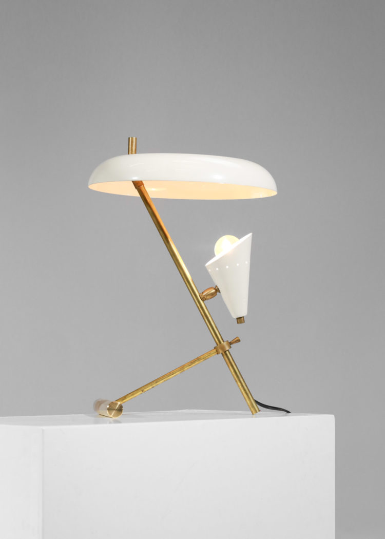 Modern Italian desk lamp “Dina” made in the style of the 60s. Solid brass structure and white openwork steel shade.