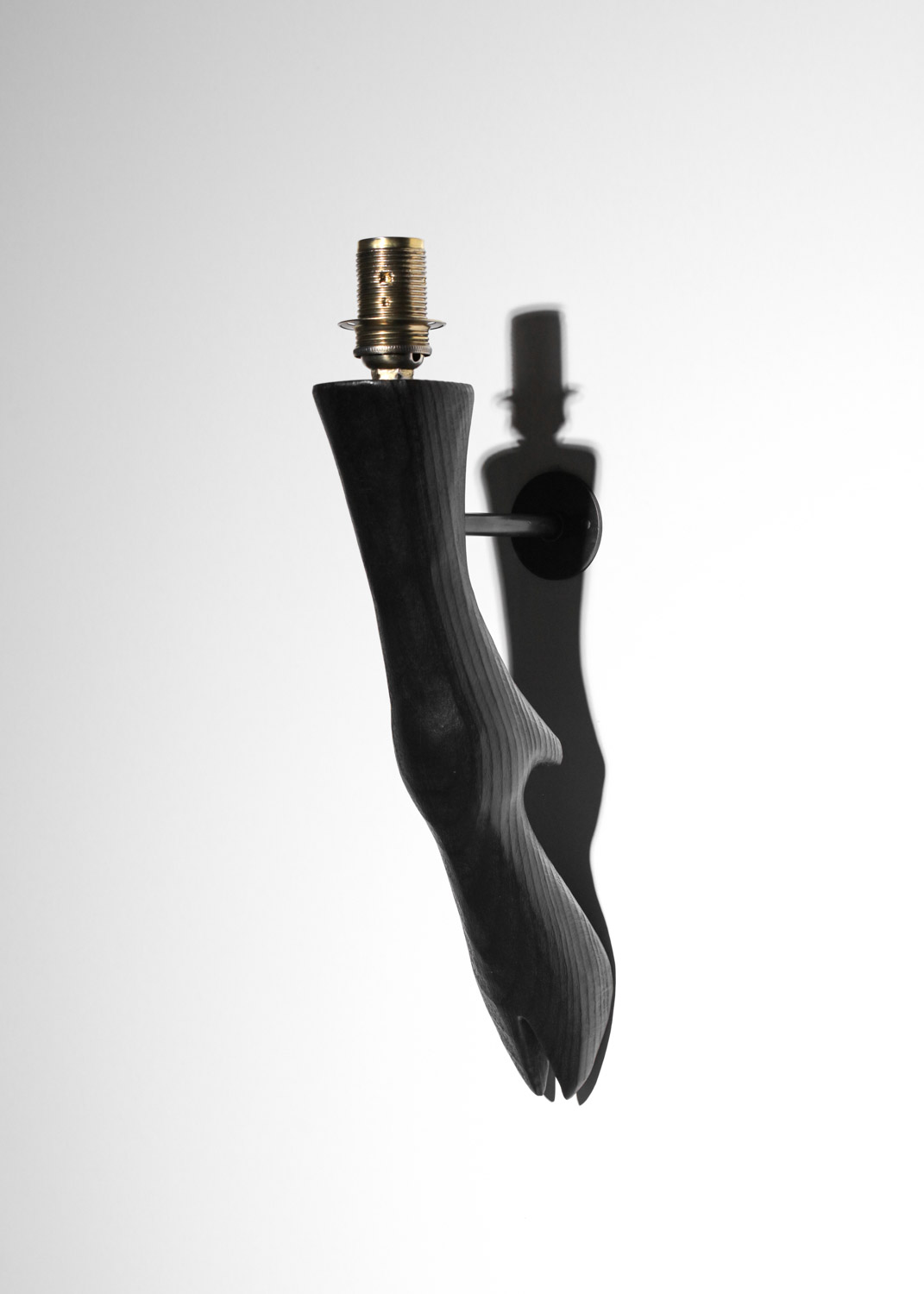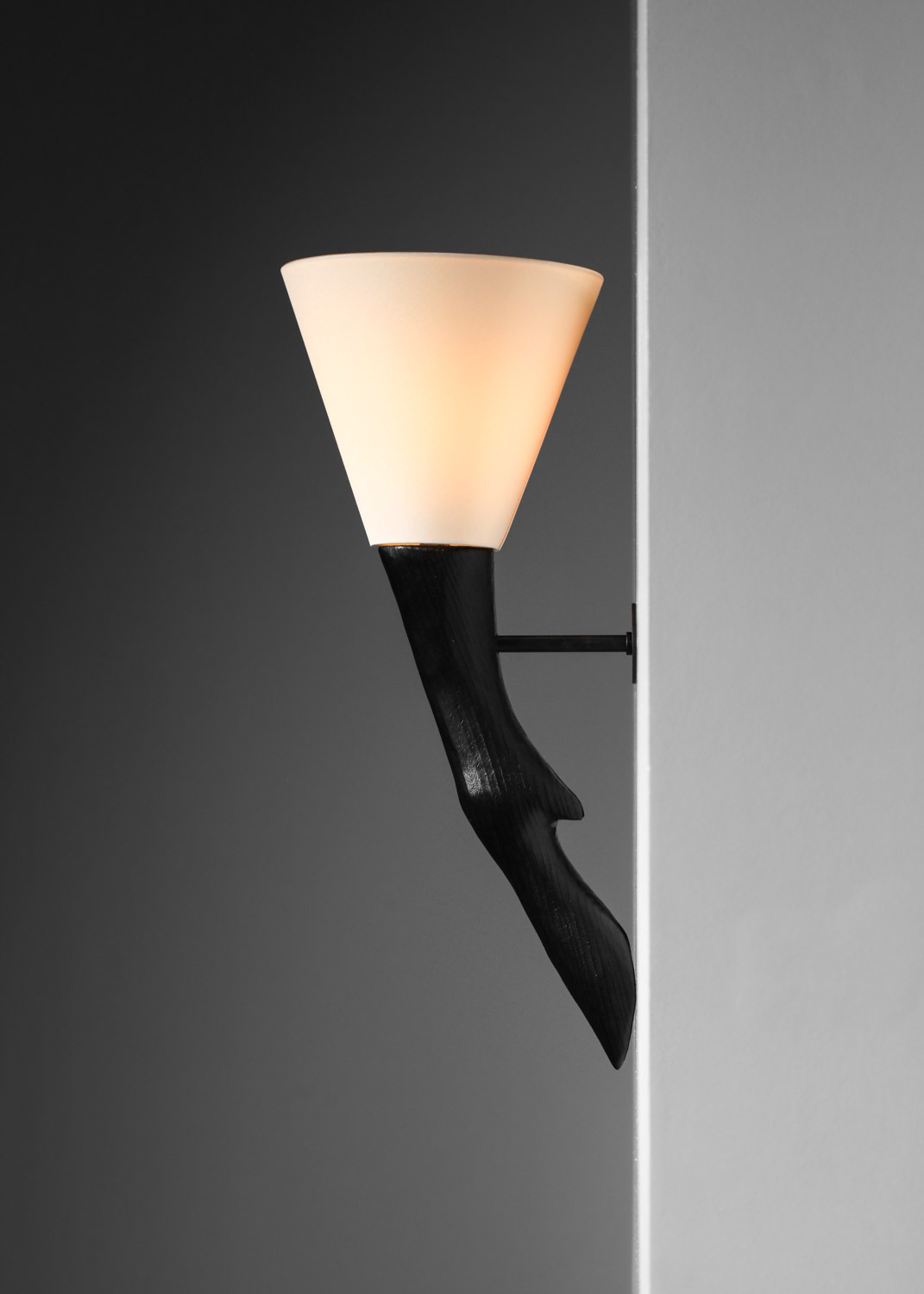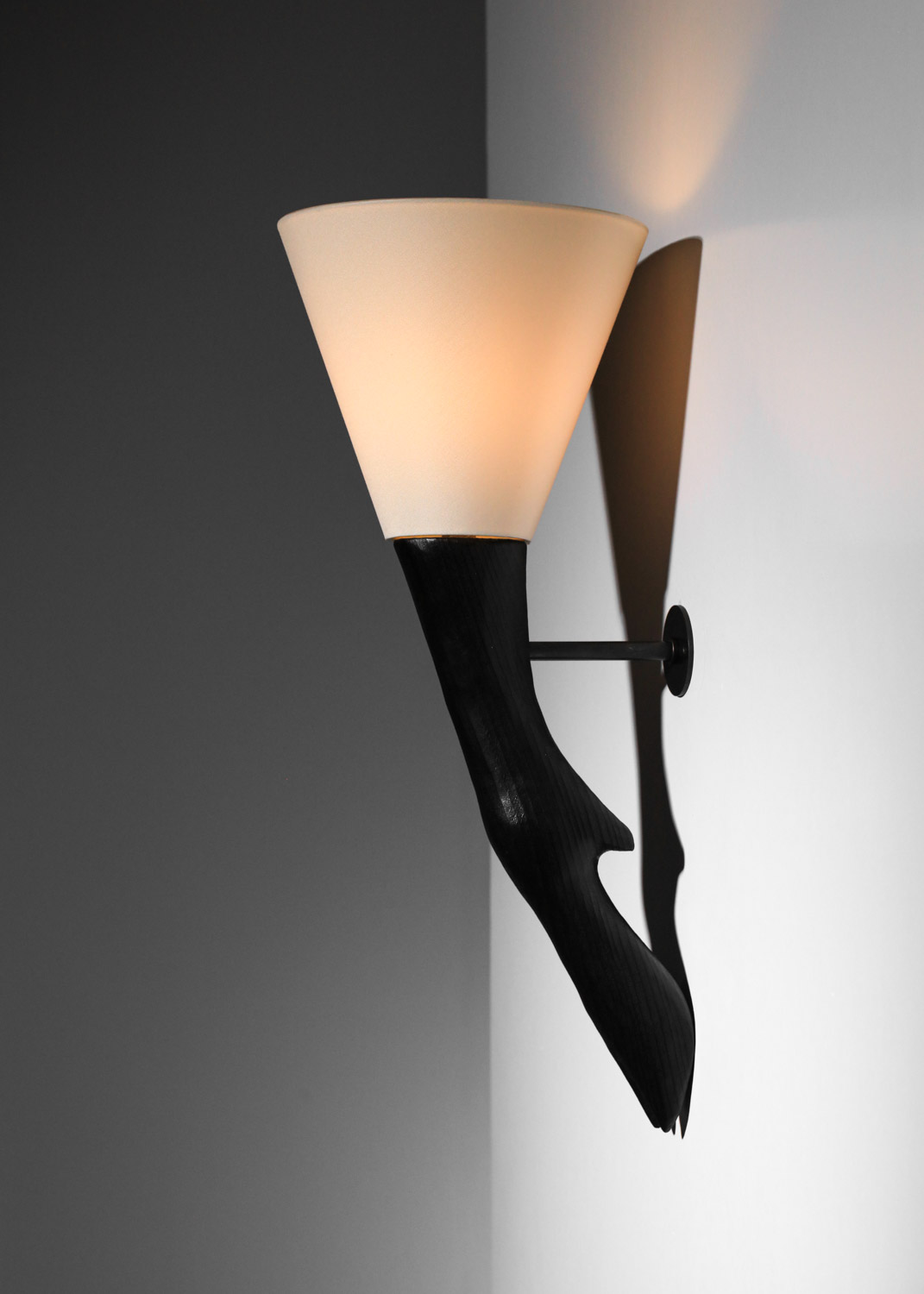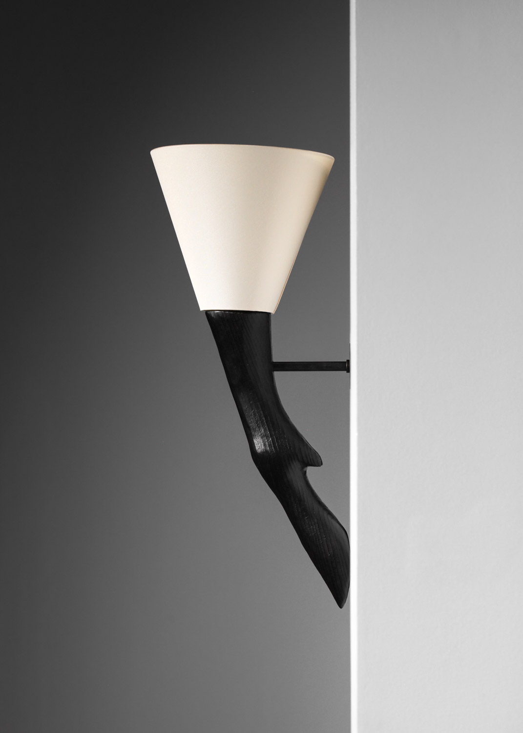 Danke galerie is pleased to present the new creation of the cabinetmaker Vincent Vincent in his workshop in Lyon. For the first time, Vincent Vincent offers you a wall lamp entirely made of solid wood reminiscent of a doe’s foot with a burnt wood finish, topped with a custom-made shade. Quantity and size on request, LED bulb type E14 recommended.
