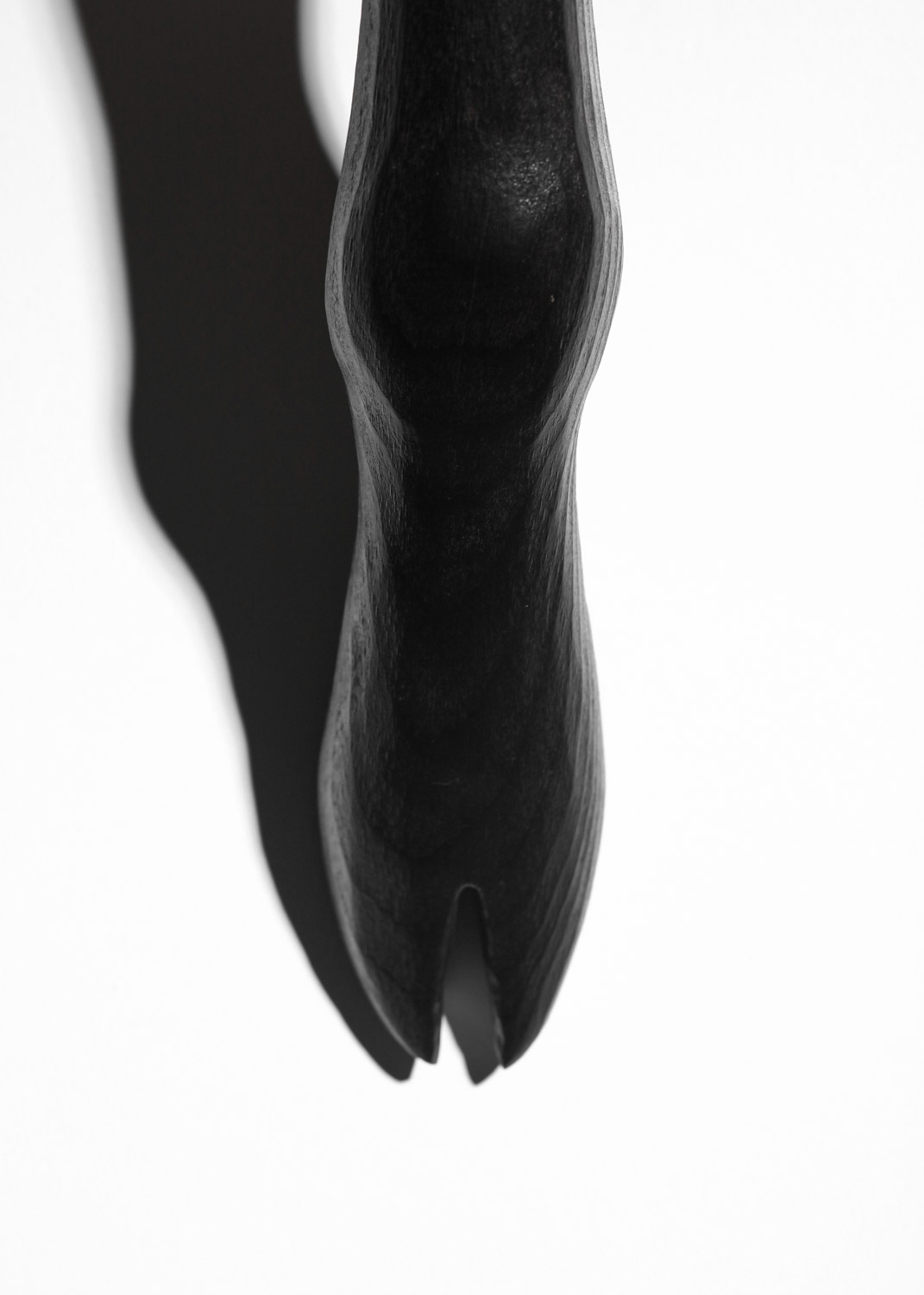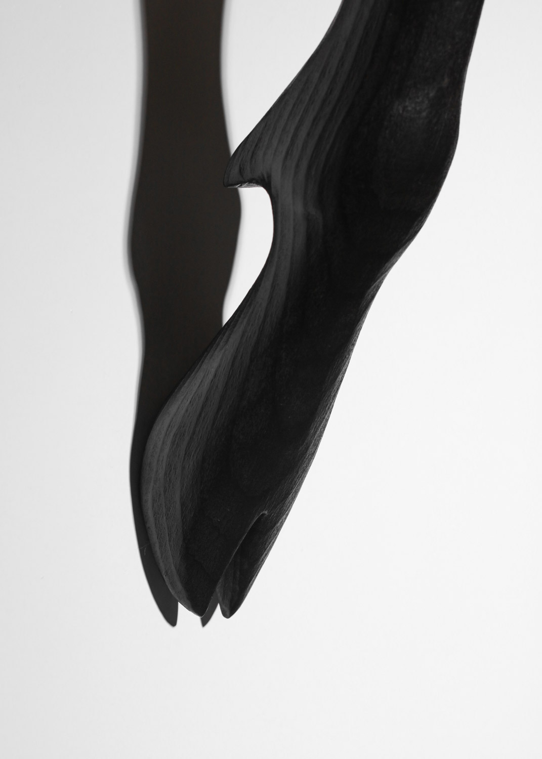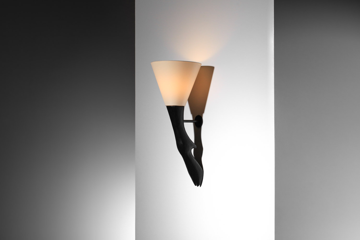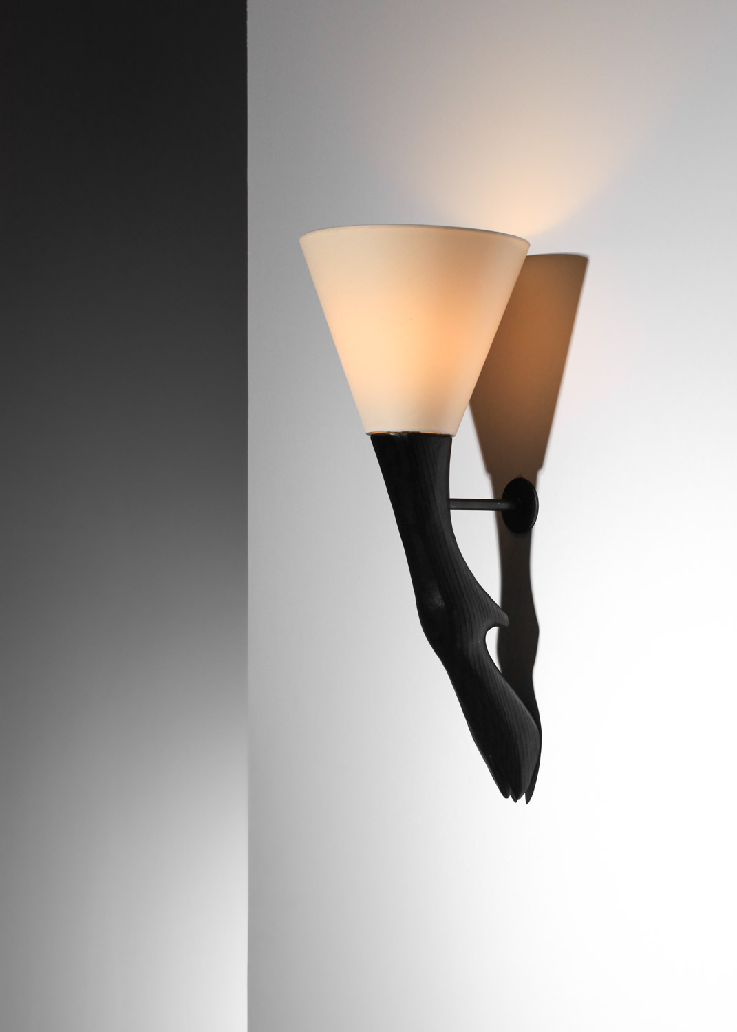 Danke galerie is pleased to present the new creation of the cabinetmaker Vincent Vincent in his workshop in Lyon. For the first time, Vincent Vincent offers you a wall lamp entirely made of solid wood reminiscent of a doe’s foot with a burnt wood finish, topped with a custom-made shade. Quantity and size on request, LED bulb type E14 recommended.