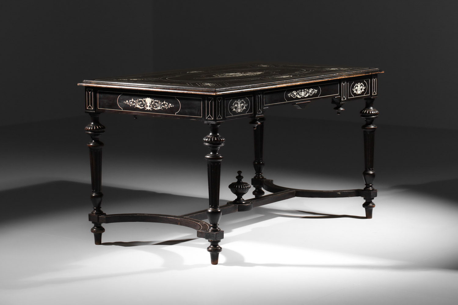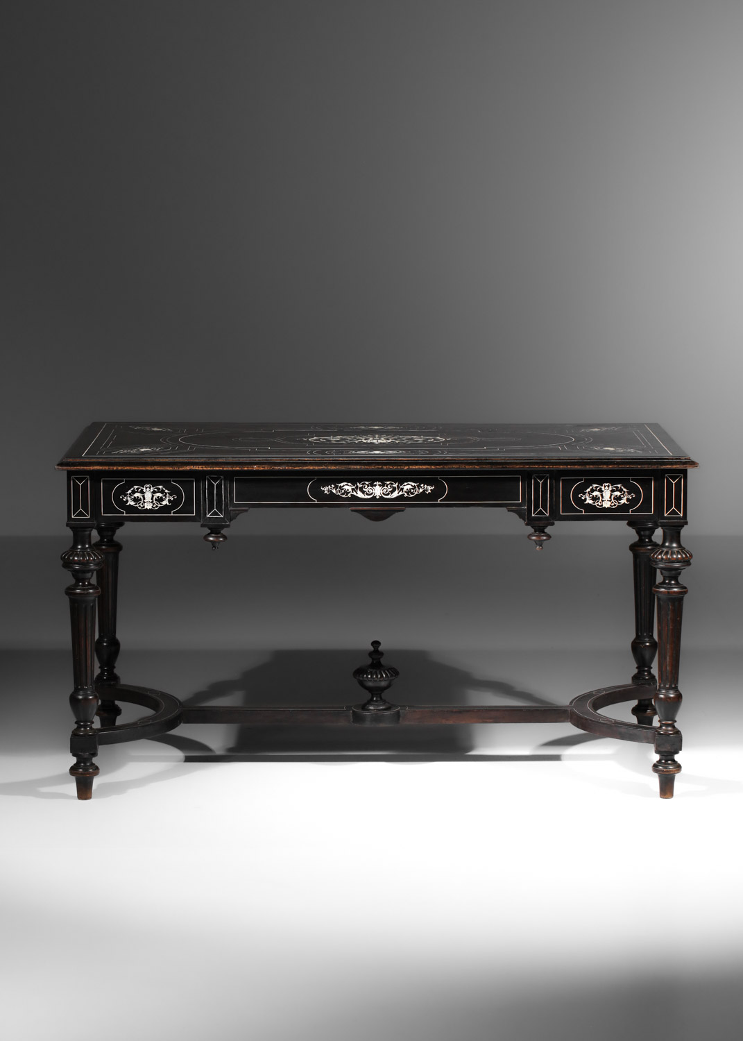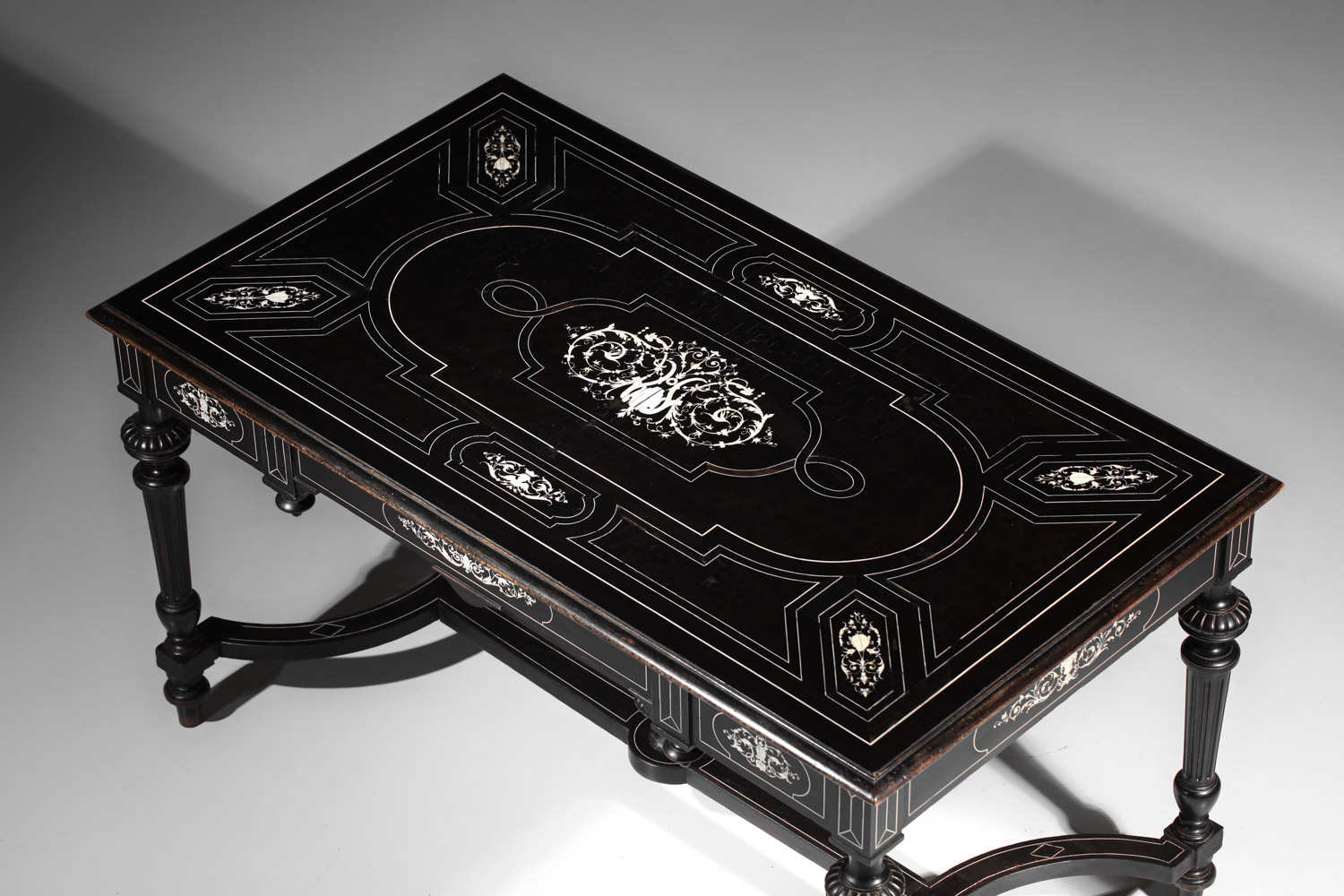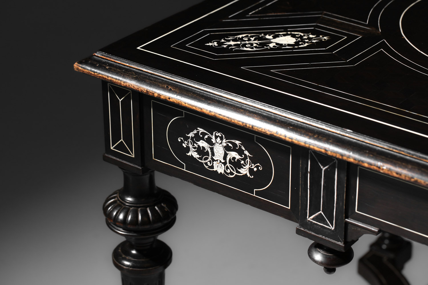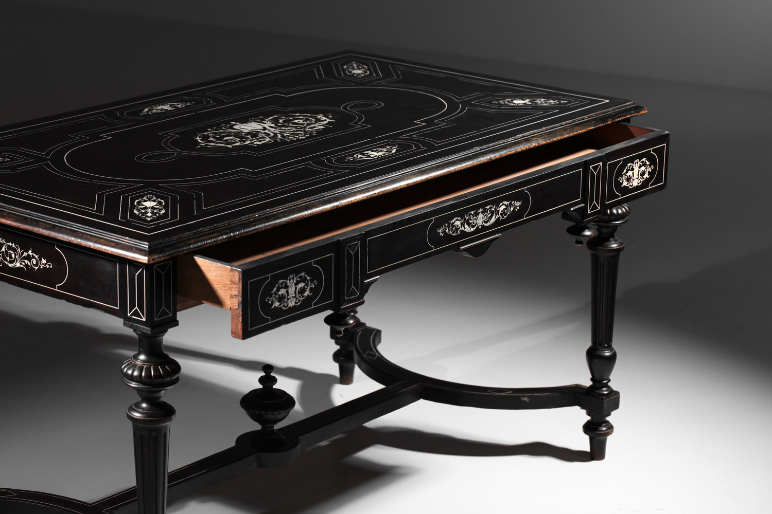 Large 19th-century Napoleon III desk. Blackened solid wood frame and diamond-shaped veneer for a 3D effect typical of the Napoleon III style. Beautiful bone marquetry work throughout the desk with baroque and geometric decoration (see photos). Good vintage condition, with numerous signs of age and use: veneer chips, numerous restorations, scratches, etc.