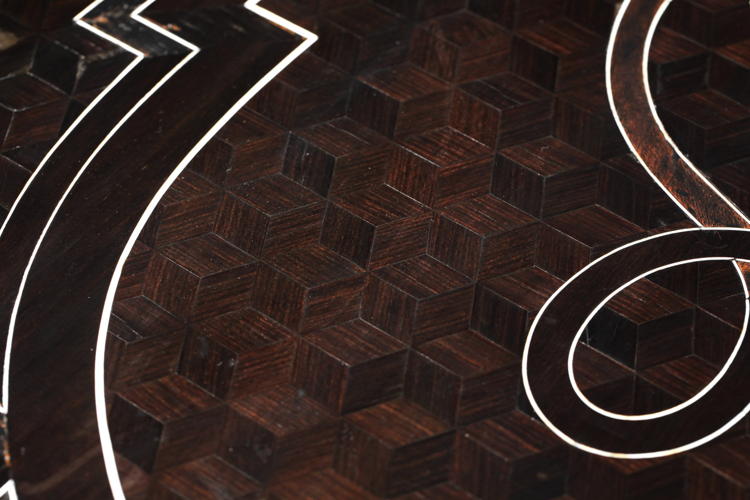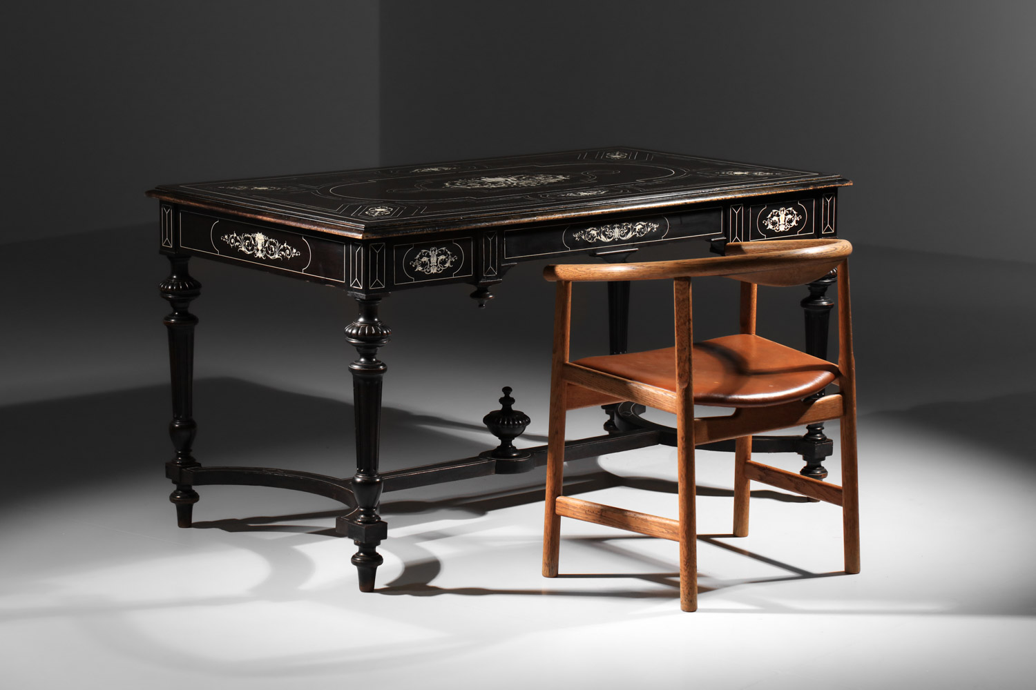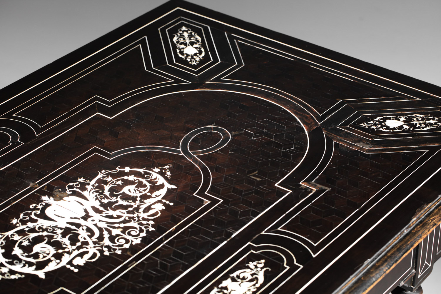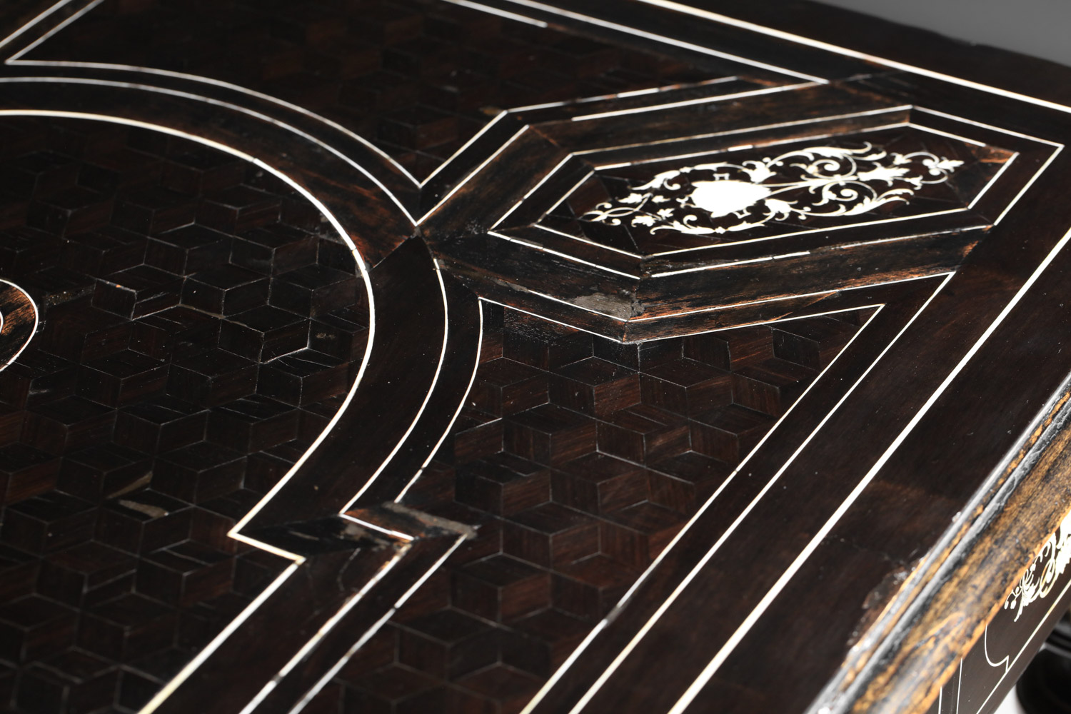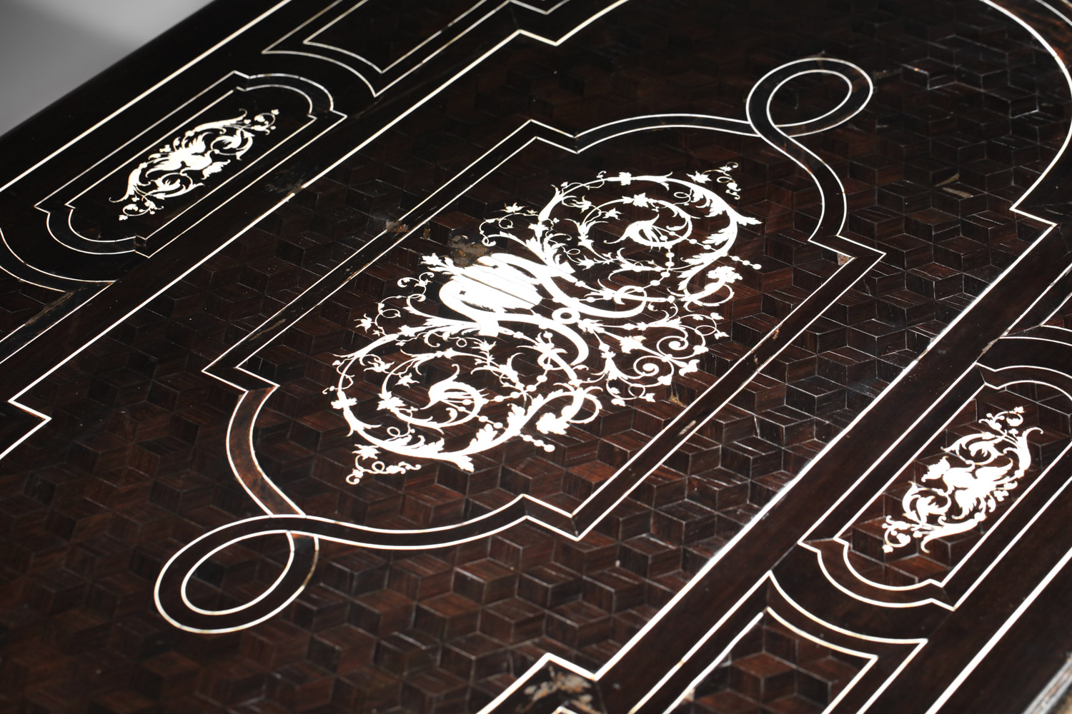 Large 19th-century Napoleon III desk. Blackened solid wood frame and diamond-shaped veneer for a 3D effect typical of the Napoleon III style. Beautiful bone marquetry work throughout the desk with baroque and geometric decoration (see photos). Good vintage condition, with numerous signs of age and use: veneer chips, numerous restorations, scratches, etc.
