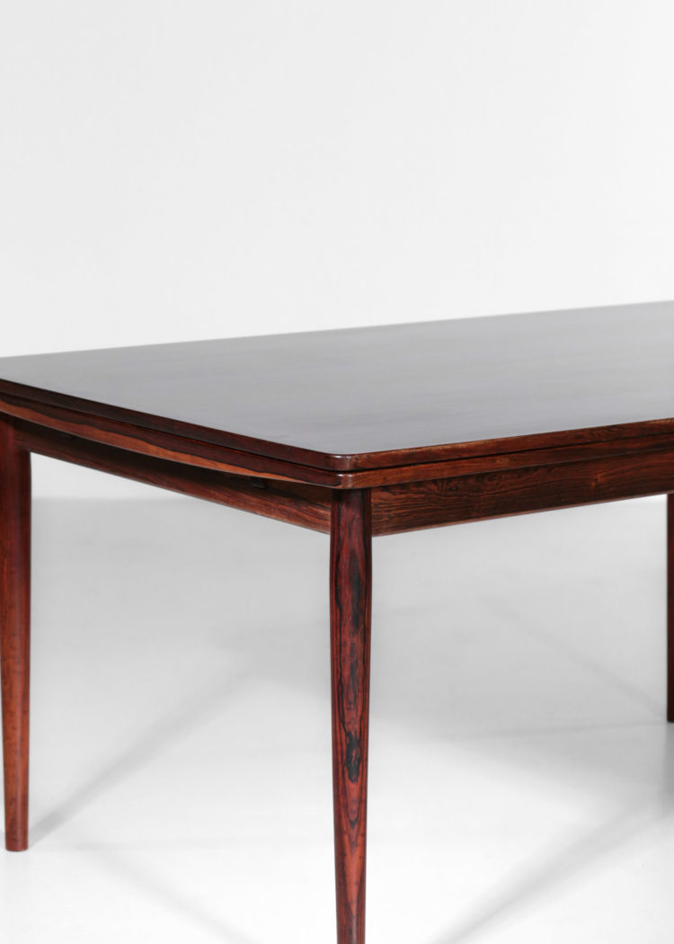 Large Scandinavian dining table from the 60’s designed by the Danish designer Arne Vodder for Sibast. Structure in solid Rio rosewood and veneer, with a beautiful flame grain. The table has 2 extensions at the end to double the surface of the table top. High quality work, all in sobriety in the image of the great Scandinavian designers.