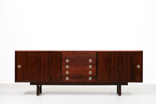 Pair of modernist French cabinets from the ’40s. Structure in solid and veneered mahogany, handles and lock in nickel-plated brass. The cabinets feature two sliding curtains opening onto a series of shelves and two central drawers. Sober, elegant design. Beautiful vintage condition, with traces of time and use on both cabinets (nicks, small scratches etc etc), very nice patina of time on the wood (see photos).