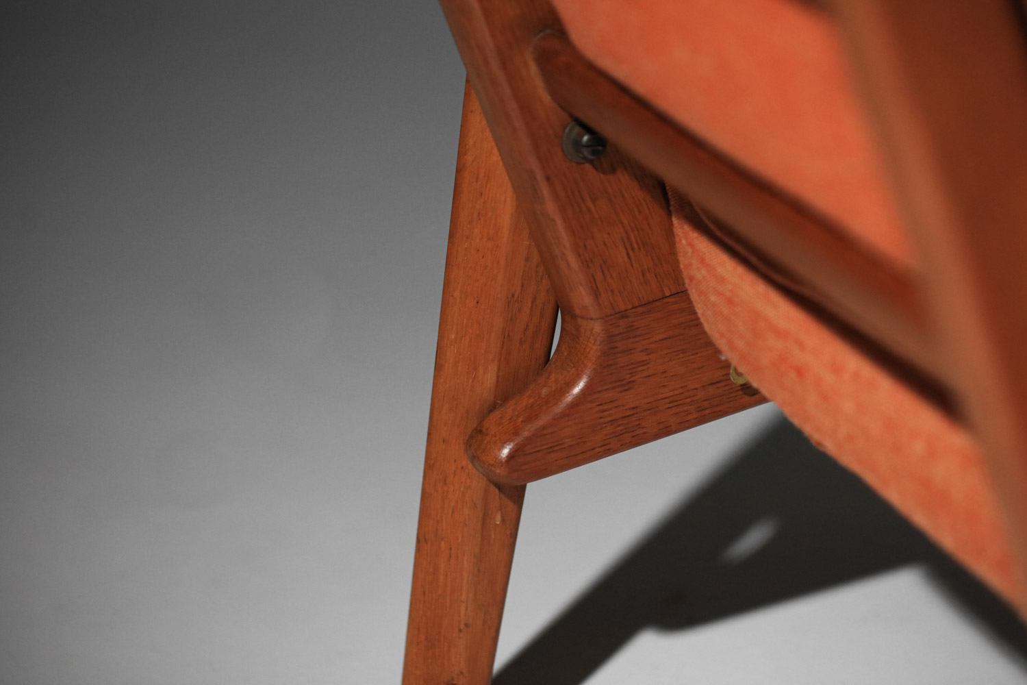 Pair of 50’s fauteuils chauffeuses by the Perreau brothers in the style of Guariche’s “Free span” armchairs. Solid oak frame, orange cushions and spring system on original seats. Very fine vintage condition, with slight traces of age and use (see photos).