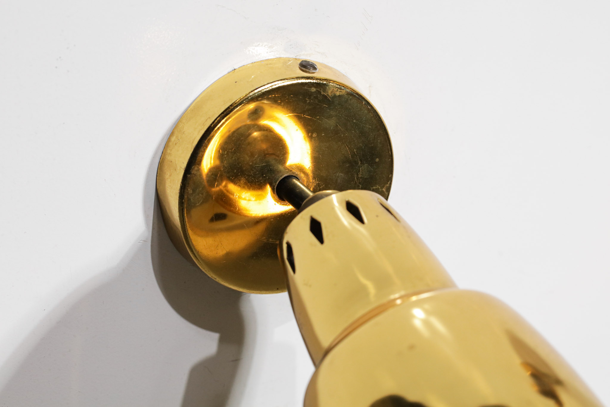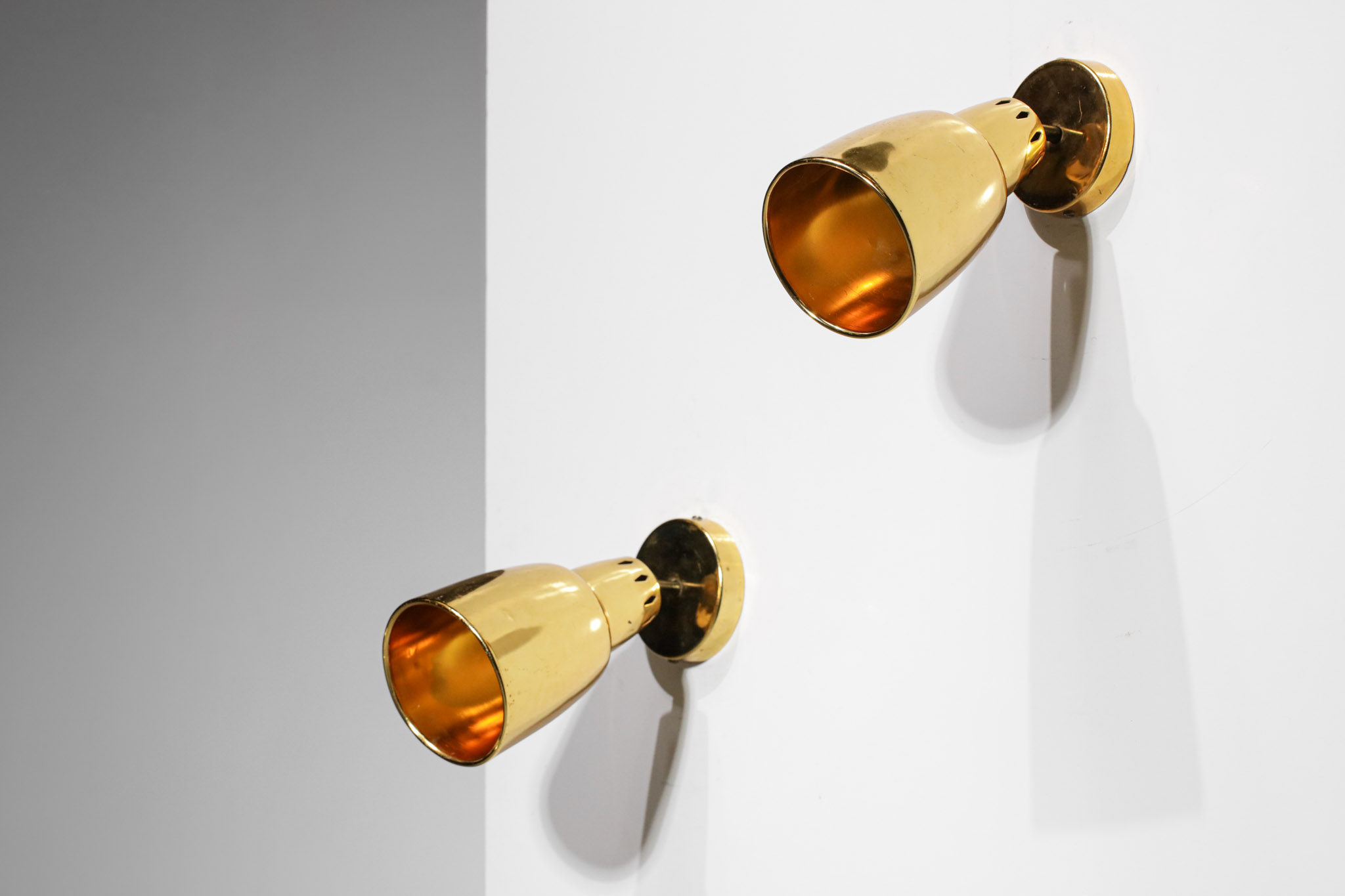 Pair of wall sconces from the 60’s edited by Parscot. Wall plate and perforated lampshade in gold anodized aluminum, arm in black metal. Ball joint allowing to orientate the lampshade in different positions. Very nice vintage condition, recommended LED bulb type E27 (see pictures).