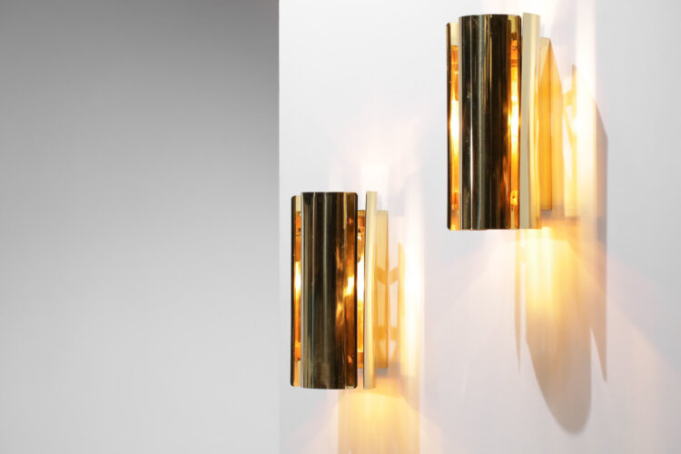 Pair of Scandinavian sconces in the style of Hans Arne Jakobsson’s work edited in the 80s. Structure and lampshade in solid brass, to note traces of use and time on the two sconces: small scratches (see photos). Recommended LED bulbs type E27.