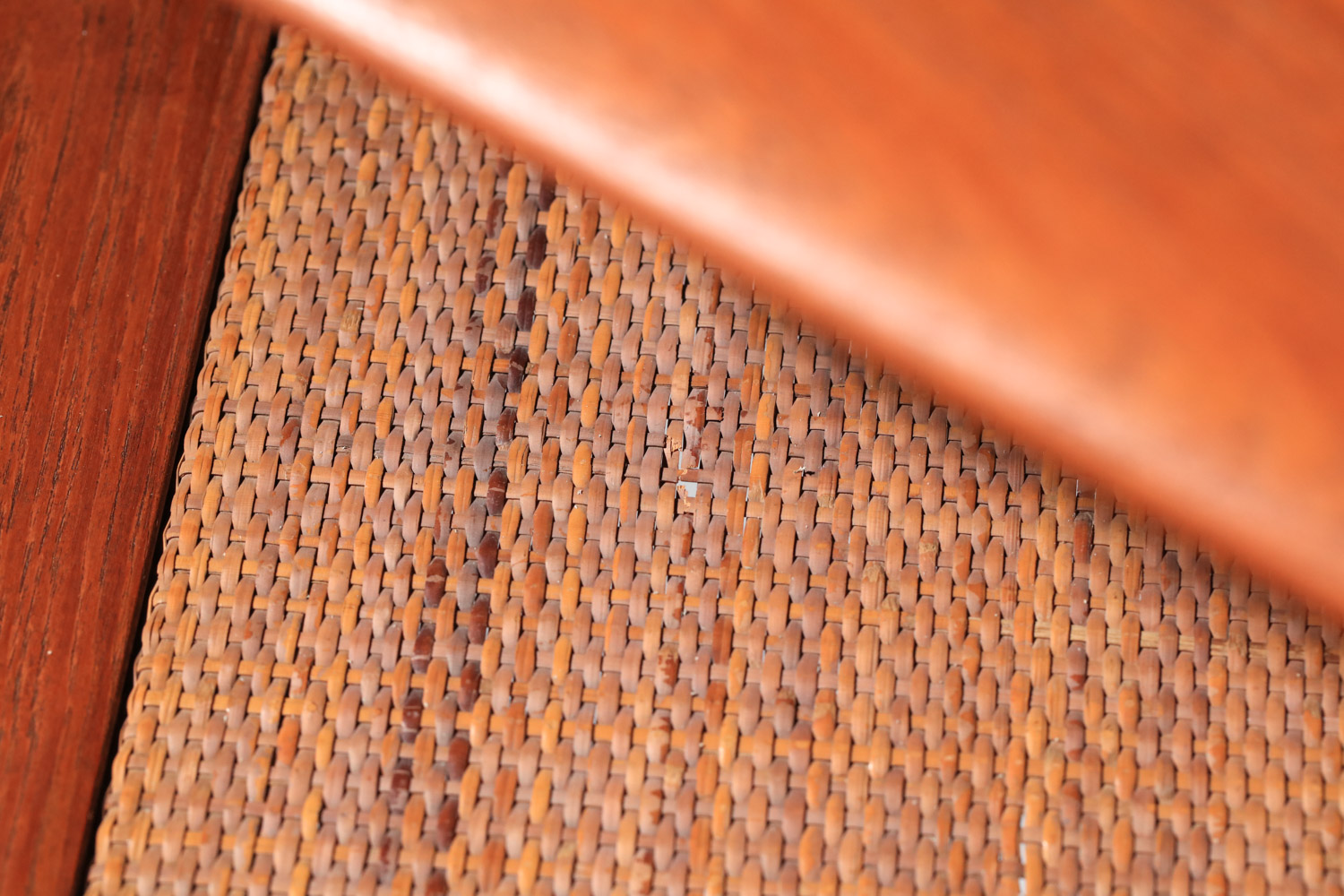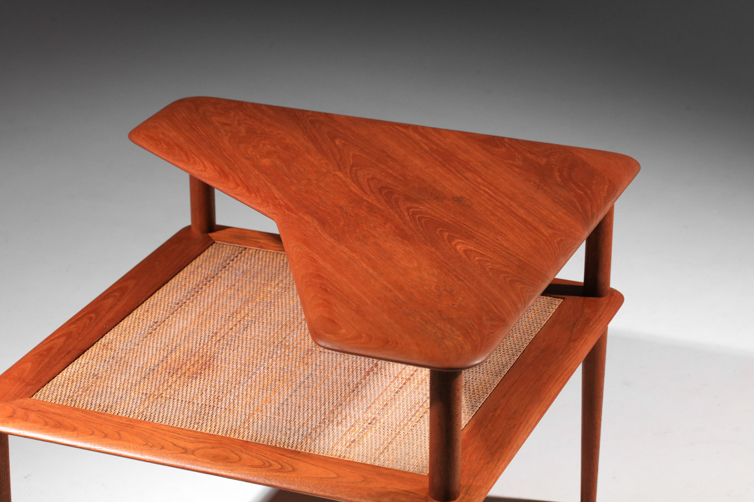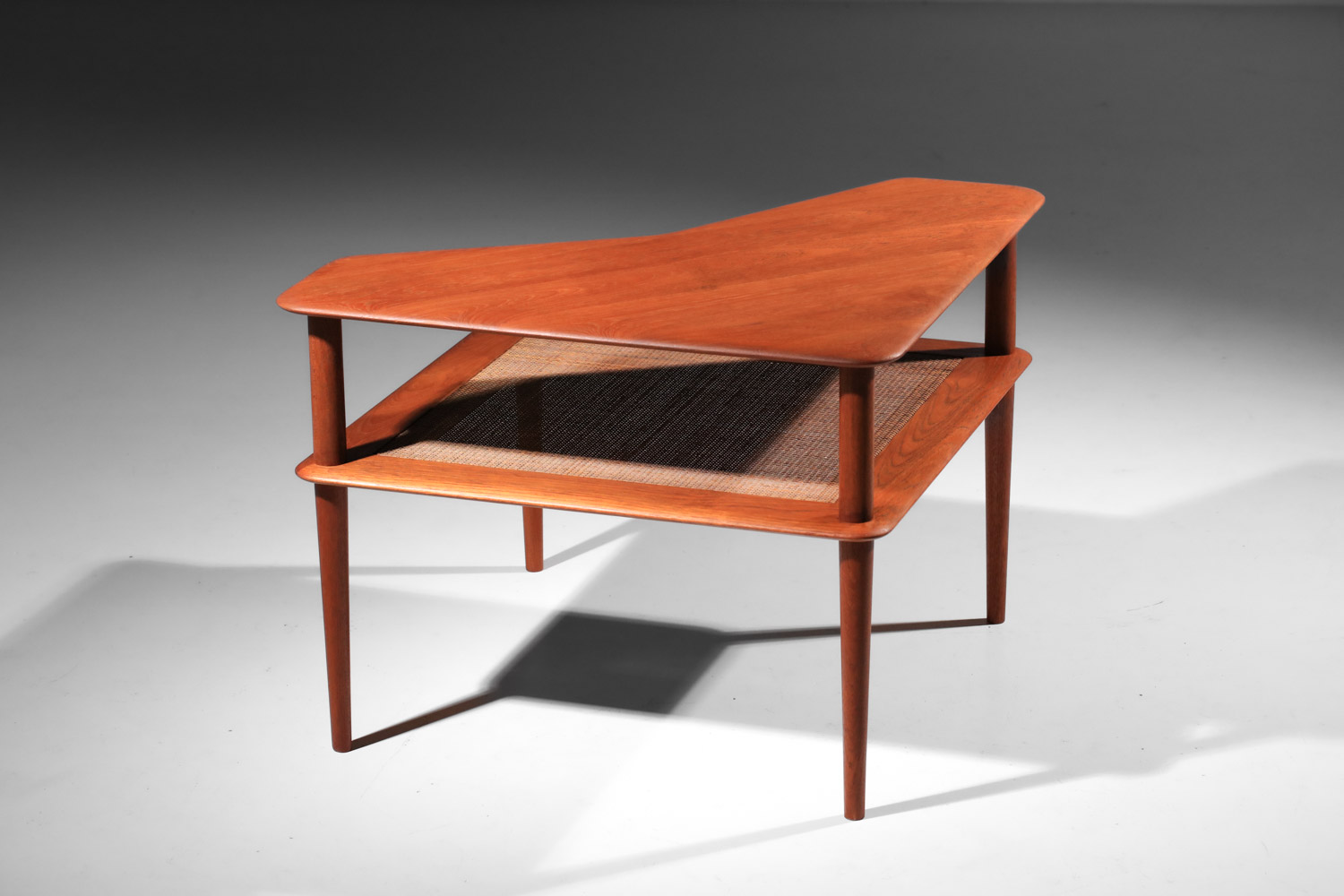 Scandinavian coffee table by the Danish design duo Peter Hvidt and Orla Mølgaard, dating from the 1960s. Solid teak frame and top, original caned lower shelf. Simple and original design. In very good vintage condition, with a beautiful patina on the teak. Signs of age and use are mainly visible on the lower shelf: a small chip in the caning and some wear to the varnish (see photos).