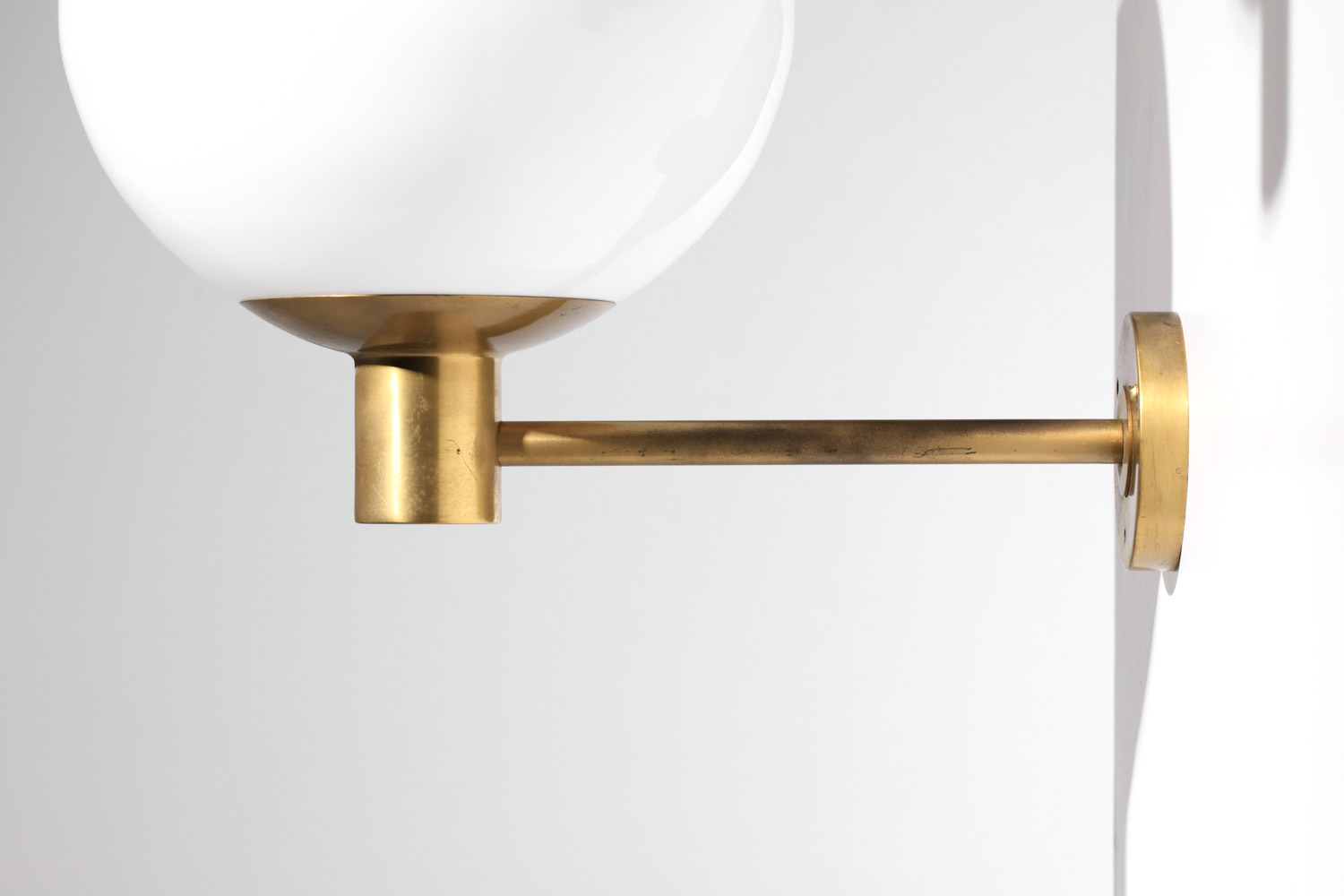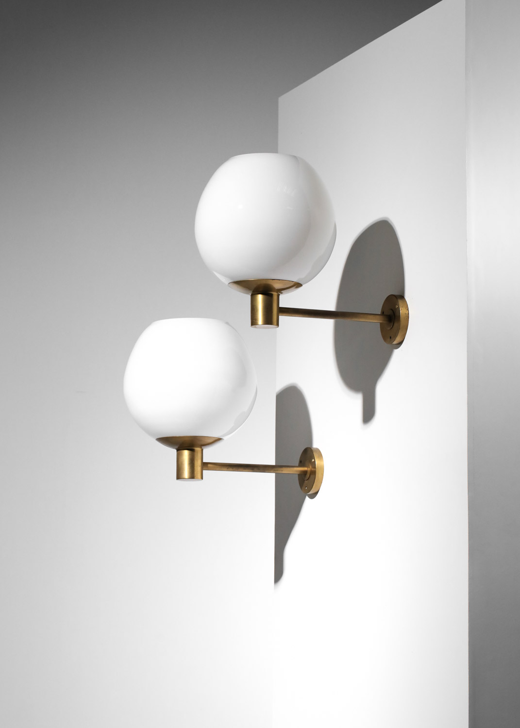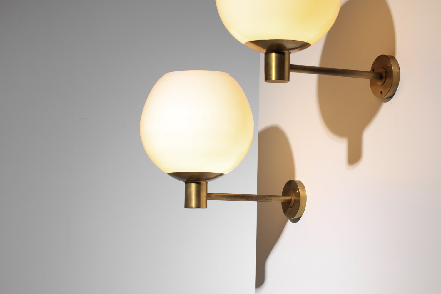 Set of four large Italian wall sconces from the 1960s. Solid brass frame and glossy white opaline glass shades. Very good vintage condition, with some slight signs of age and use, mainly on the brass (see photos). We recommend one E27 LED bulb per sconce.
