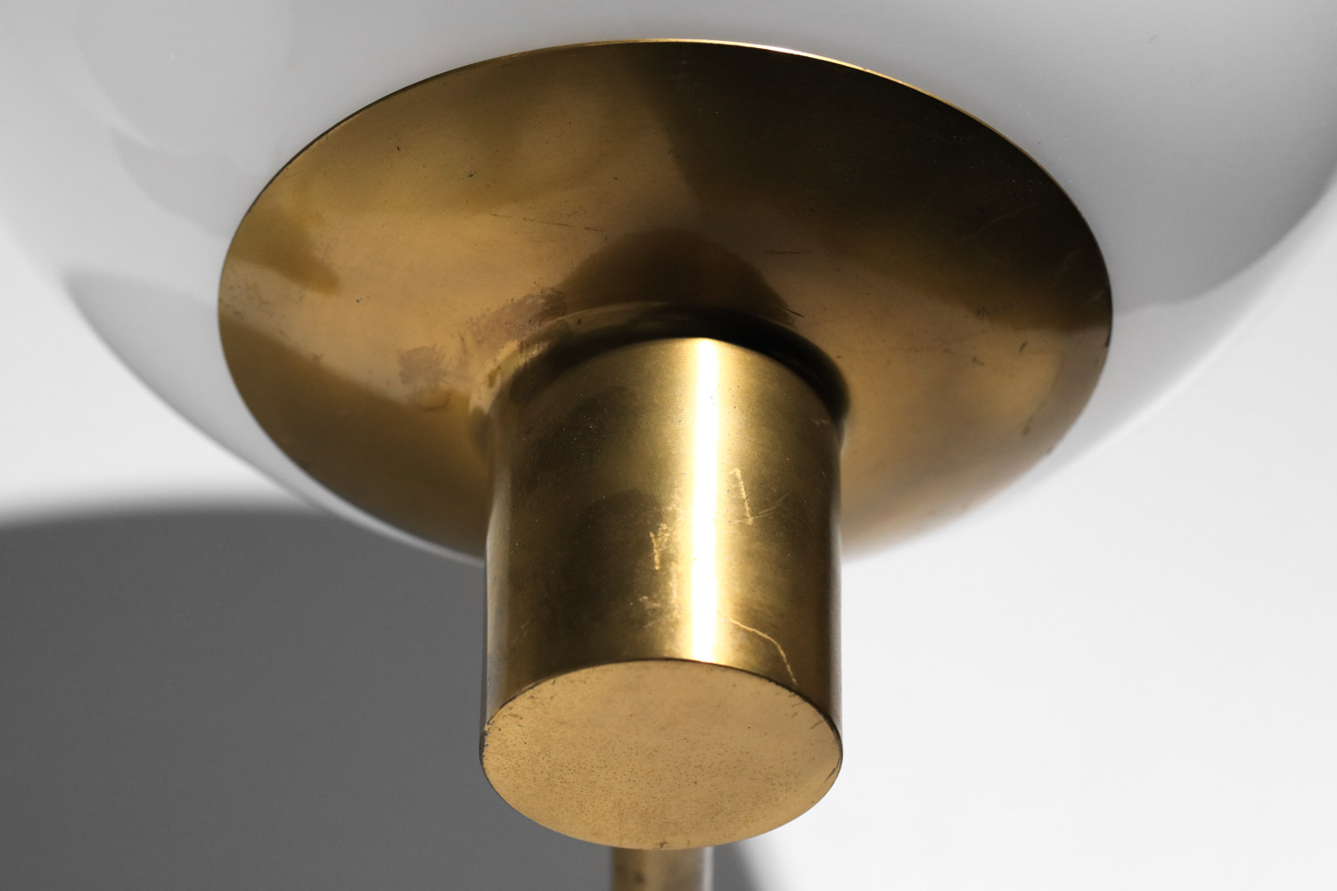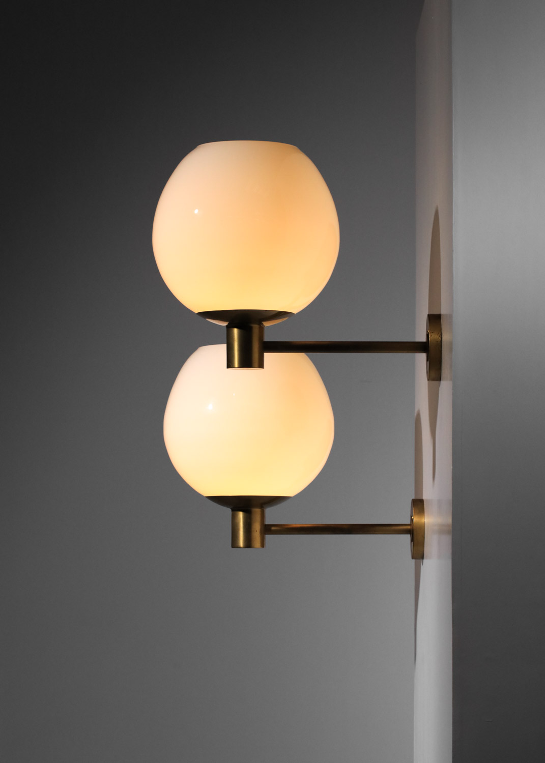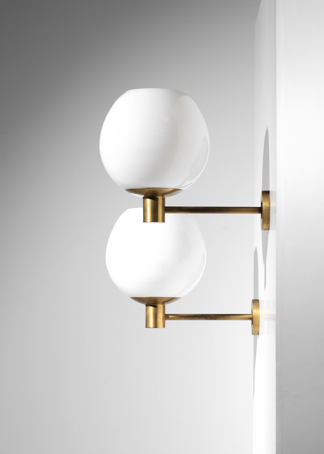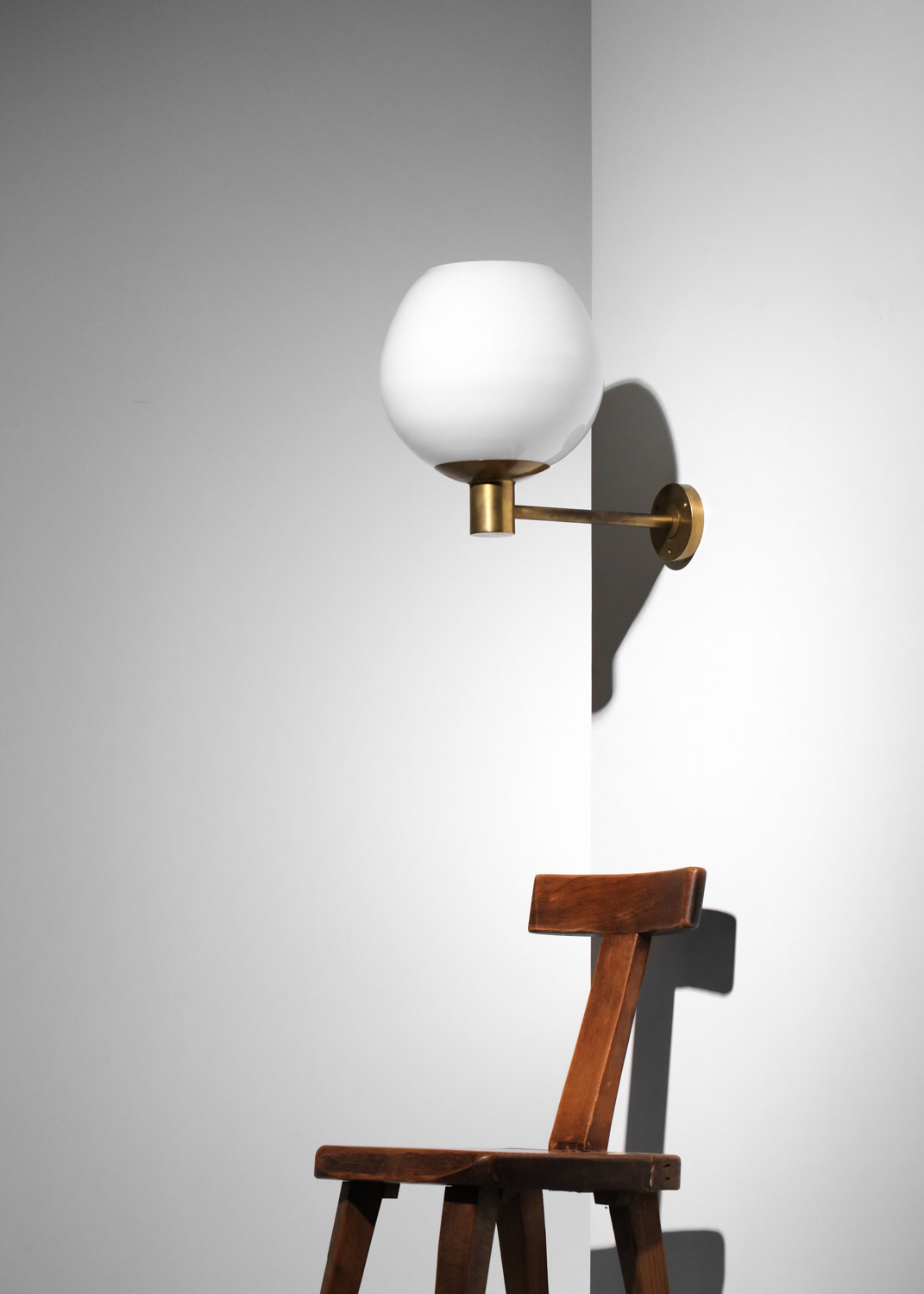 Set of four large Italian wall sconces from the 1960s. Solid brass frame and glossy white opaline glass shades. Very good vintage condition, with some slight signs of age and use, mainly on the brass (see photos). We recommend one E27 LED bulb per sconce.