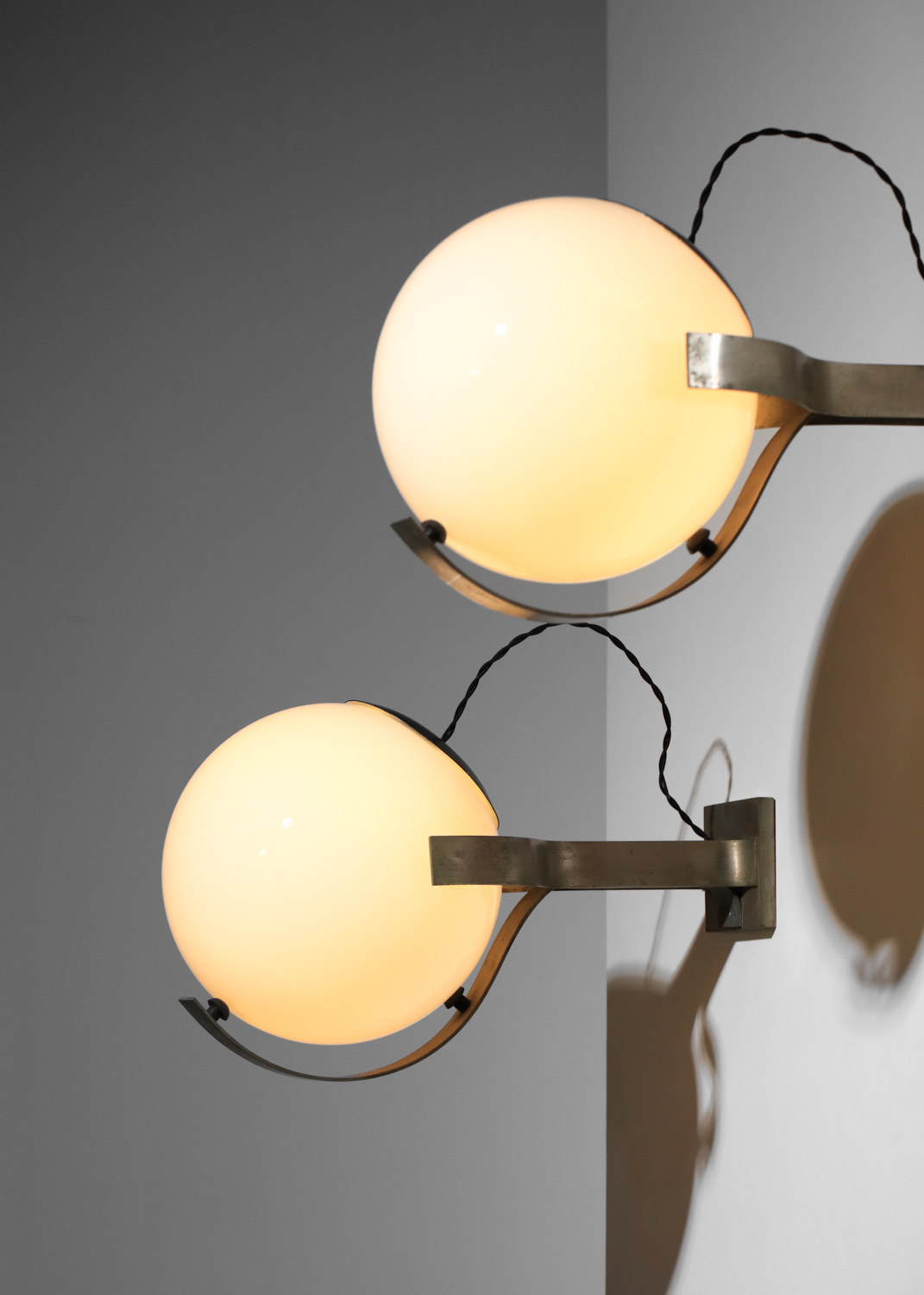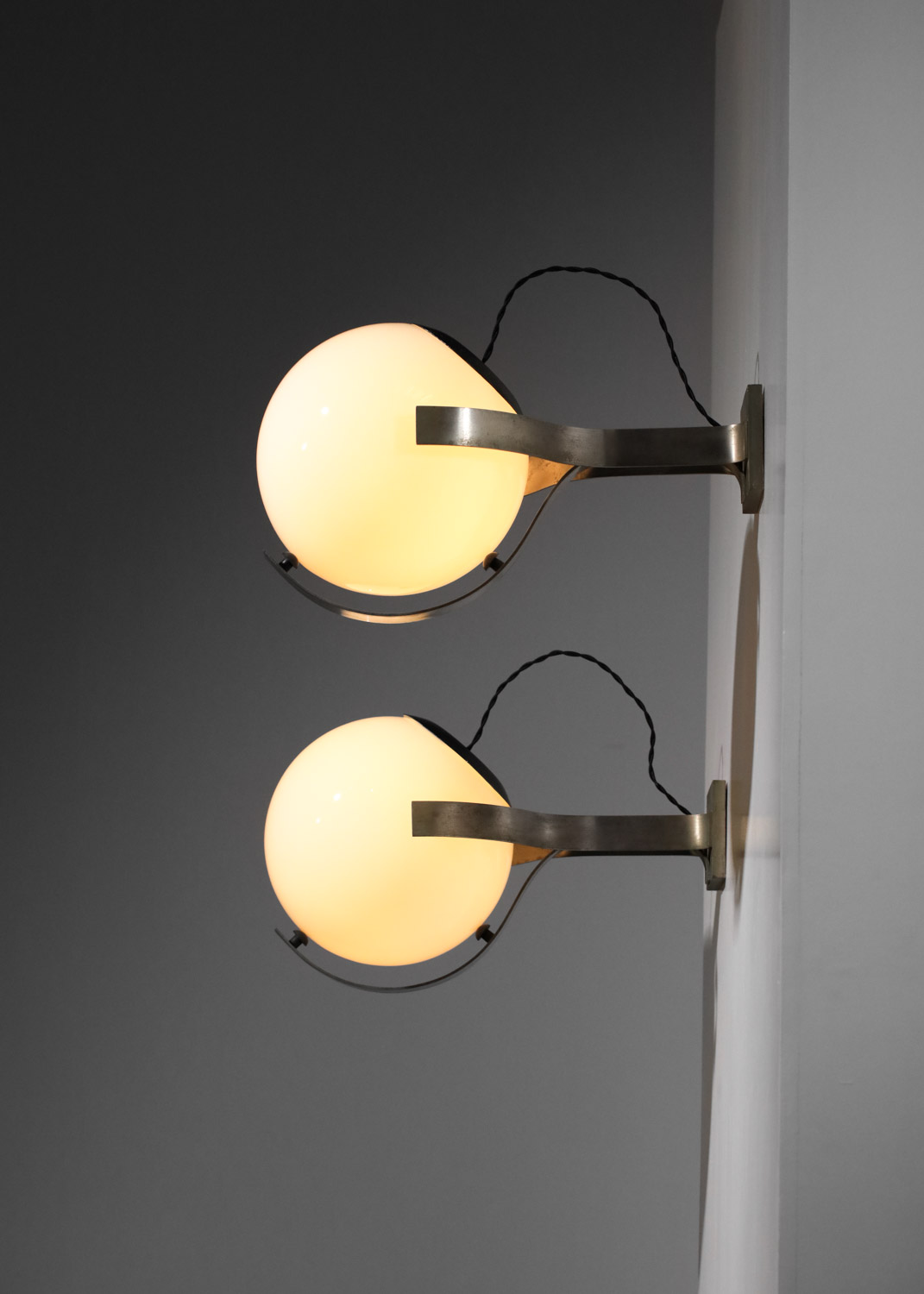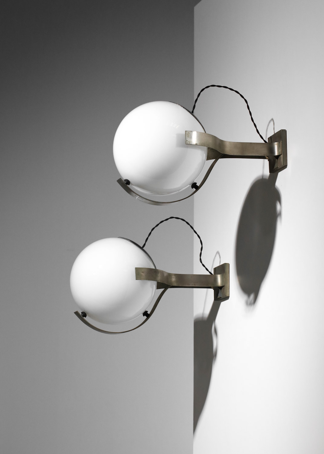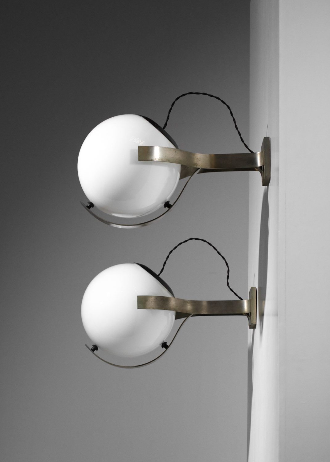 Set of three large Italian wall sconces from the 1960s. Nickel-plated brass frames and white opaline glass shades. Very good vintage condition, with some signs of age and use on the brass (see photos). We recommend one E27 LED bulb per sconce.