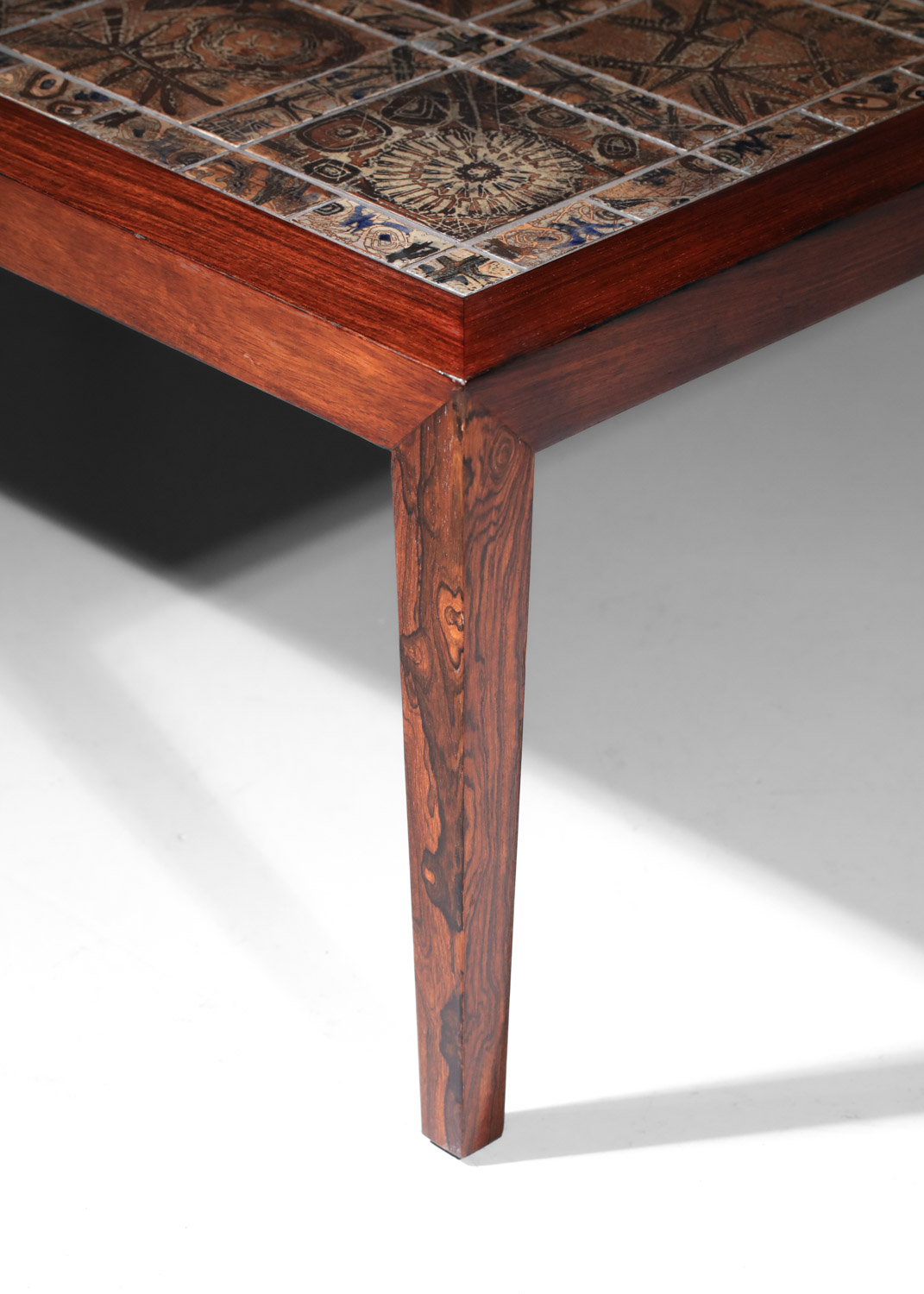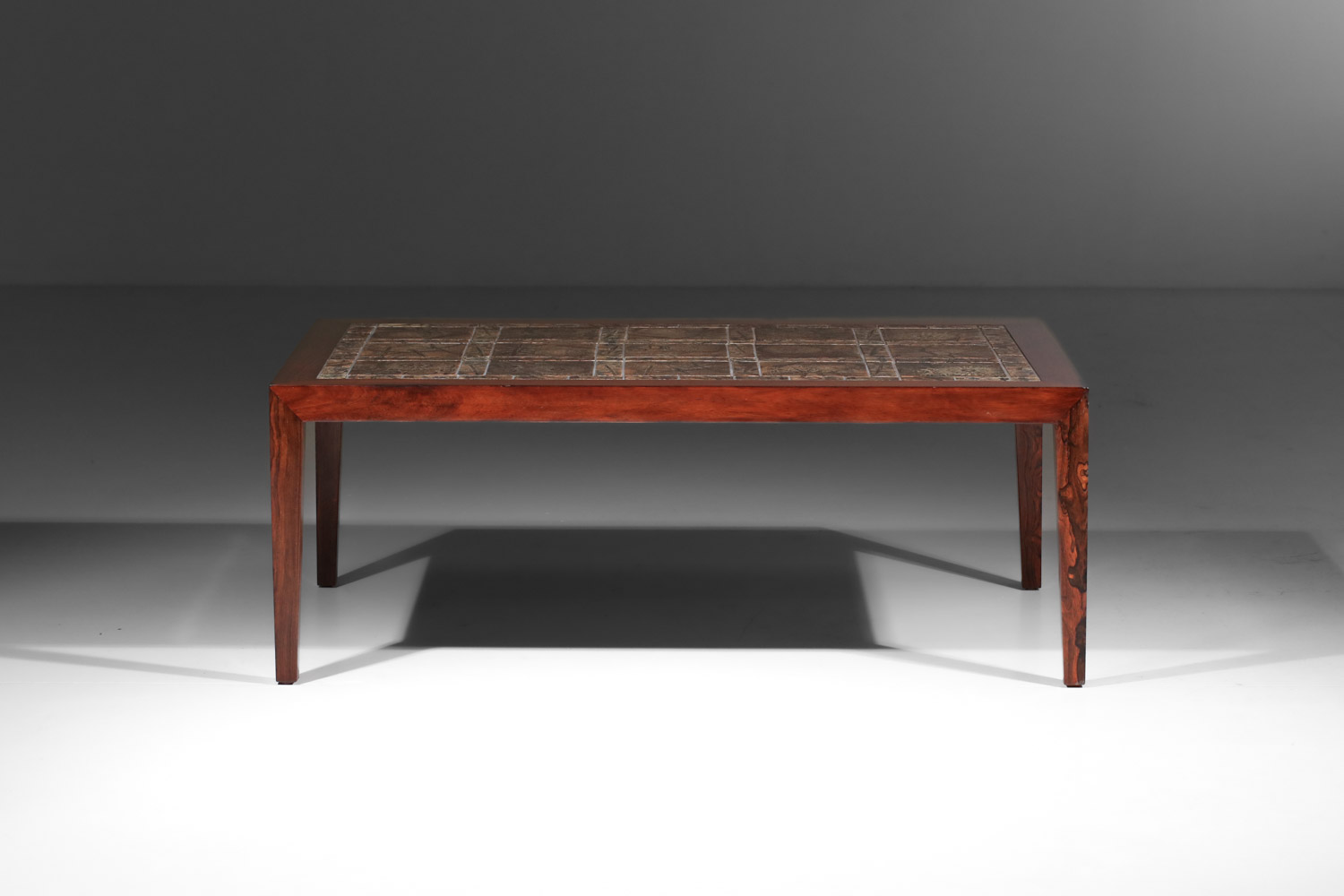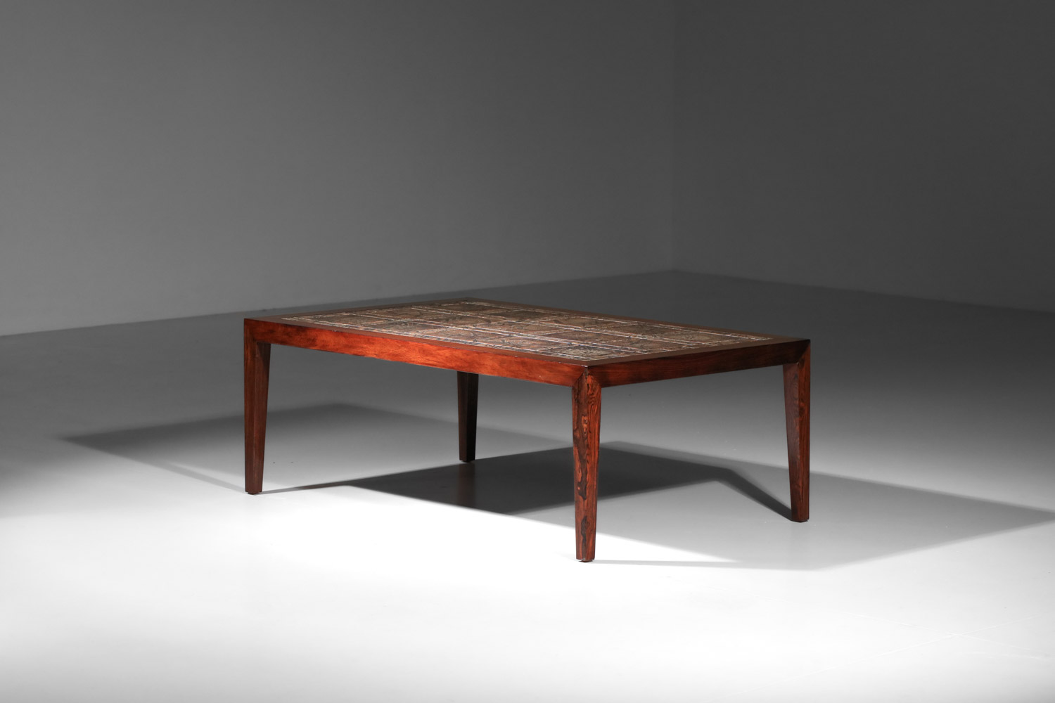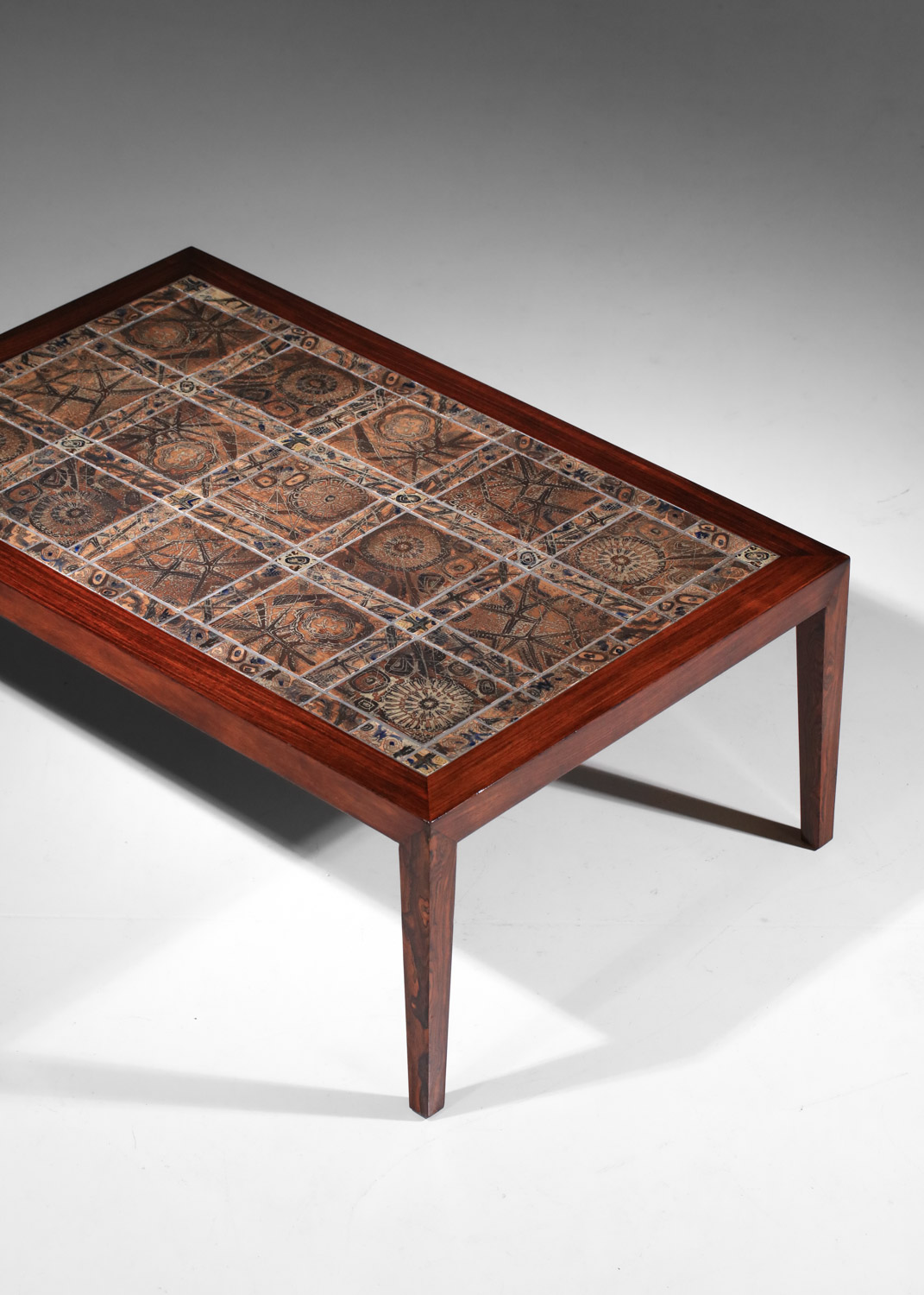Danish coffee table from the 1960s by designer Severin Hansen. Rio rosewood frame, ceramic tile top handmade at the Royal Copenhagen Porcelain factory. Very good vintage condition, with slight signs of age and use; the varnish has been restored (see photos).