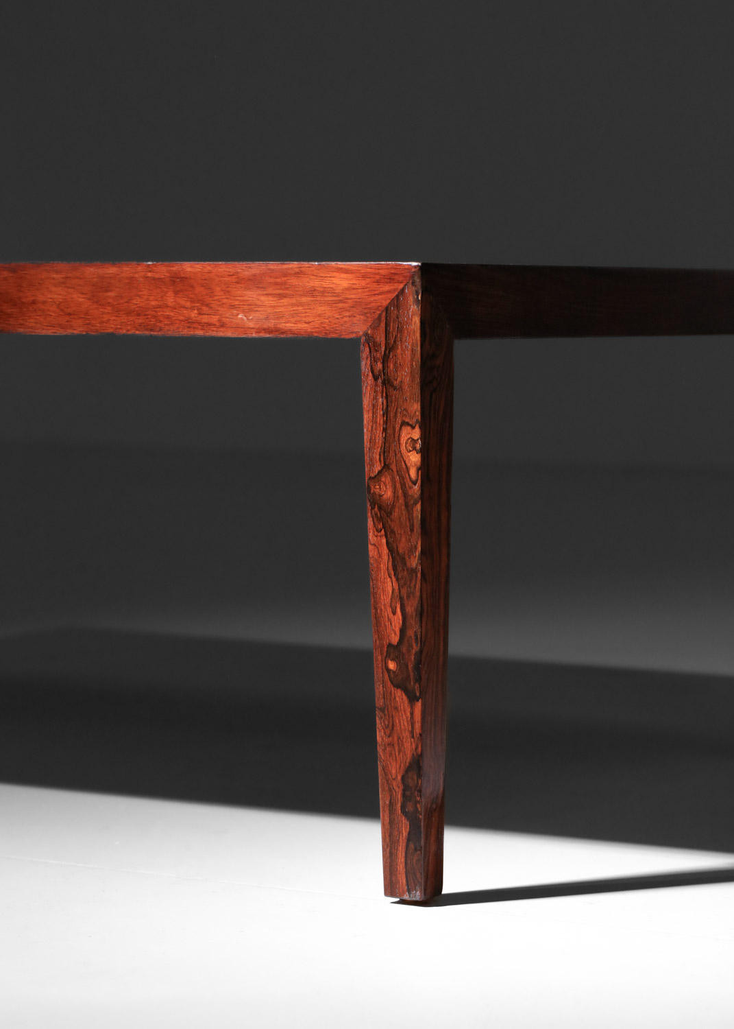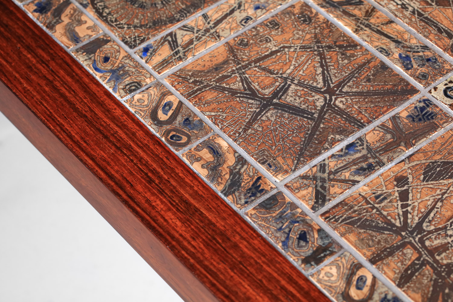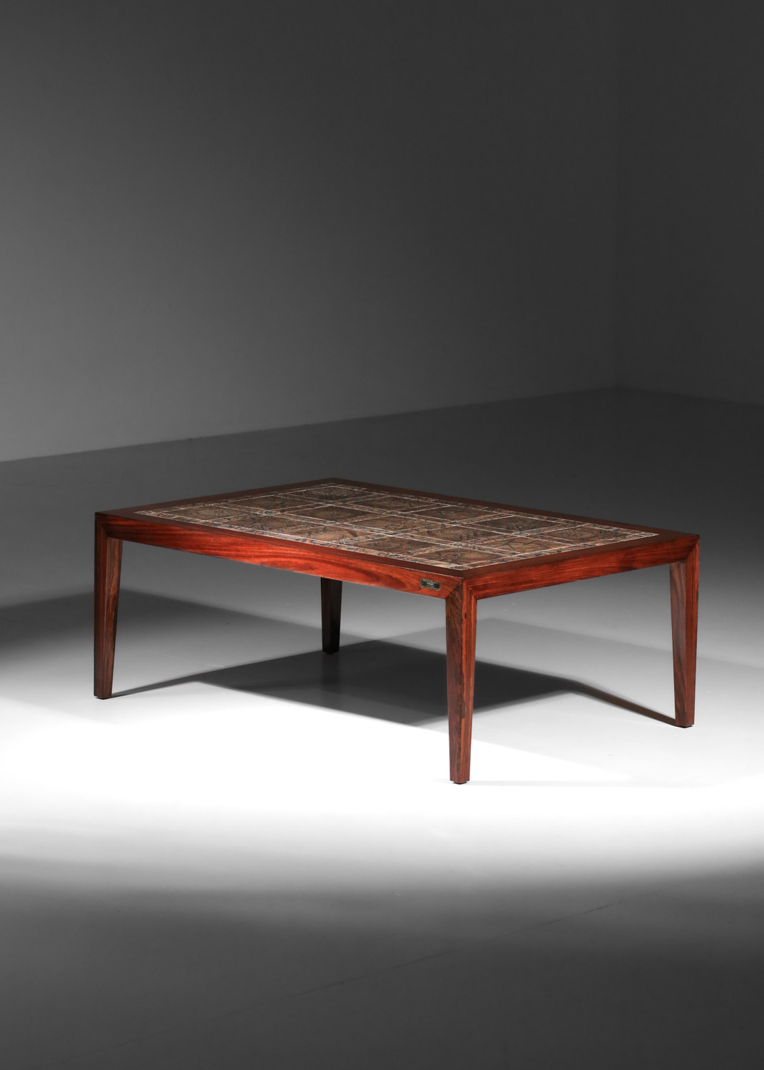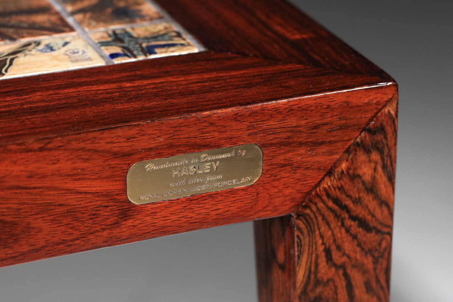Danish coffee table from the 1960s by designer Severin Hansen. Rio rosewood frame, ceramic tile top handmade at the Royal Copenhagen Porcelain factory. Very good vintage condition, with slight signs of age and use; the varnish has been restored (see photos).