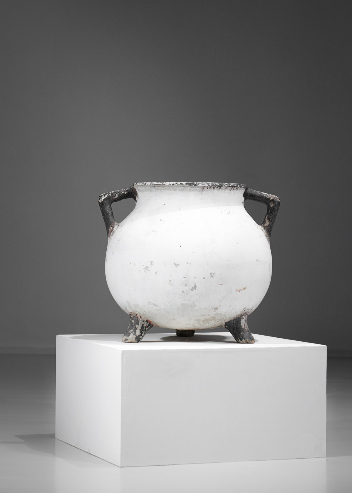 Fameux modèle de jardinière « marmite » du designer suisse Willy Guhl produit par Eternite dans les années 50/60. Structure en forme de chaudron en fibro-ciment peinte en blanc reposant sur trois pieds. Très jolie patine ( cf photos ).