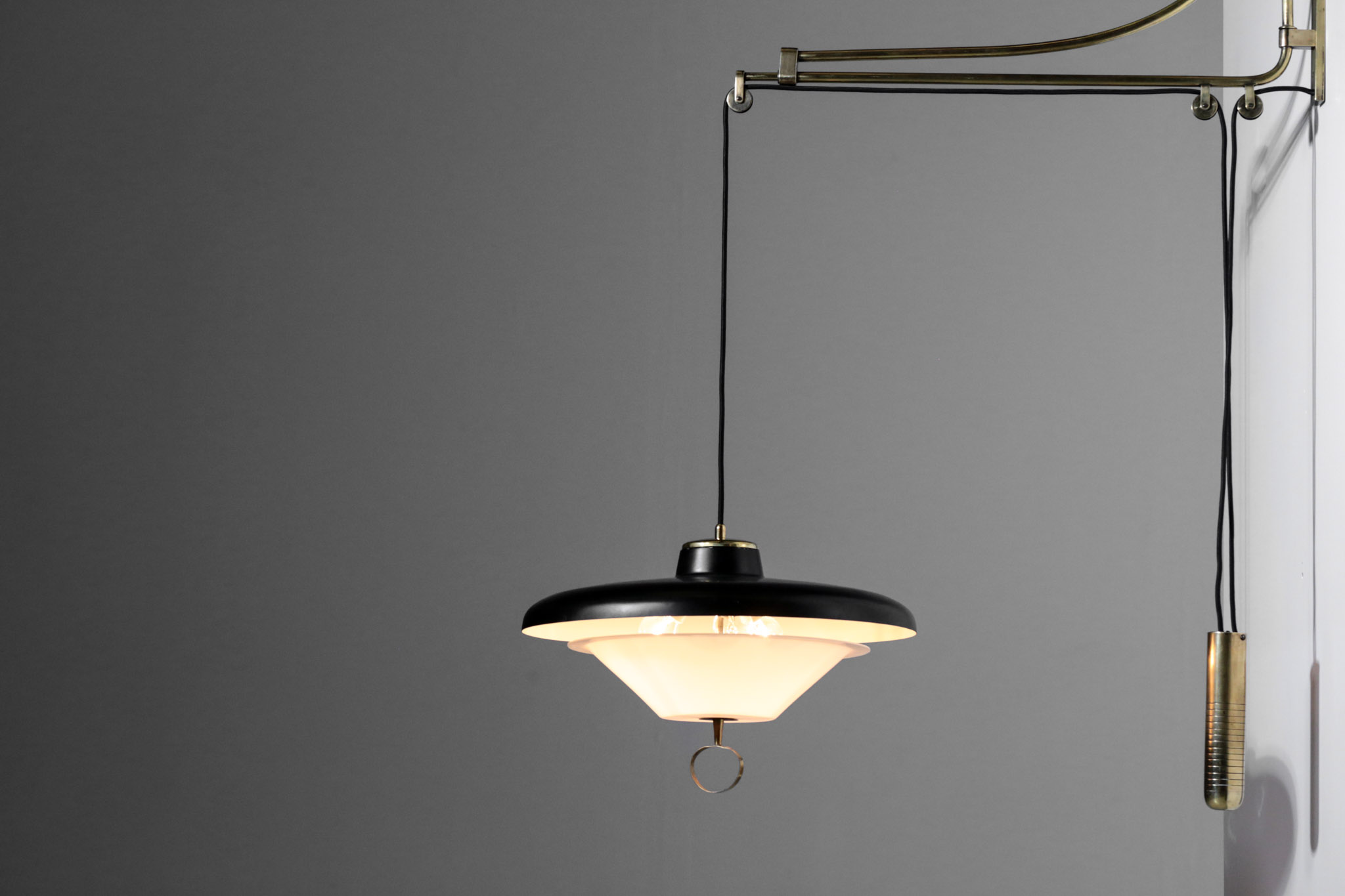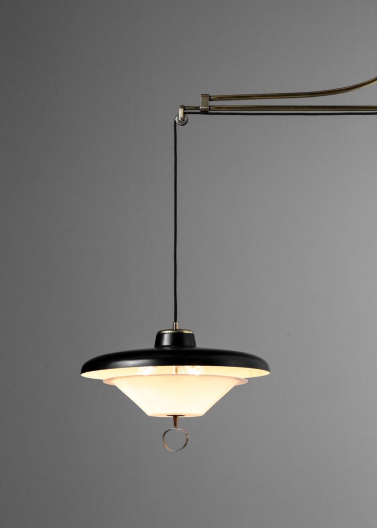 Grande applique potence télescopique à contrepoids dessinée par le designer italien Oscar Torlasco. Structure en laiton massif et diffuseur en acier laqué et perplexe blanc. Trois ampoules type E14. La potence est orientable, télescopique et le contrepoids permet d’ajuster la hauteur du diffuseur.