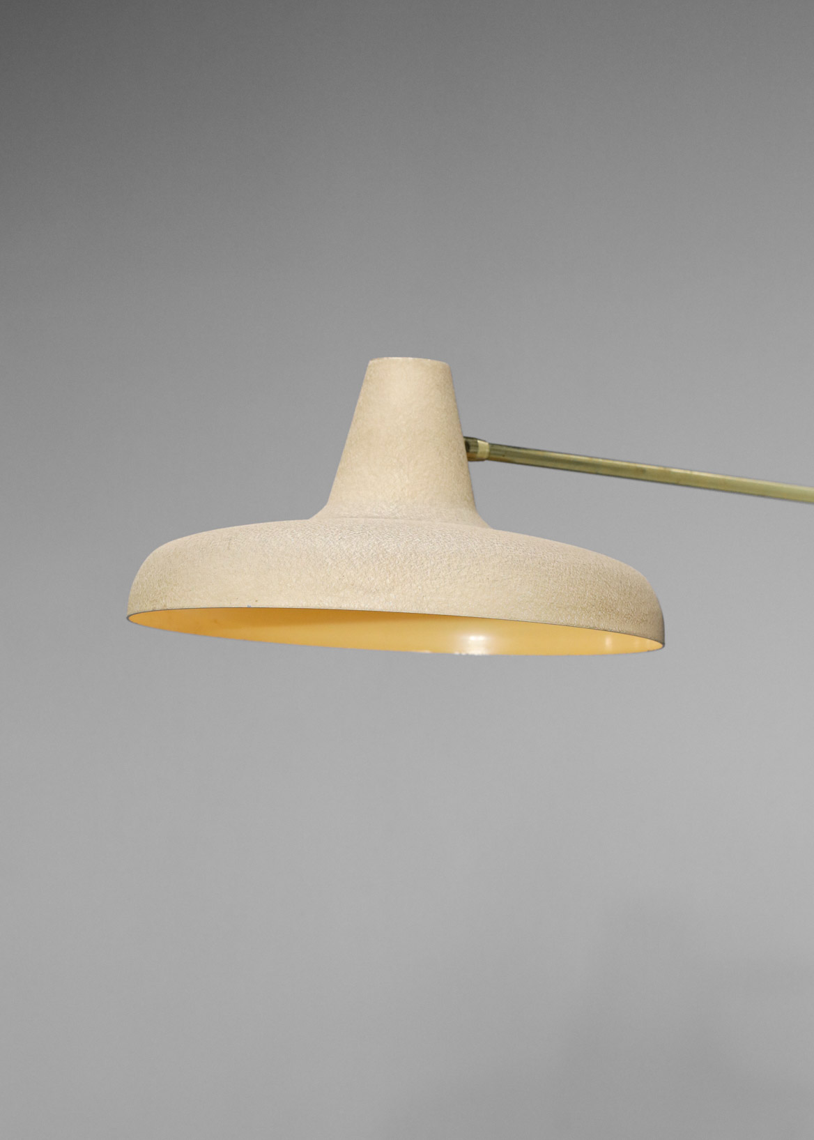 Lampe potence articulée des années 50 dans le style du travail de la Maison Lunel. Bras articulé en laiton massif permettant d’orienter l’applique dans différentes positions. Abat-jour et platine murale en métal laqué avec une peinture vermiculée beige d’origine. Très bel état vintage, avec une belle patine sur le laiton, quelques traces du temps et d’usage à noter sur l’abat-jour et la plaque murale (cf photos). Ampoule LED recommandée type B22.