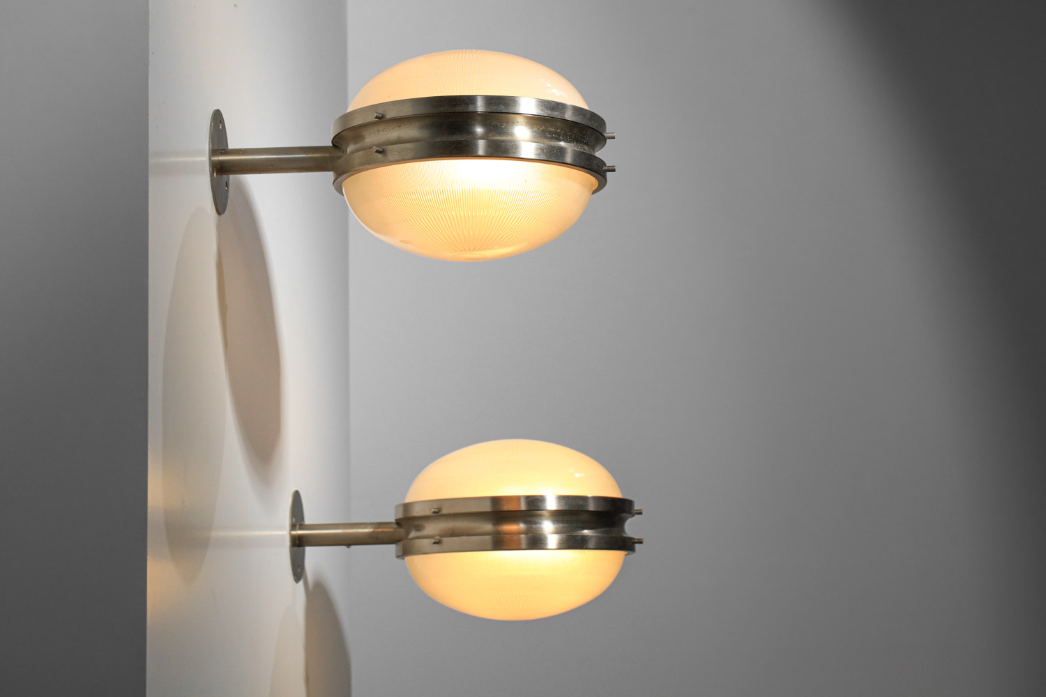 Grande paire d’appliques murales des années 60 du designer italien Sergio Mazza pour Artemide, modèle « Gamma ». Structure en métal chromé et globes en verres dépolis blancs striés. Très bel état vintage, à noter des traces d’oxydation sur le métal (cf photos), ampoule LED recommandée de type E27.