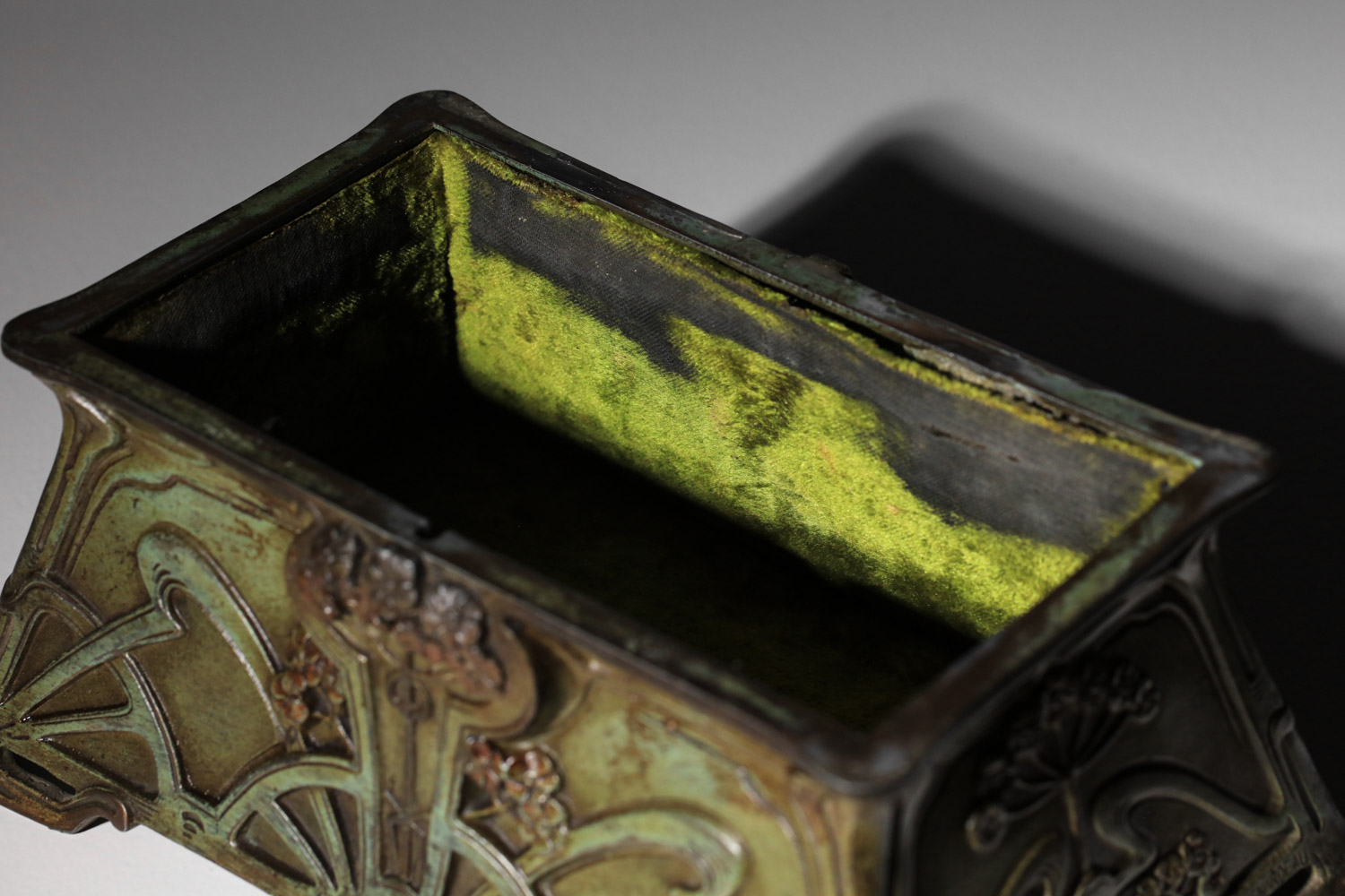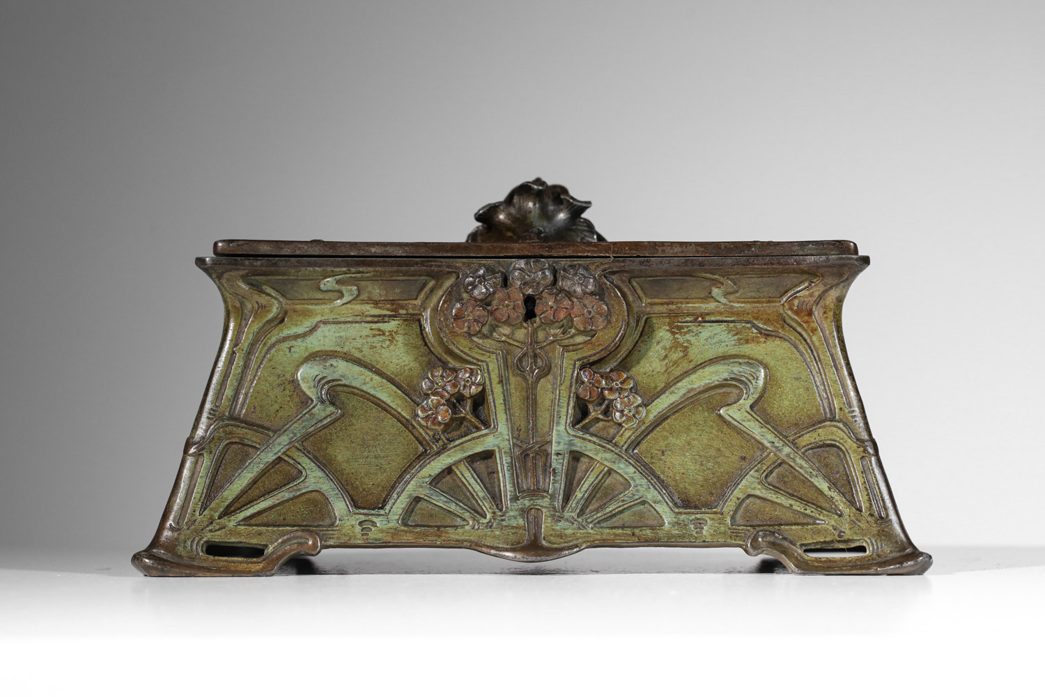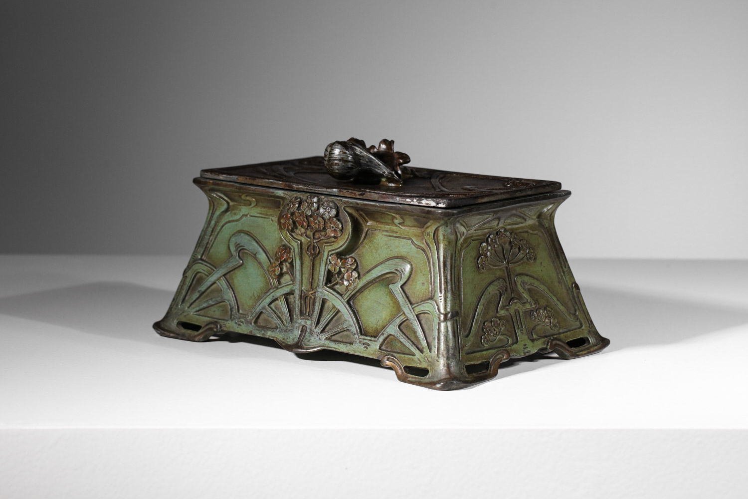 boite rectangulaire art nouveau Guénardeau en regule patiné design vintage français décor de fleurs arabesques patine vert de gris