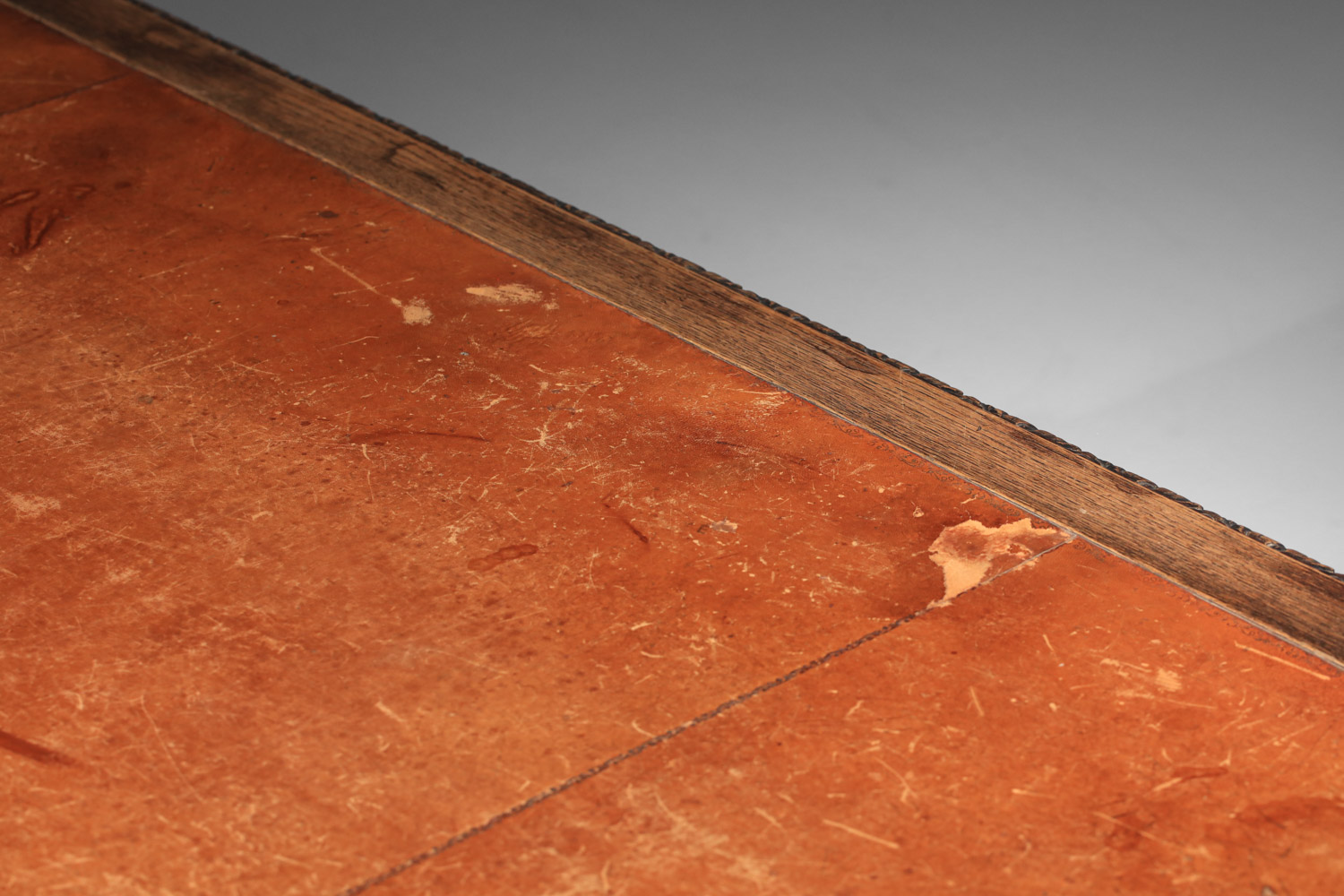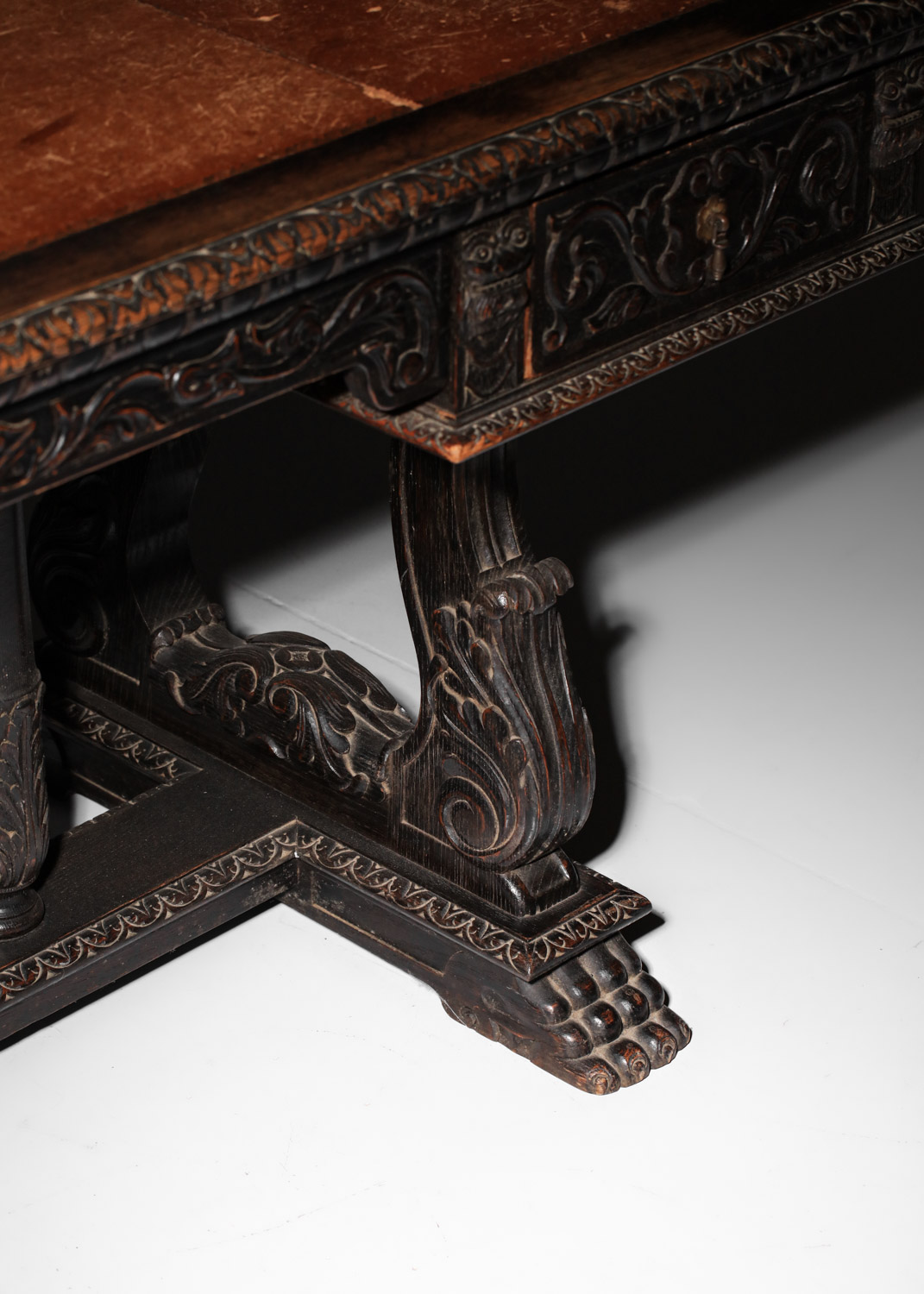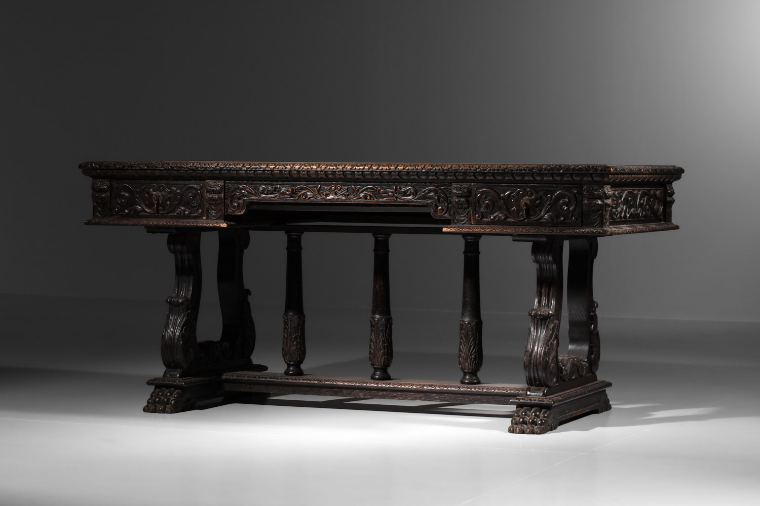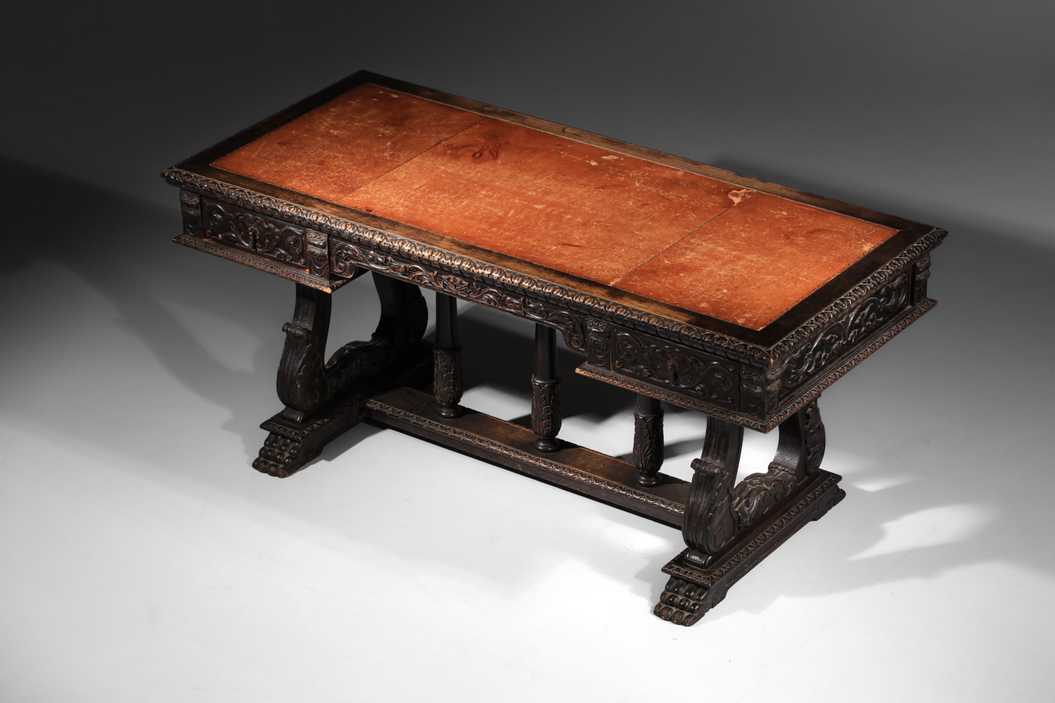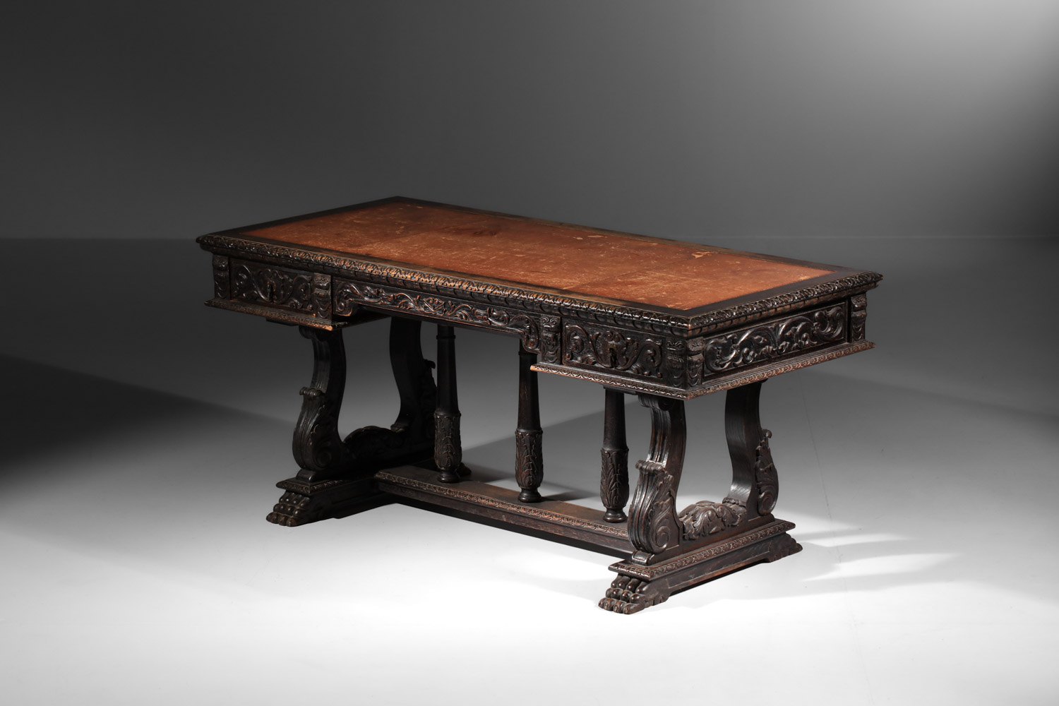Bureau italien style renaissance. Structure en chêne massif teinté et plaqué avec un magnifique décor sculpté sur l’ensemble du bureau. Sous main en cuir camel d’origine. Superbe travail, avec une belle patine du temps que nous avons souhaité conserver en l’état. Nombreuses traces du temps et d’usage en particulier sur le sous main : rayures, déchirures (voir photos).