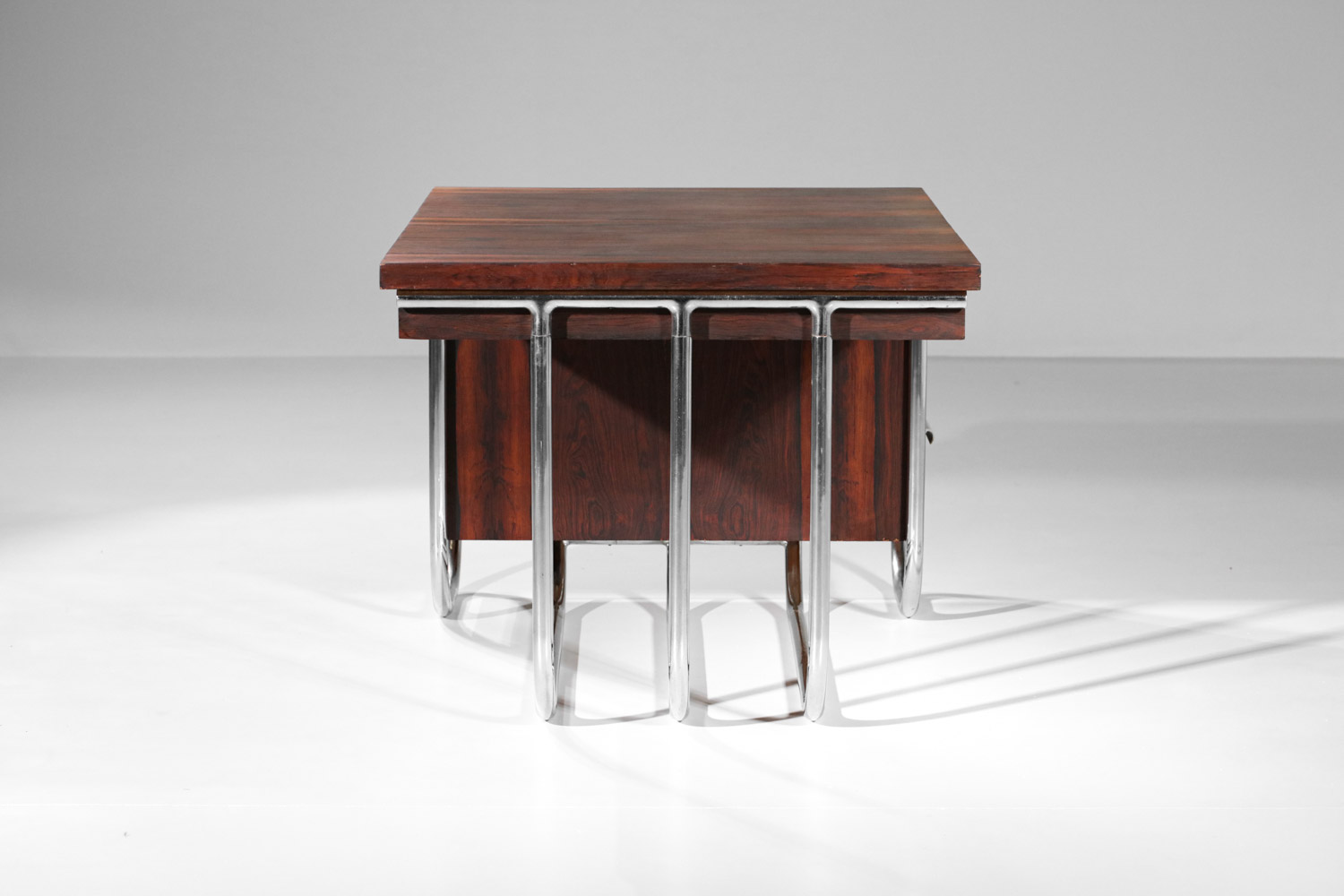 Bureau français des années 40 / 50 dans un style moderniste Bauhaus. Structure du bureau en palissandre de Rio plaqué et massif avec un triple piétement tubulaire en acier chromé assez rare. Le bureau est composé d’un caisson avec avec 3 tiroirs et d’un quatrième tiroir central. Bel état vintage, à noter des traces de restauration anciennes ainsi eme ‘utilisation (voir photos). Clés non fournies.
