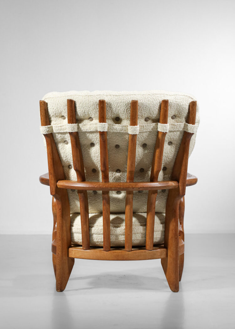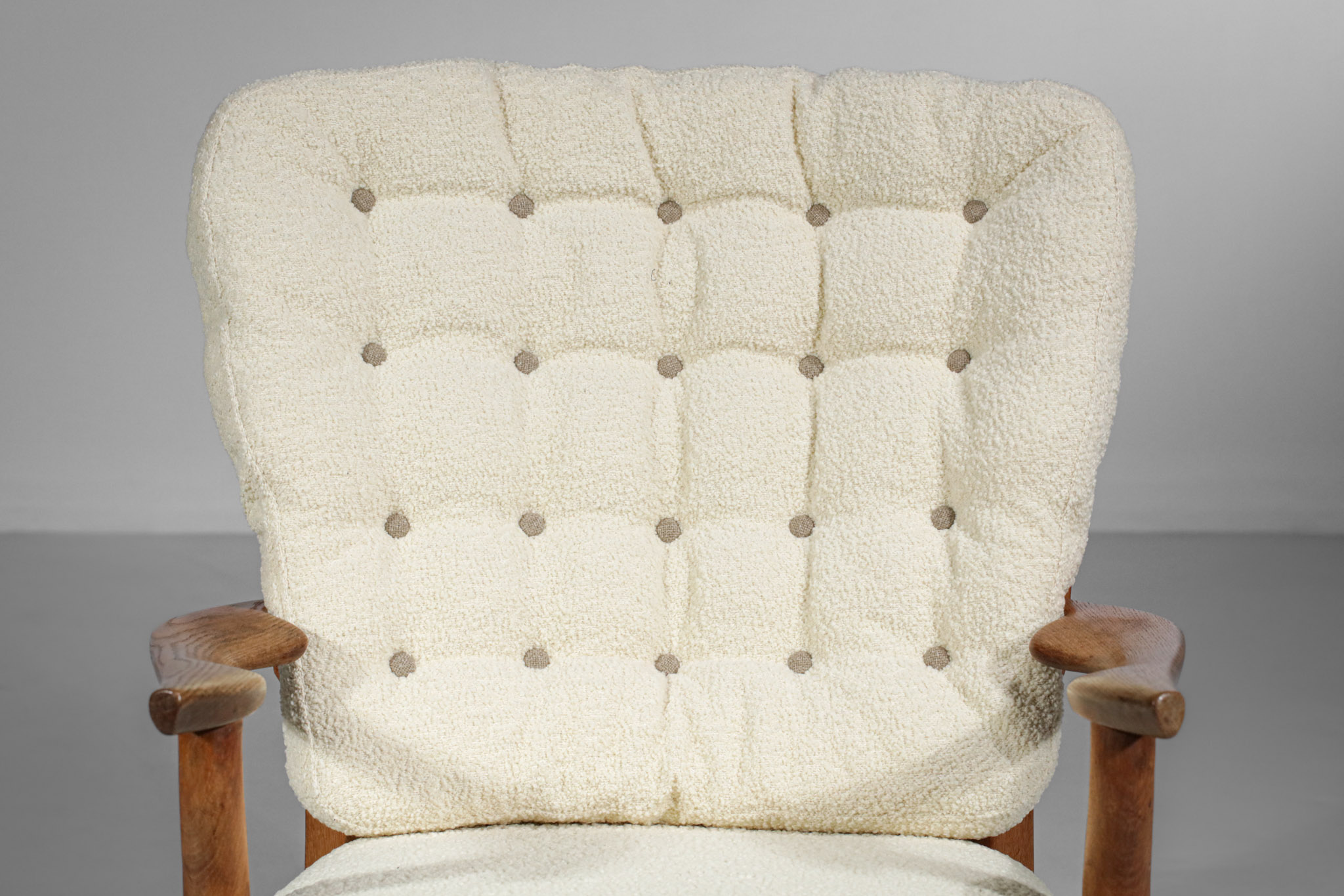 Fauteuil grand repos du couple de Designers Français Guillerme et Chambron des années 60 édité par Votre Maison, modèle « Madame ». Structure en chêne massif, coussin d’assise et dossier d’origine mais retissé à neuf avec un lainage aux blanc cassé de chez Bisson Bruneel. Excellent état vintage, présence du fissure minime sur la barre centrale du dossier à l’arrière du fauteuil (cf photos).