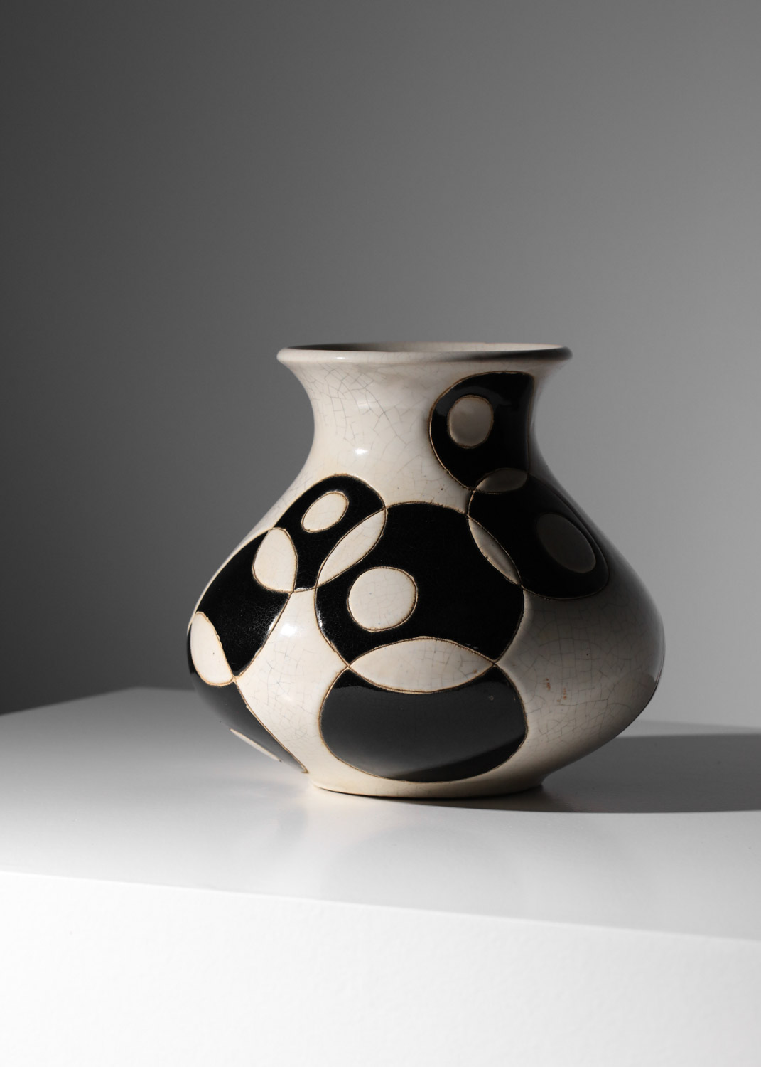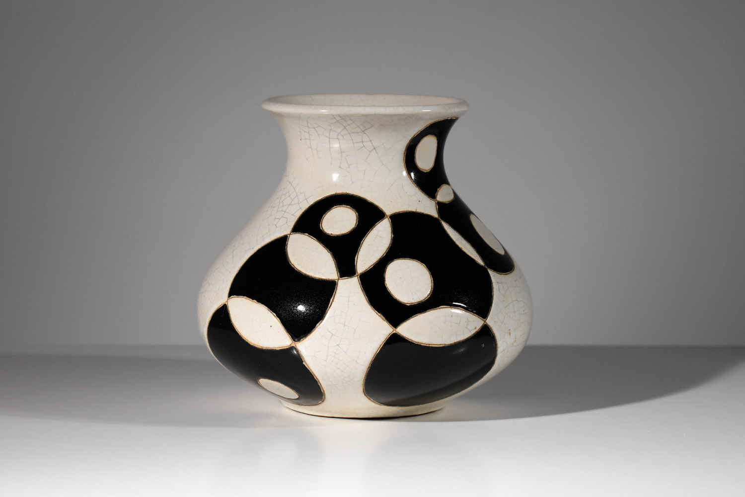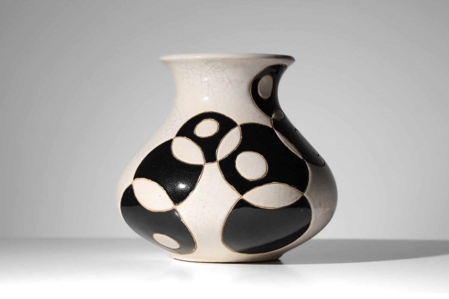 Vase art déco français en céramique beige craquelée avec un décor géométrique abstrait noir sur l’ensemble du vase. Très bel état vintage (voir photos). Signature de l’artiste sous le vase non identifiée.