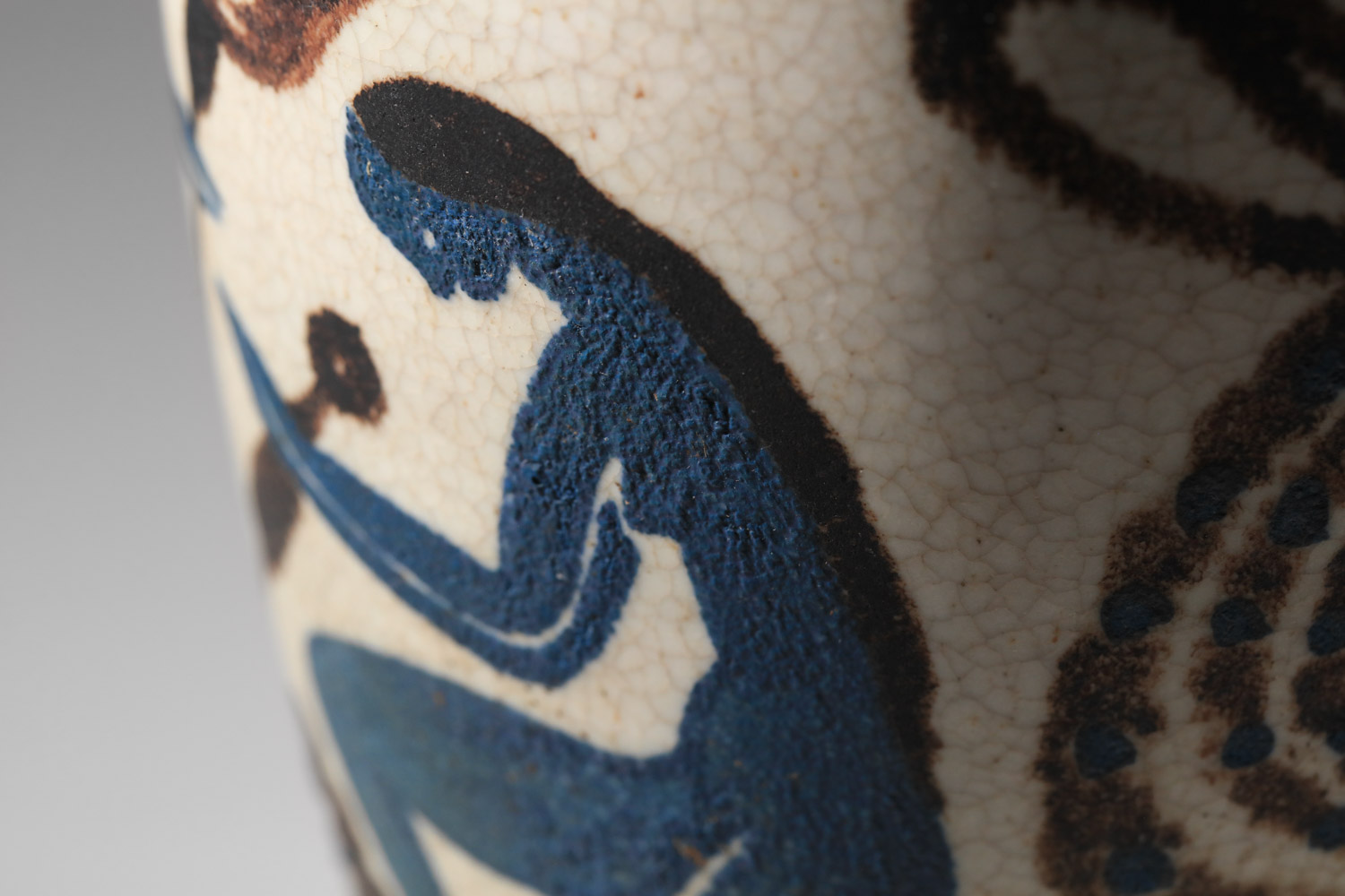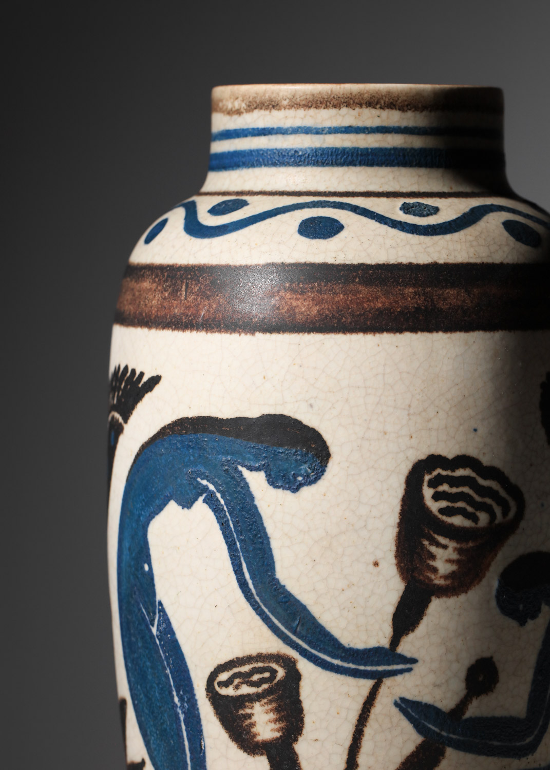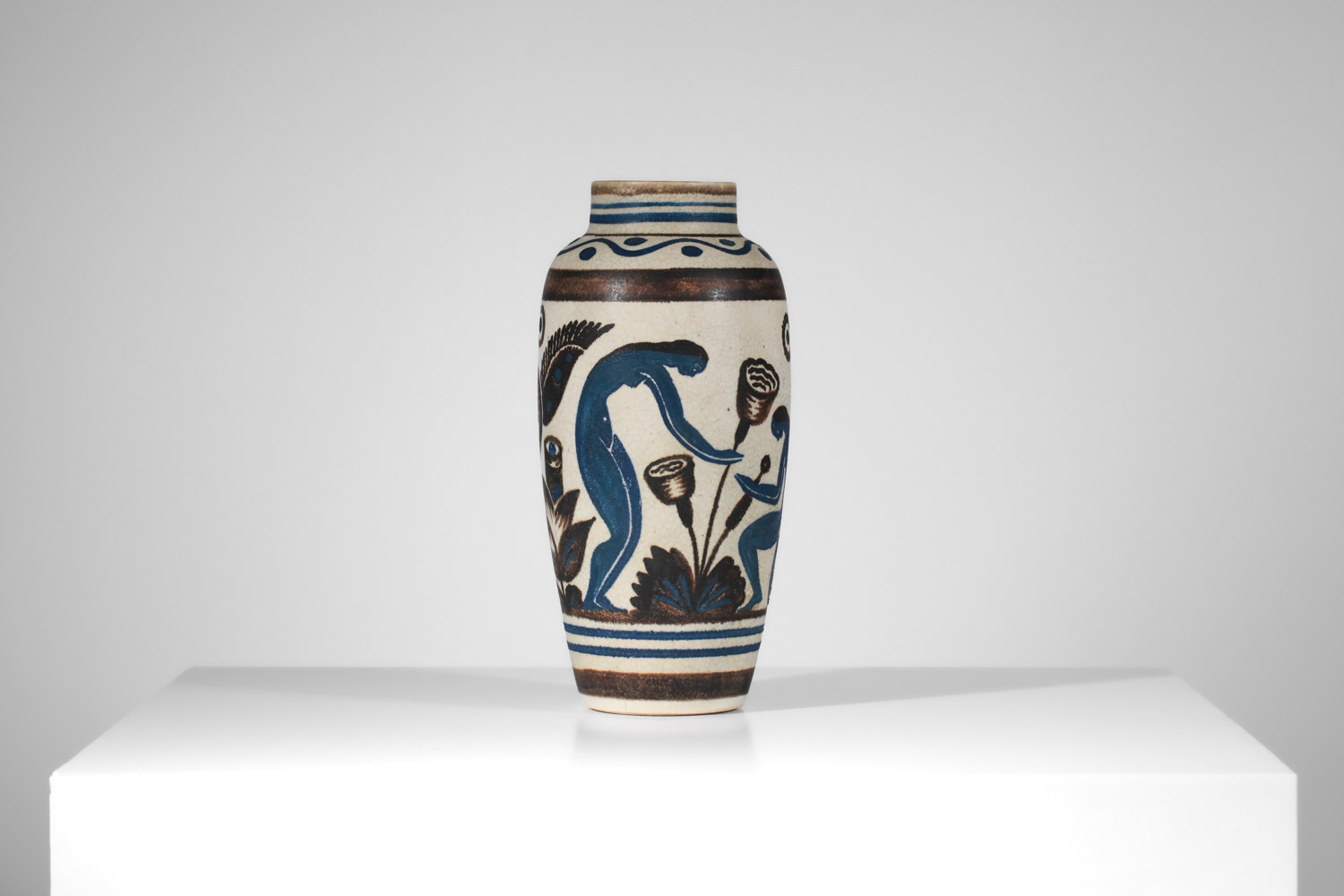 Vase en céramique des années 30 attribué à René Buthaud pour Primavera. Très joli décor sur l’ensemble du vase représentant des femmes et des fleurs. Céramique avec une émaille craquelée beige, bleu et marron. Très bel état vintage, légères traces du temps et d’usage (voir photos).