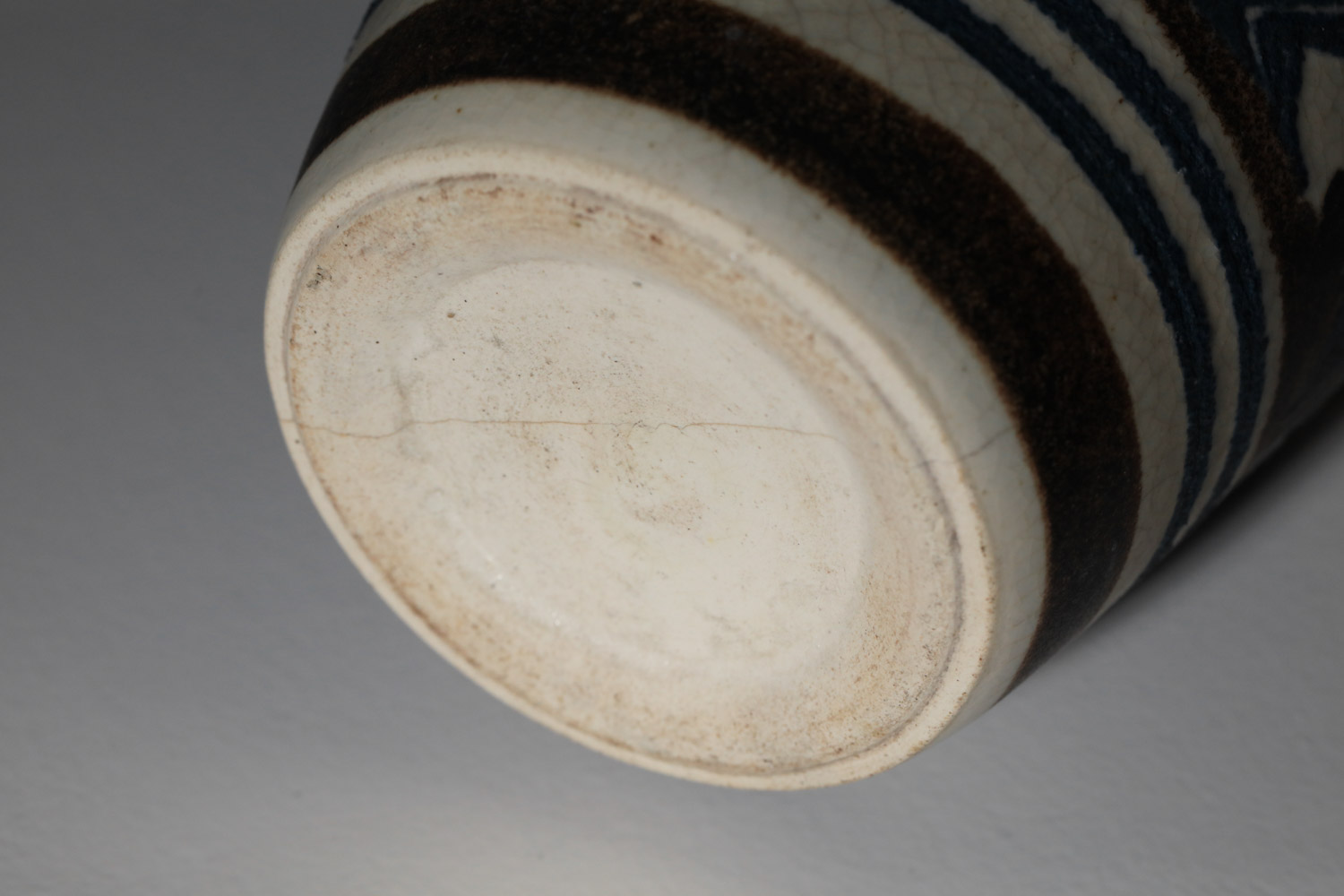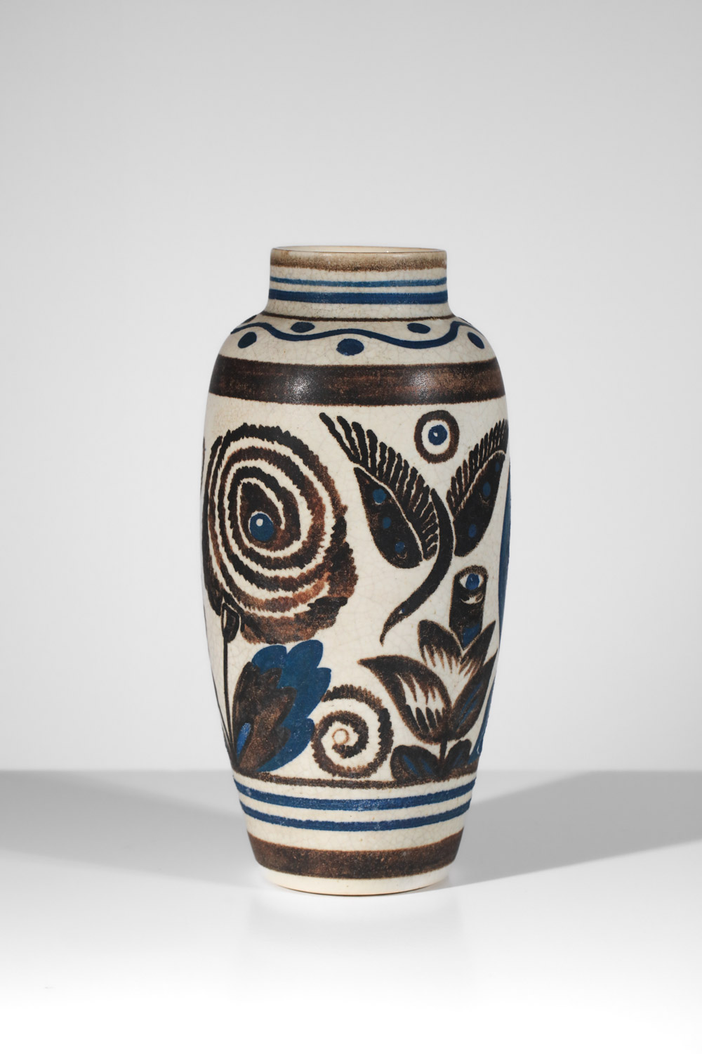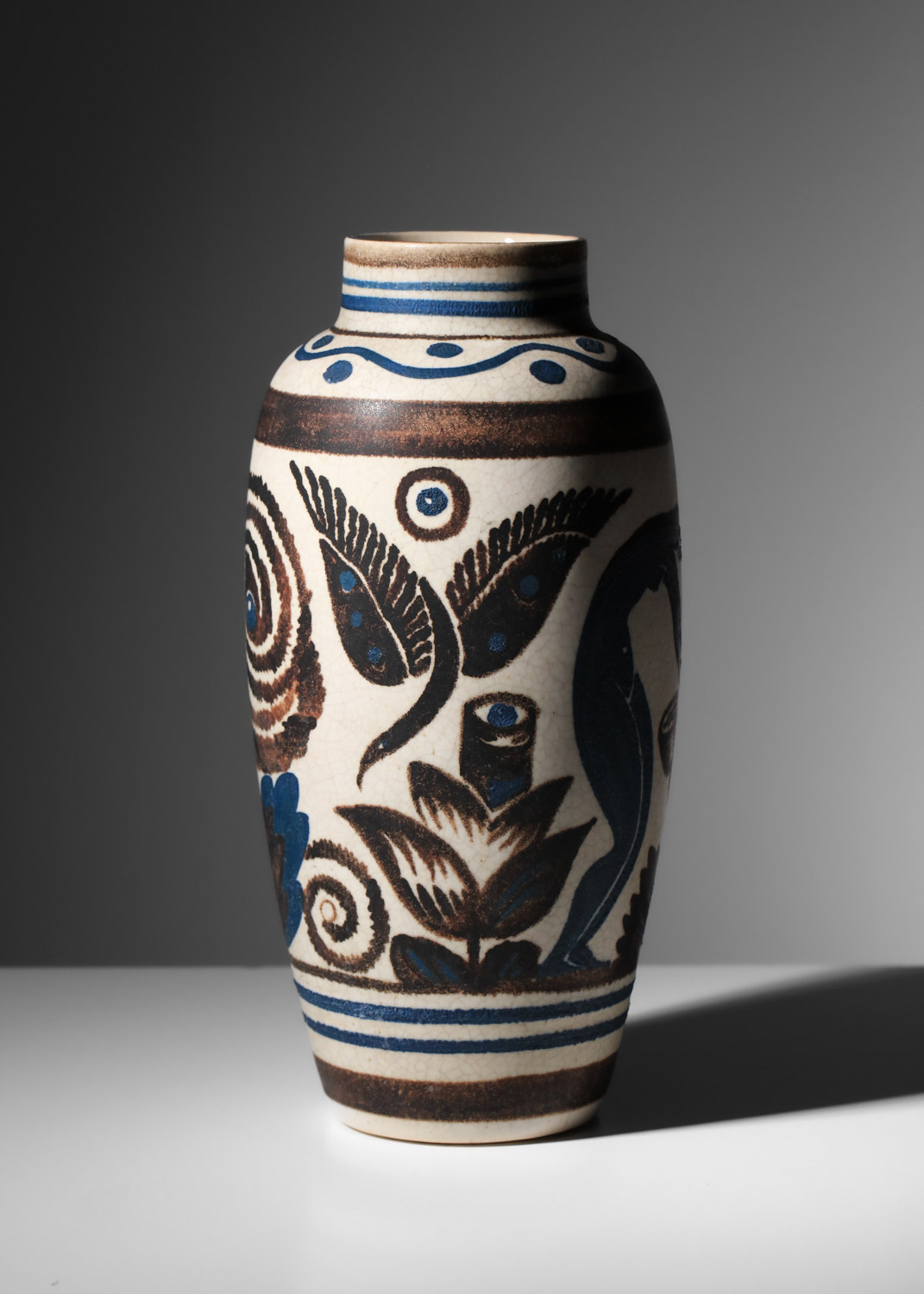 Vase en céramique des années 30 attribué à René Buthaud pour Primavera. Très joli décor sur l’ensemble du vase représentant des femmes et des fleurs. Céramique avec une émaille craquelée beige, bleu et marron. Très bel état vintage, légères traces du temps et d’usage (voir photos).