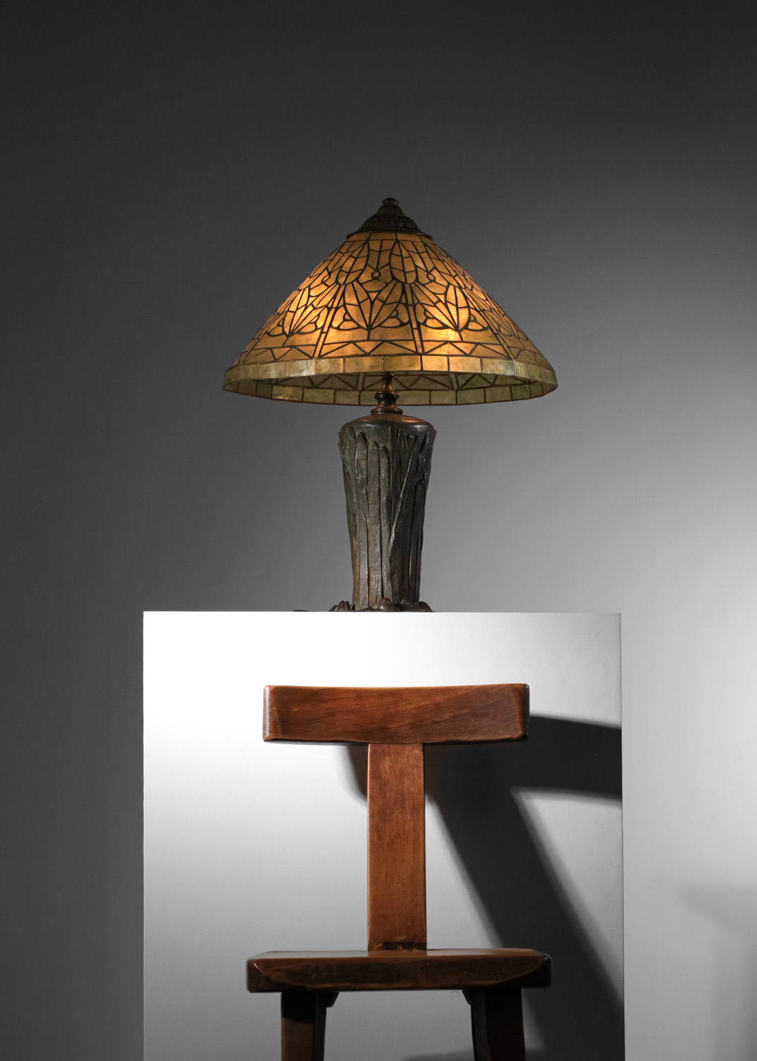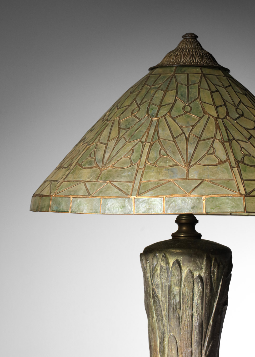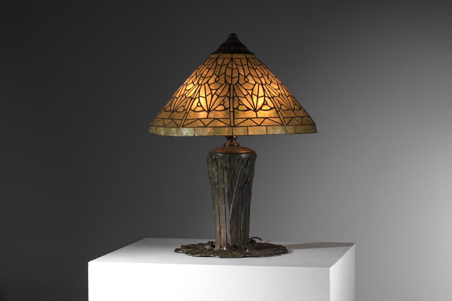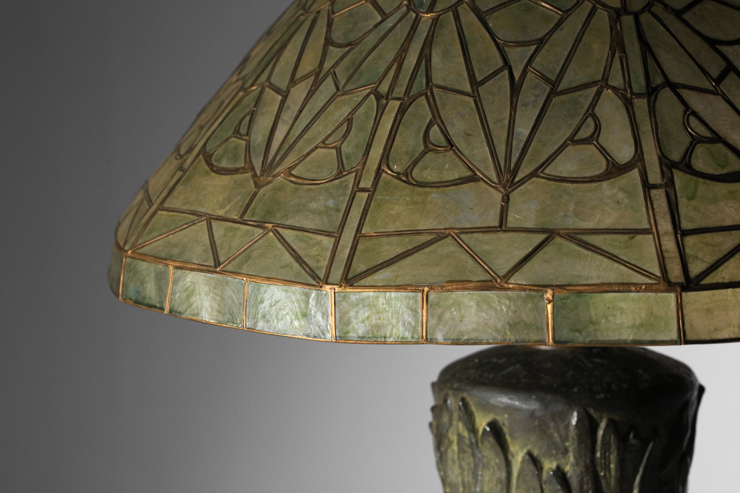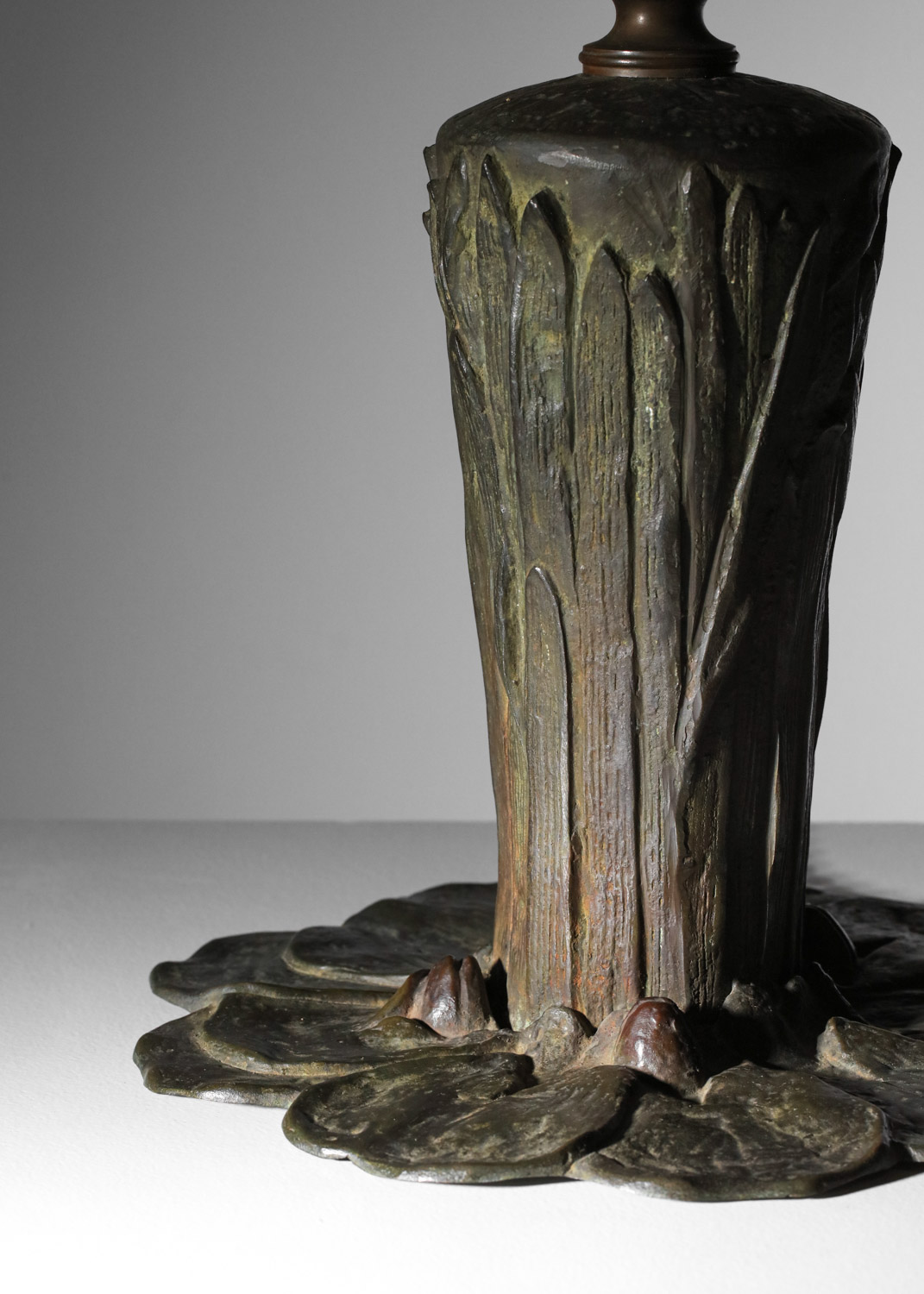 Grande lampe à poser française des années 30 / 40 dans le style des lampes Tiffany. Socle en bronze massif patiné représentant des nénuphars et des roseaux. Abat-jour en plaques de nacre à décor floral. Travail de grande qualité. Très bel état vintage, à noter un petit éclat quasi invisible sur une plaque de nacre (CF photos). Nous recommandons deux ampoules LED type E27.