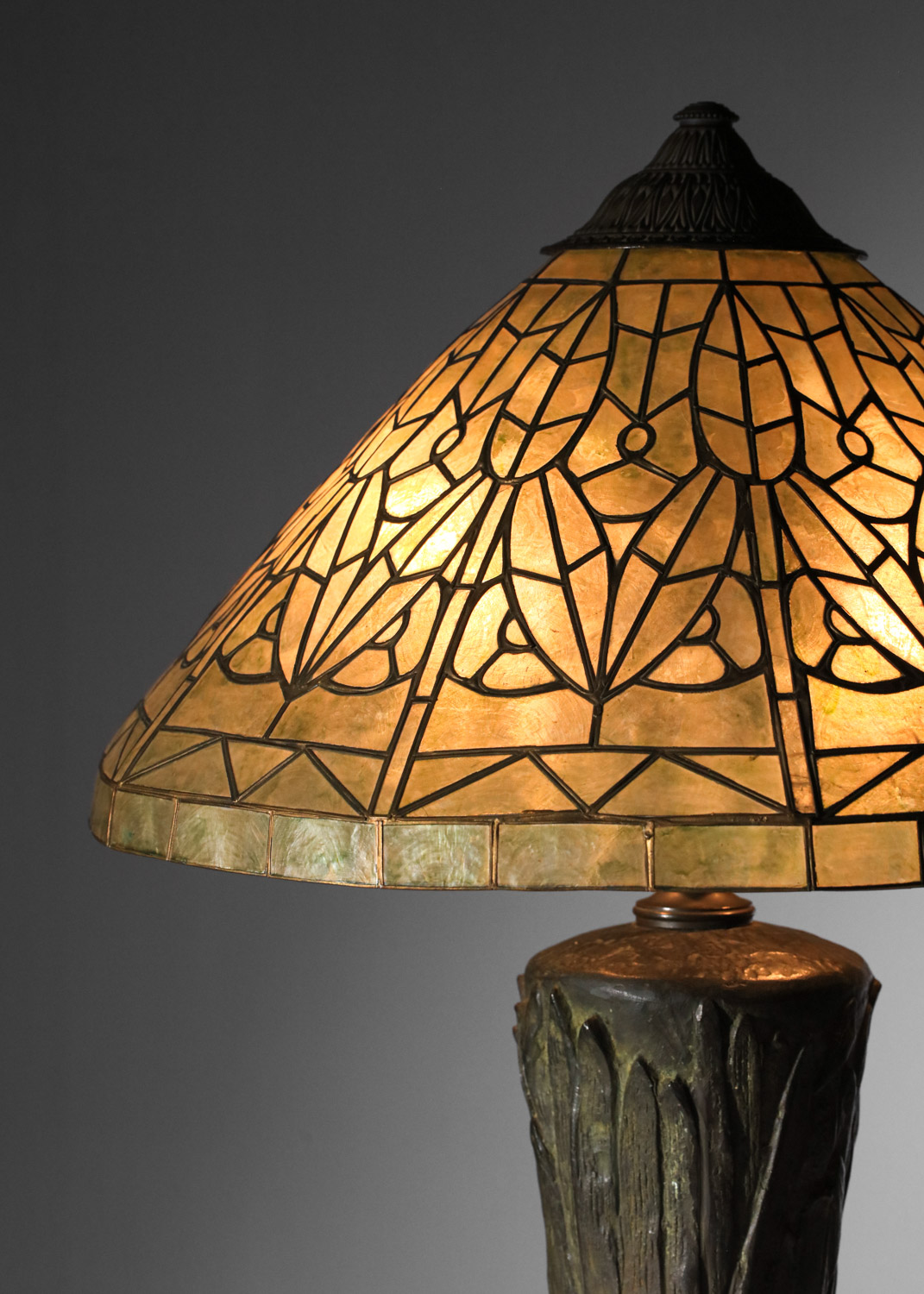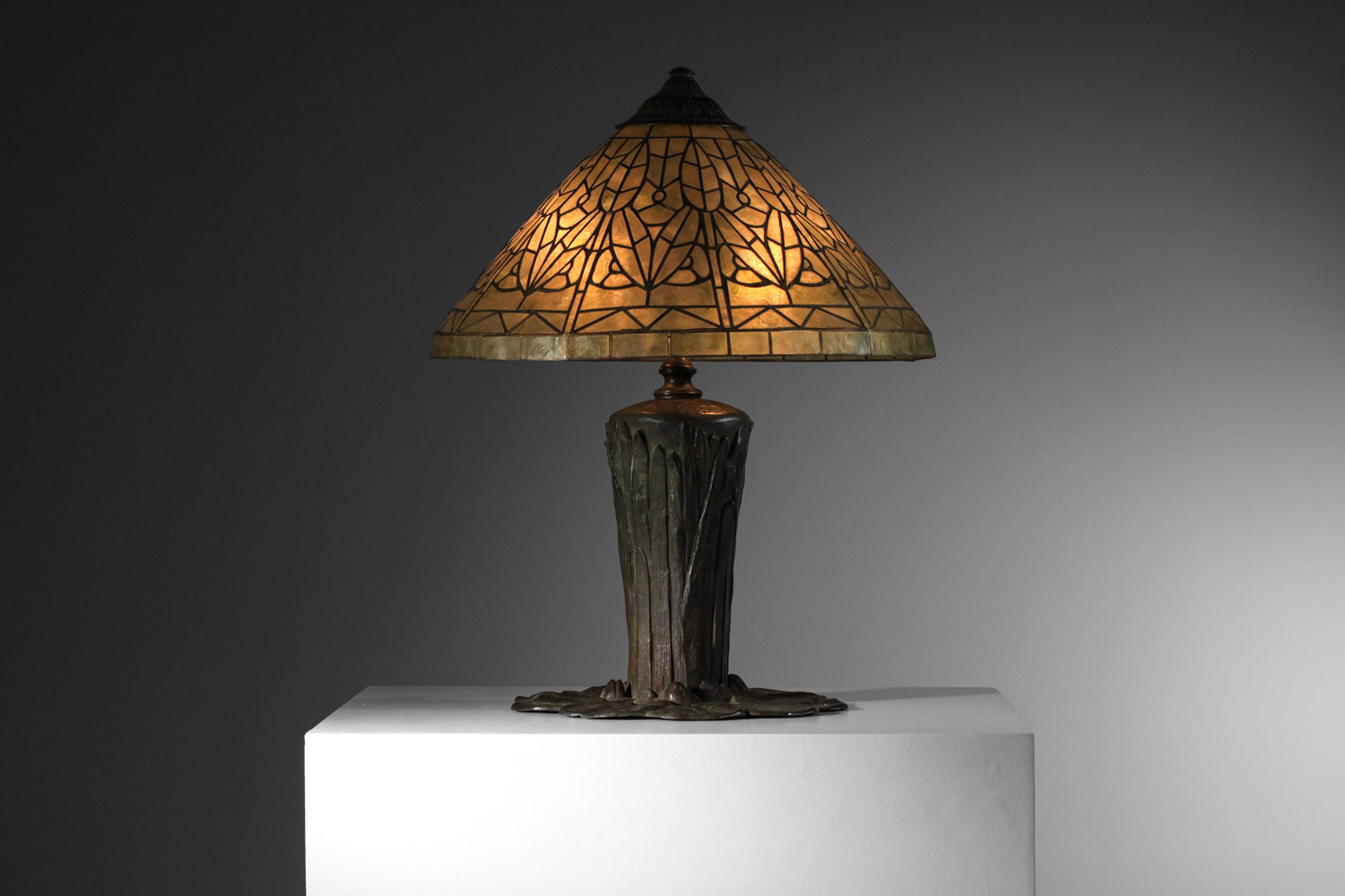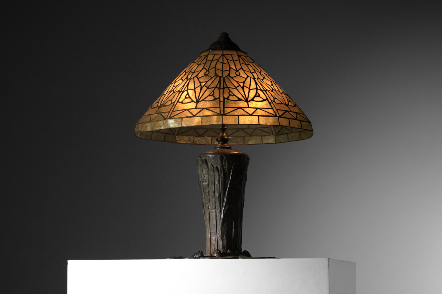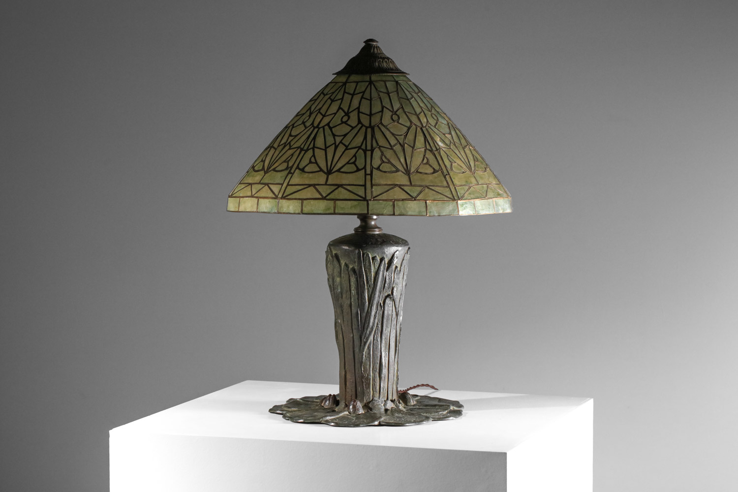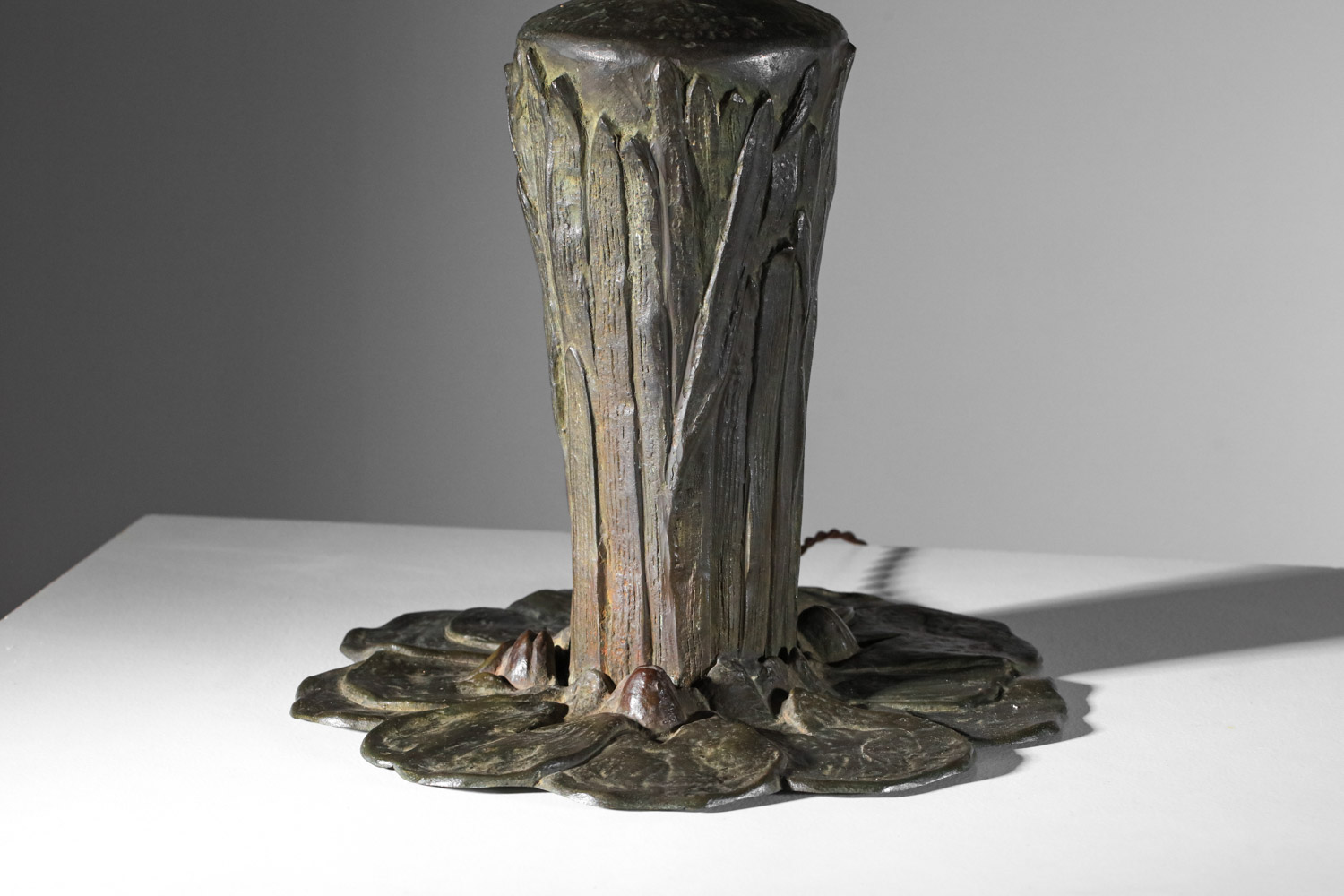 Grande lampe à poser française des années 30 / 40 dans le style des lampes Tiffany. Socle en bronze massif patiné représentant des nénuphars et des roseaux. Abat-jour en plaques de nacre à décor floral. Travail de grande qualité. Très bel état vintage, à noter un petit éclat quasi invisible sur une plaque de nacre (CF photos). Nous recommandons deux ampoules LED type E27.