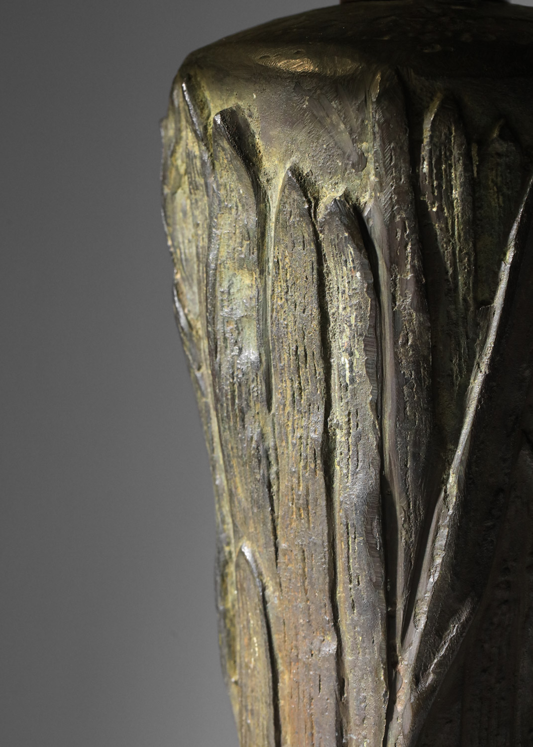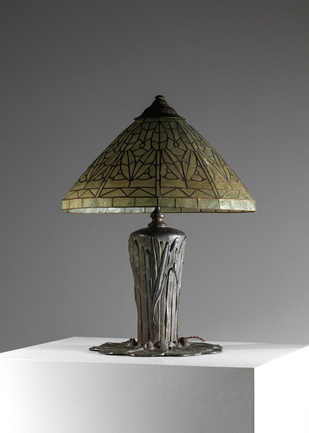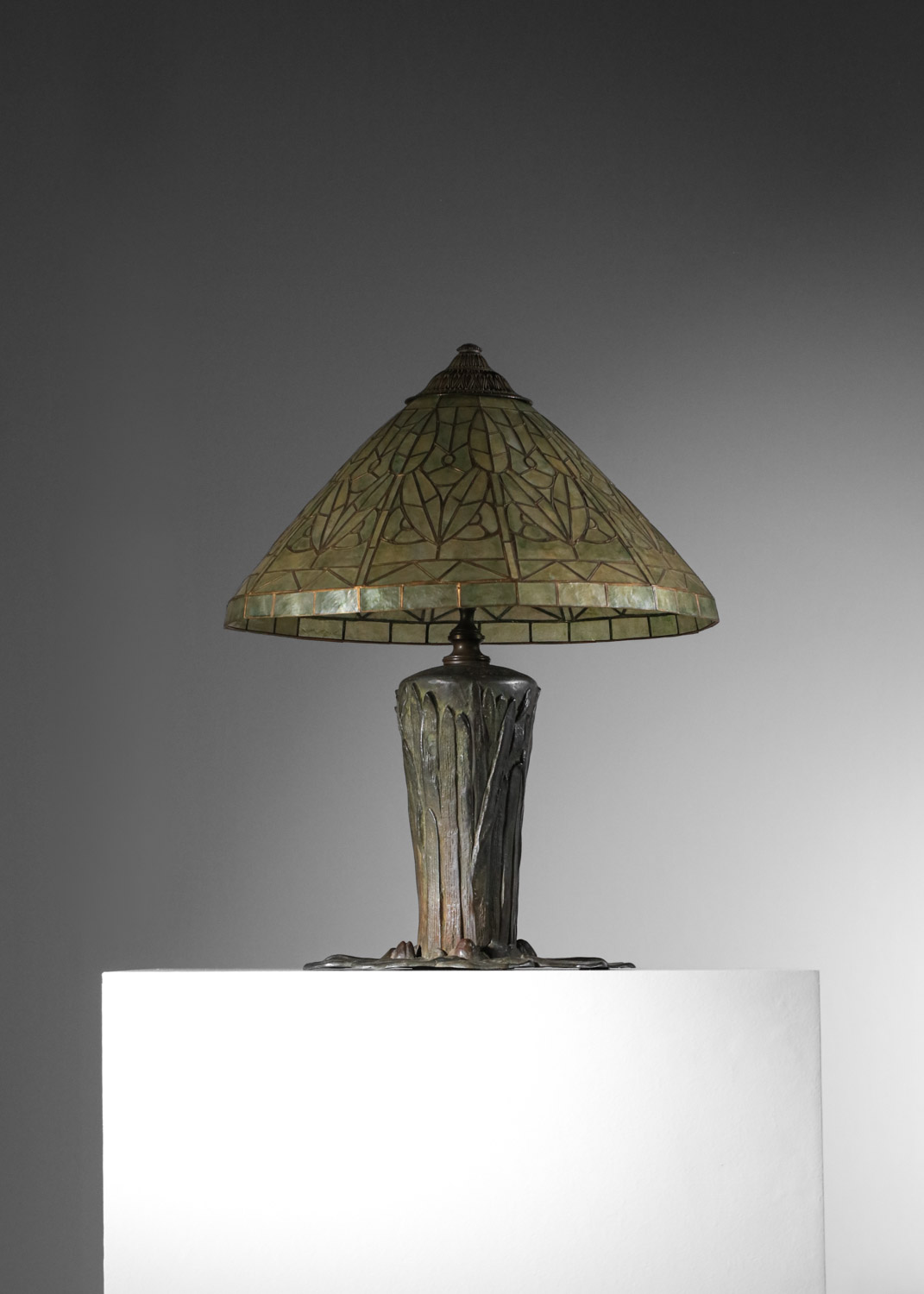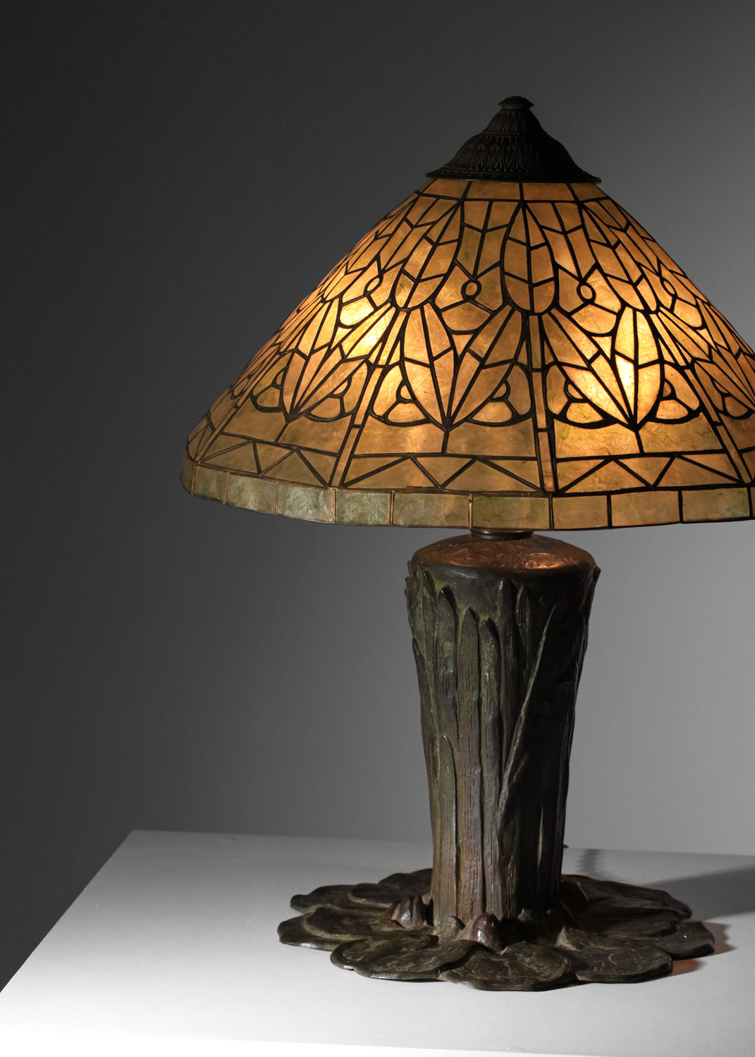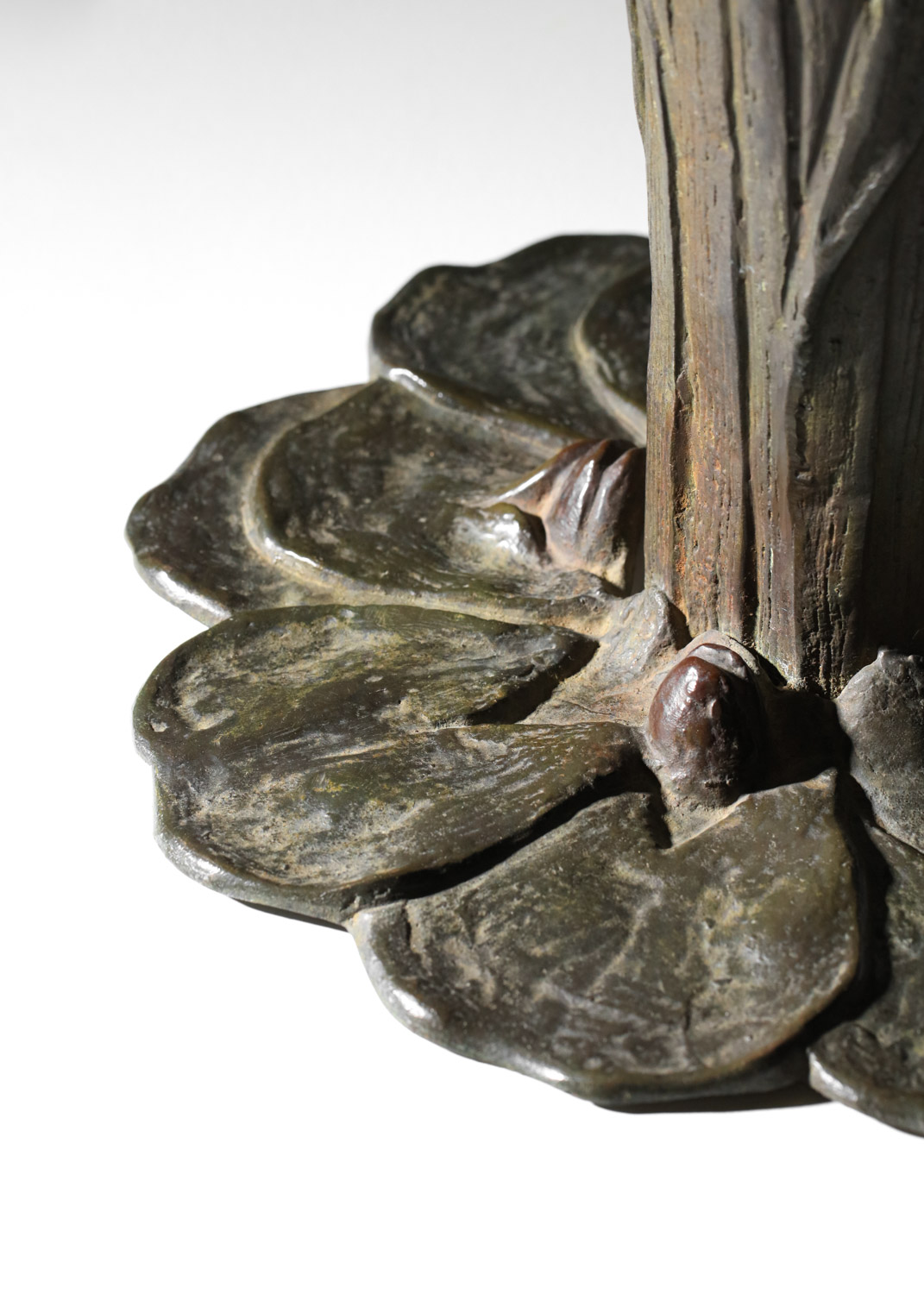Grande lampe à poser française des années 30 / 40 dans le style des lampes Tiffany. Socle en bronze massif patiné représentant des nénuphars et des roseaux. Abat-jour en plaques de nacre à décor floral. Travail de grande qualité. Très bel état vintage, à noter un petit éclat quasi invisible sur une plaque de nacre (CF photos). Nous recommandons deux ampoules LED type E27.