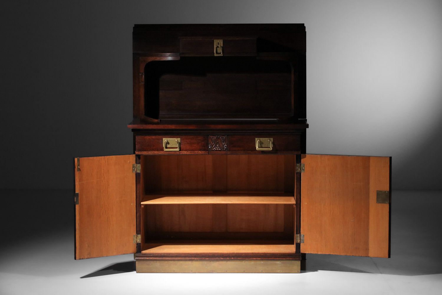 Meuble bar Jugenstil dans le style de  la Sécession Viennoise des années 1910 / 1920, influencé par la Wienner Werkstatte dans le goût des créations de Koloman Moser ou Josef Maria Olbrich. Structure en chêne massif, le bar est composé de trois tiroirs et deux portes battantes ouvrant sur des étagères. Très beaux détails de fabrication : sculpture du bois, décor sur le devant du meuble en marqueterie, poignées et ferrures en laiton massif avec de décors art nouveau. Très bel état vintage avec de légères traces du temps et d’utilisation en particulier sur le plateau: petites rayures (voir photos).