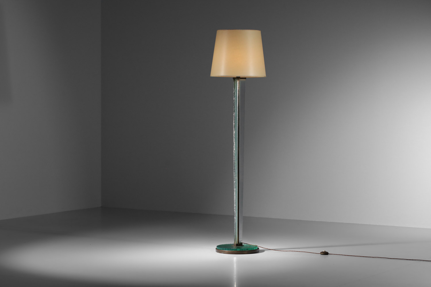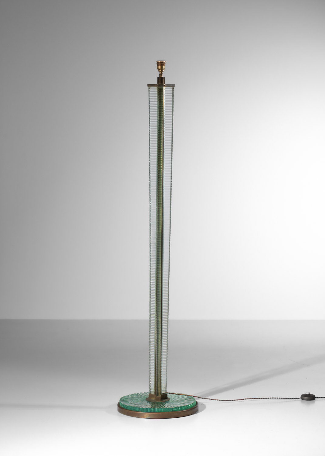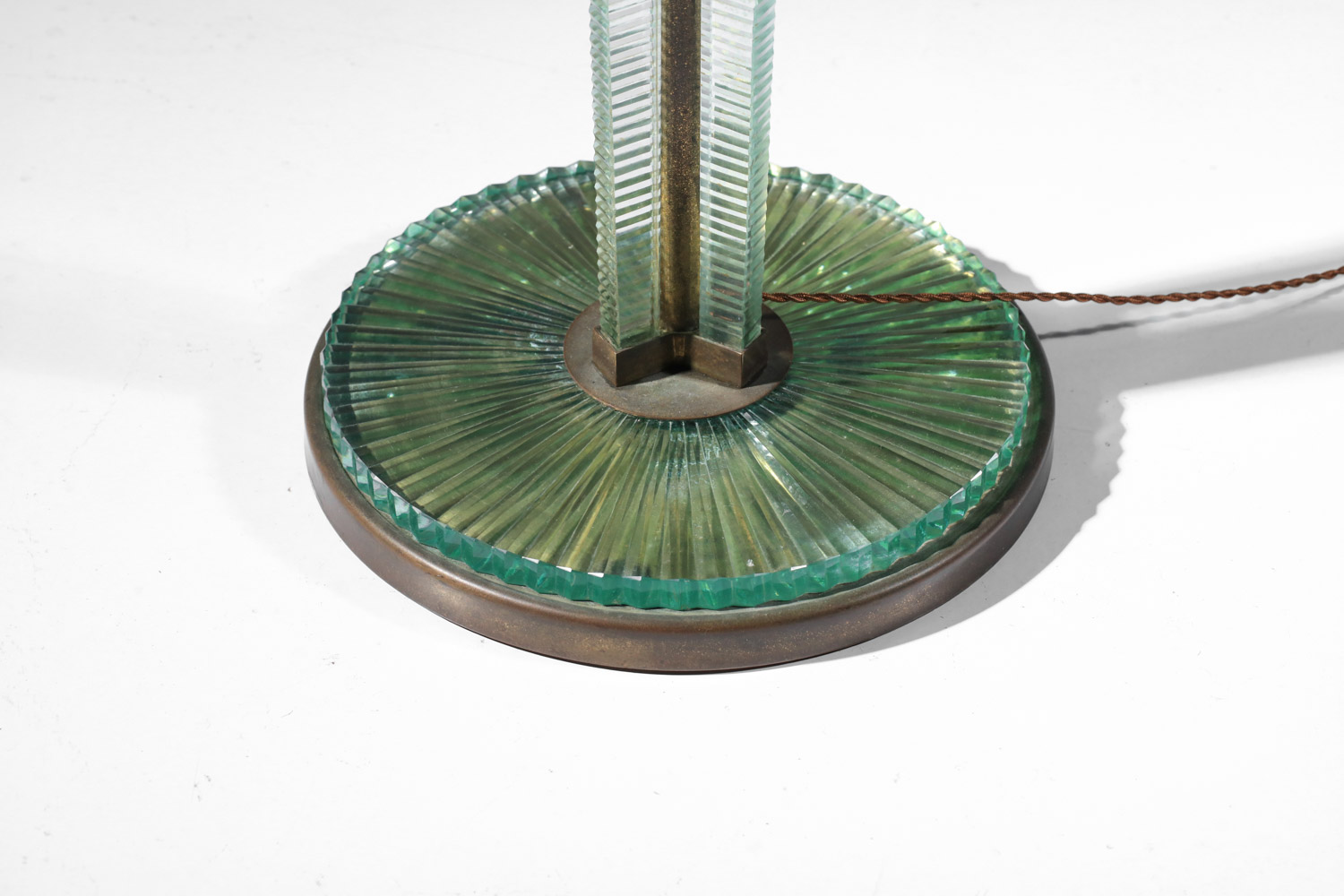 Lampadaire italien des années 30 attribué à Barovier & Toso. Structure et socle en laiton massif et dalle de verre épais. Bel état vintage, à noter des traces du temps d’usage: éclats mineurs sur le verre, oxydation du laiton (voir photos). L’abat-jour a été refait sur mesure. Nous recommandons une ampoule LED E27.