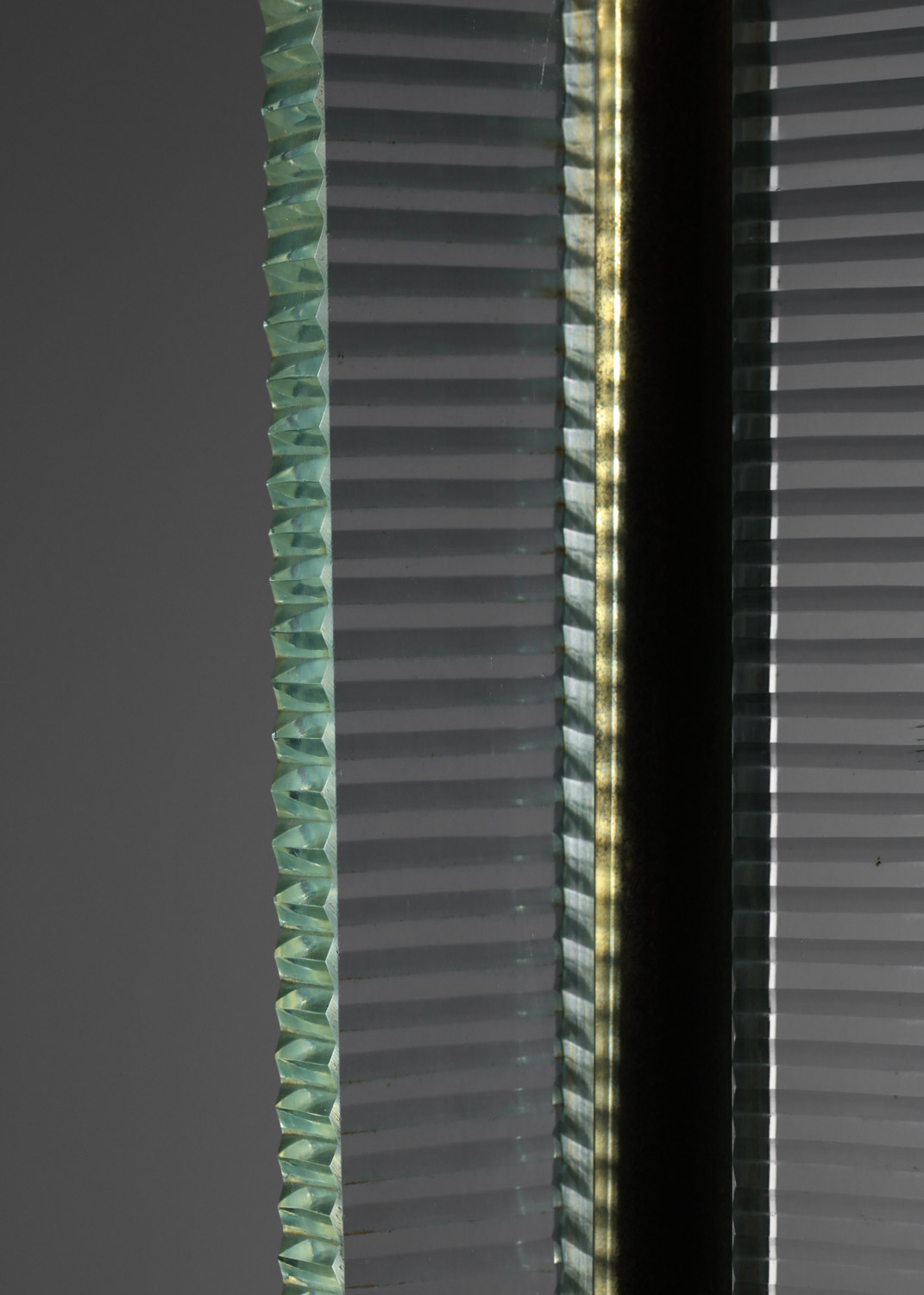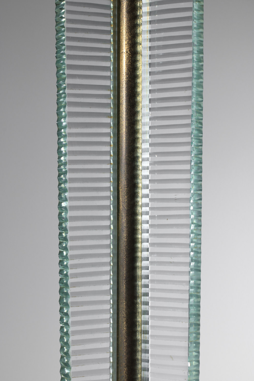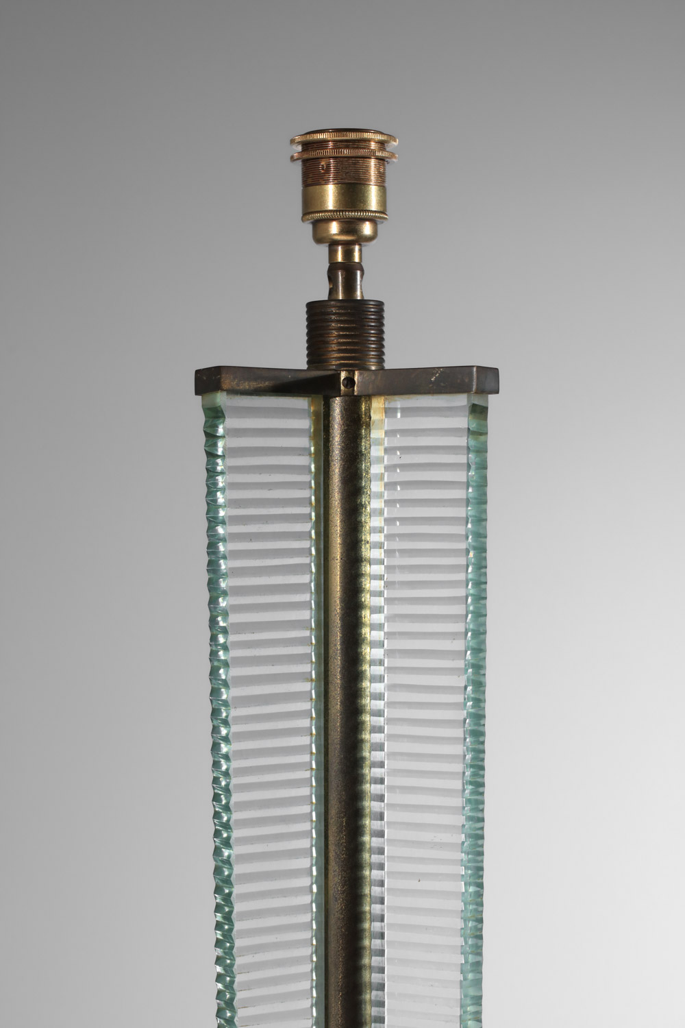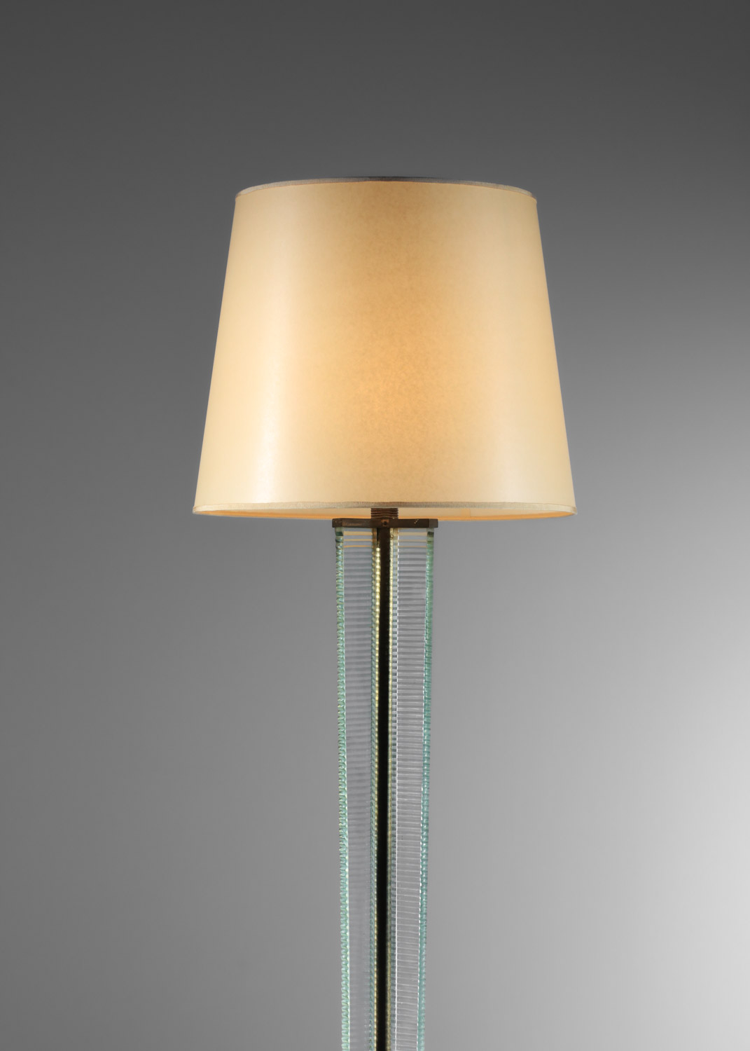 Lampadaire italien des années 30 attribué à Barovier & Toso. Structure et socle en laiton massif et dalle de verre épais. Bel état vintage, à noter des traces du temps d’usage: éclats mineurs sur le verre, oxydation du laiton (voir photos). L’abat-jour a été refait sur mesure. Nous recommandons une ampoule LED E27.