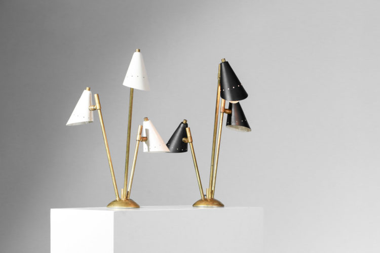Lampe de bureau Italienne moderne « Claudia » réalisée dans le style des luminaires des années 60. Structure en laiton massif et 3 diffuseurs en acier laqué. Couleur au choix: noir ou blanc. Ampoule type E14.