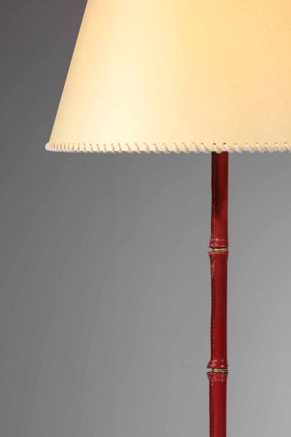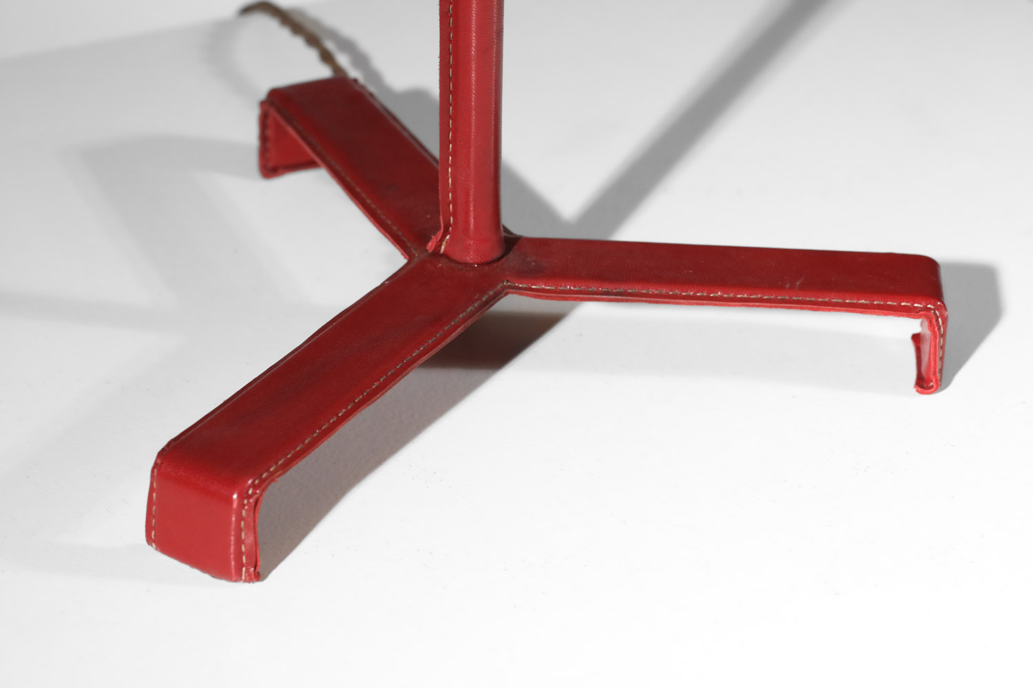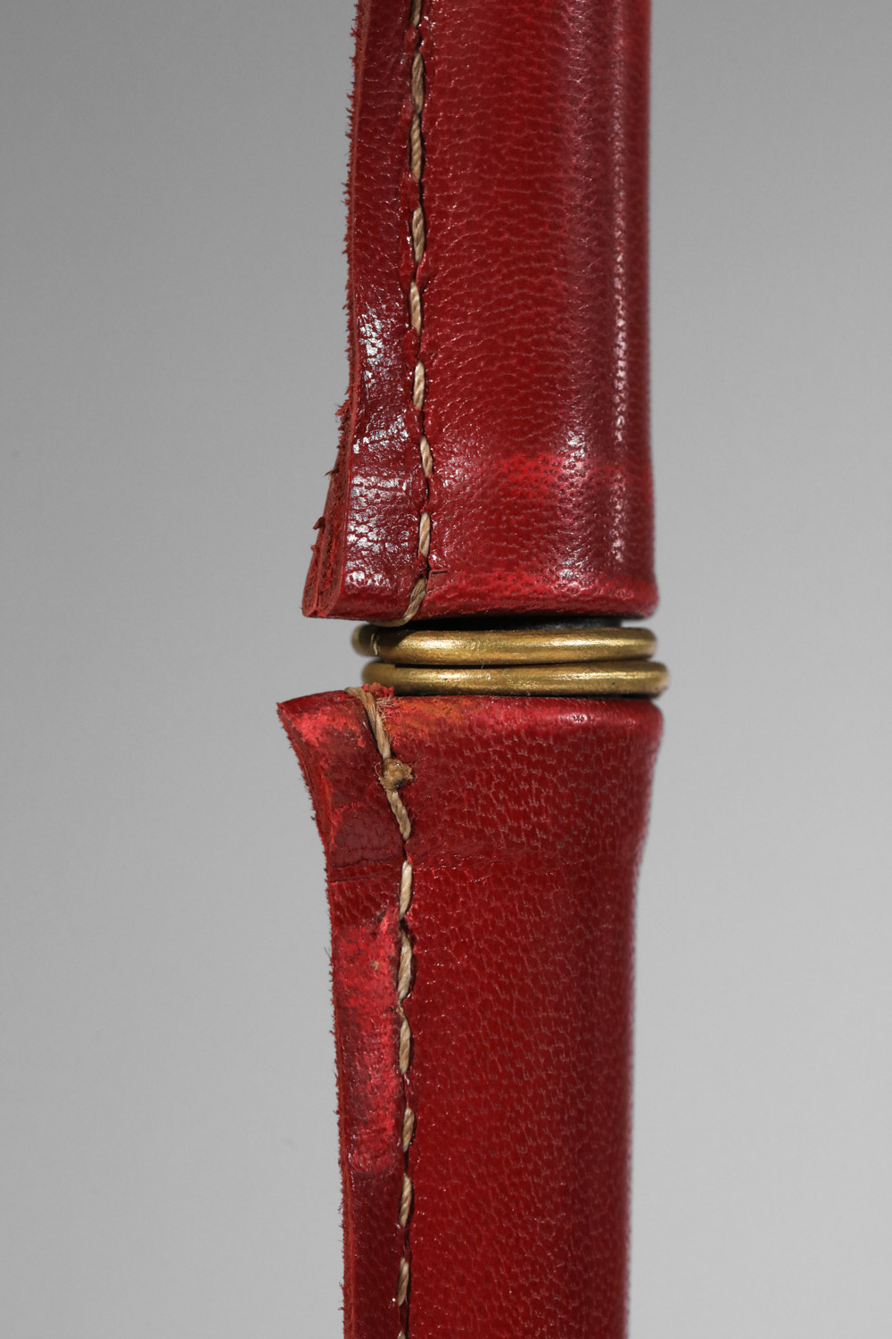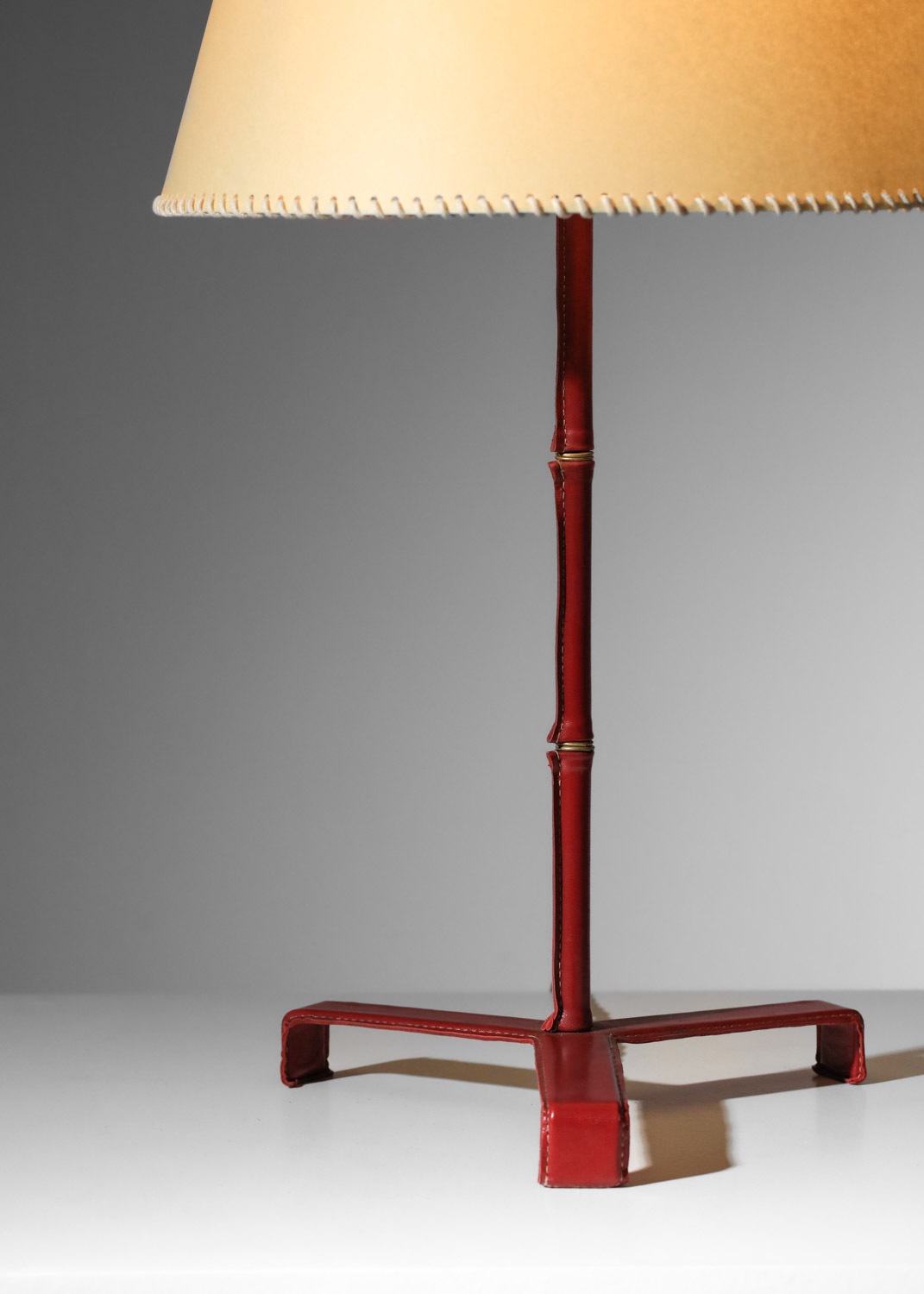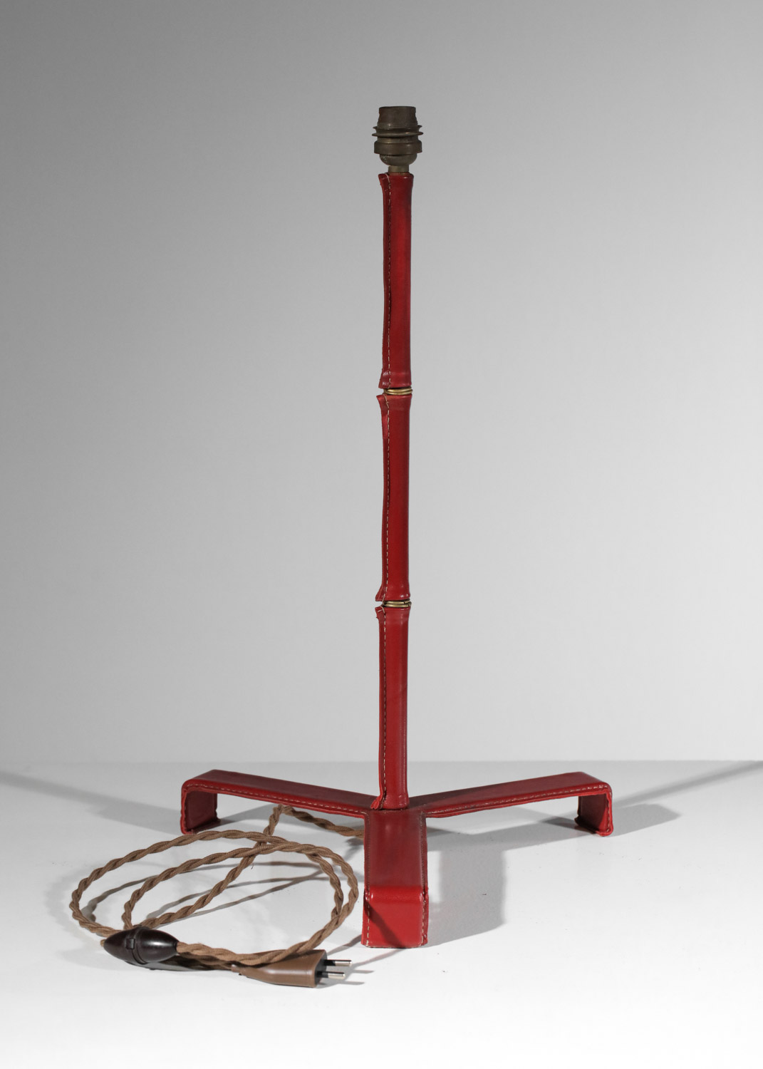 lampe de table gainée de cuir rouge attribuée à jacques adnet années 1940 design vintage français laiton massif piétement tripode