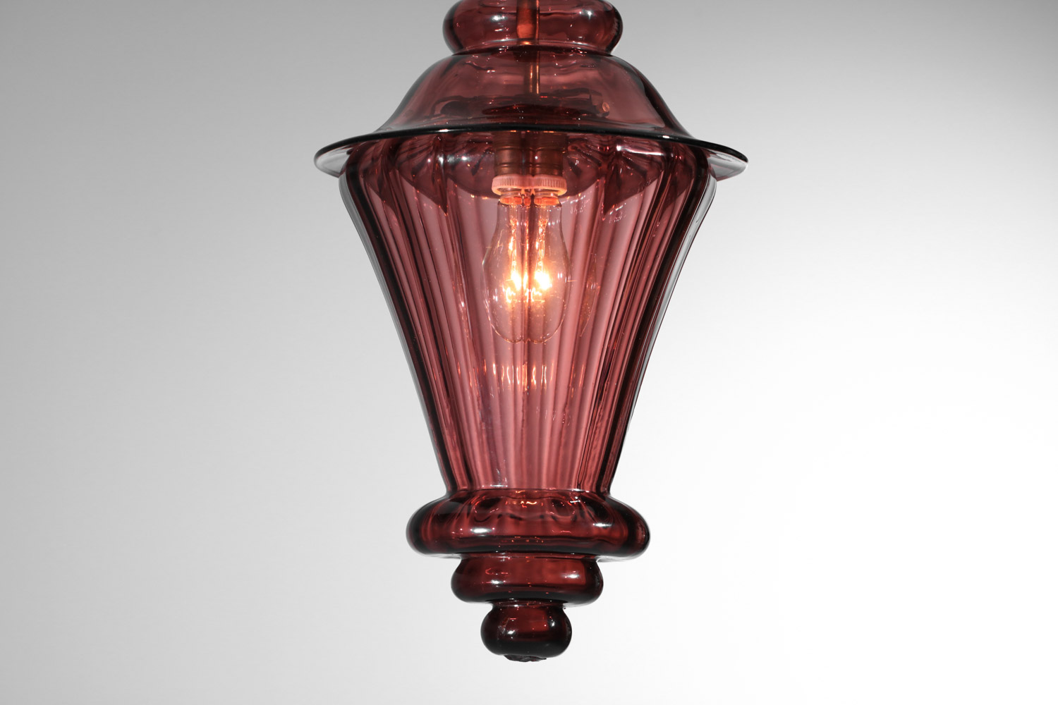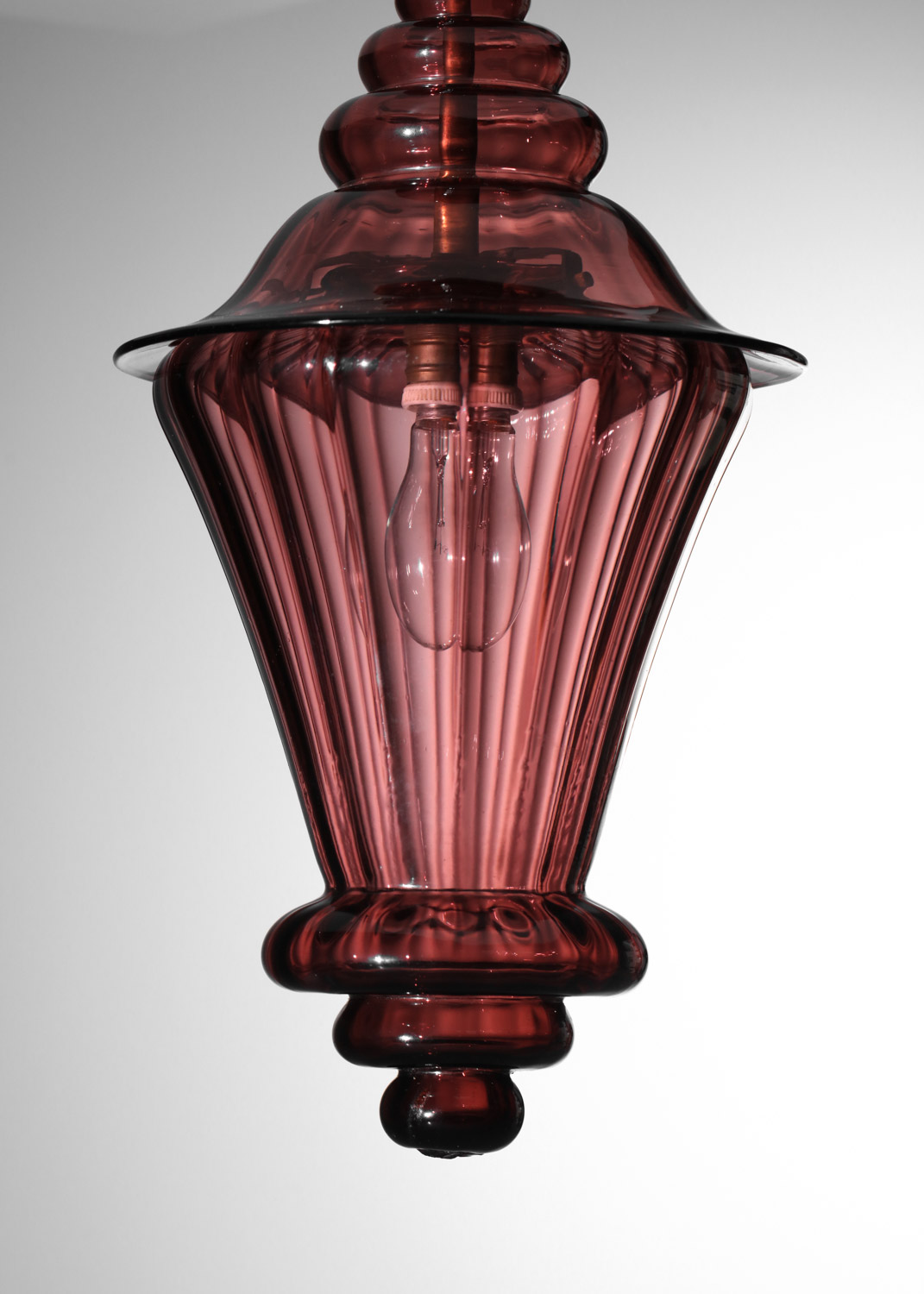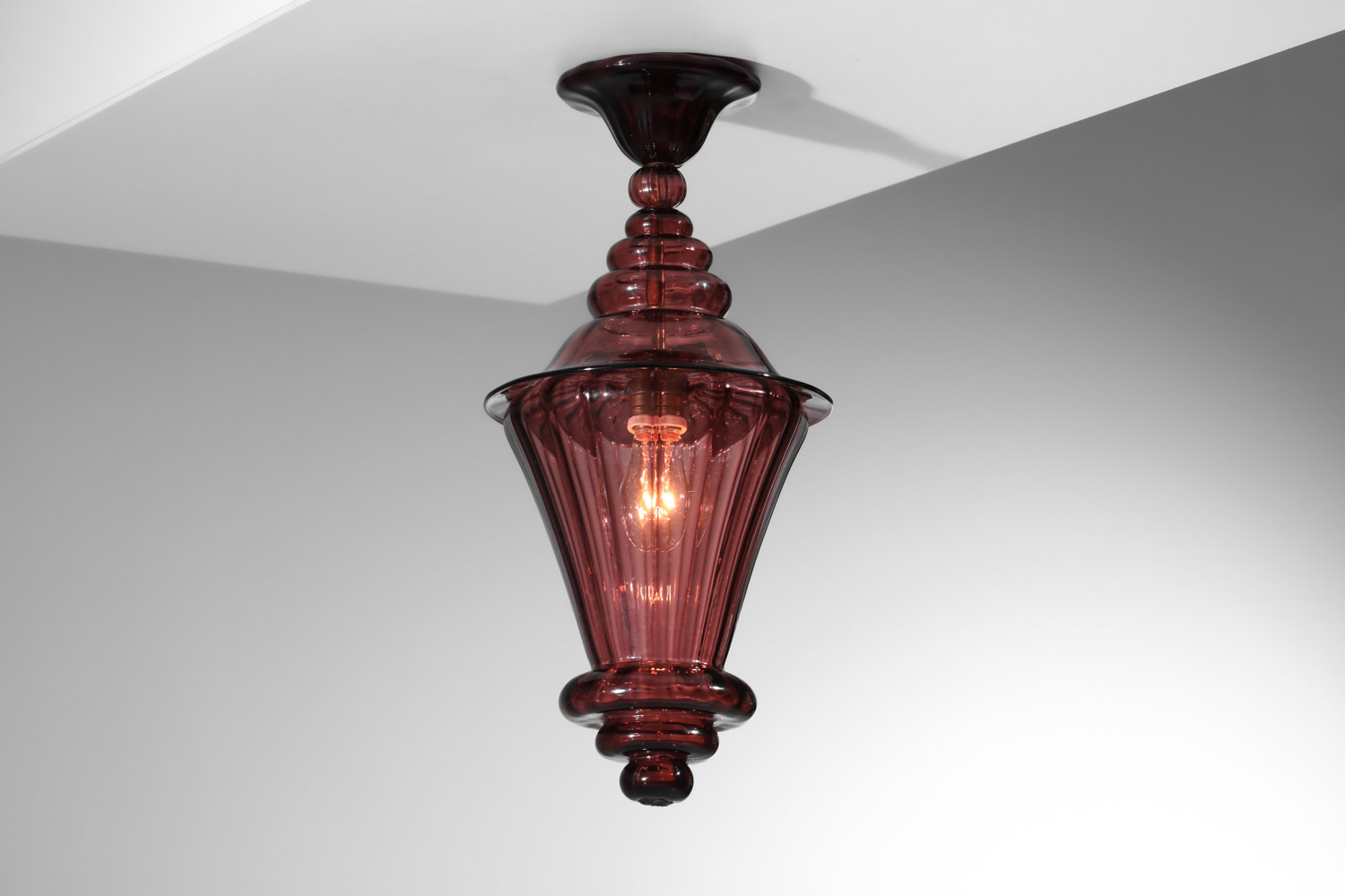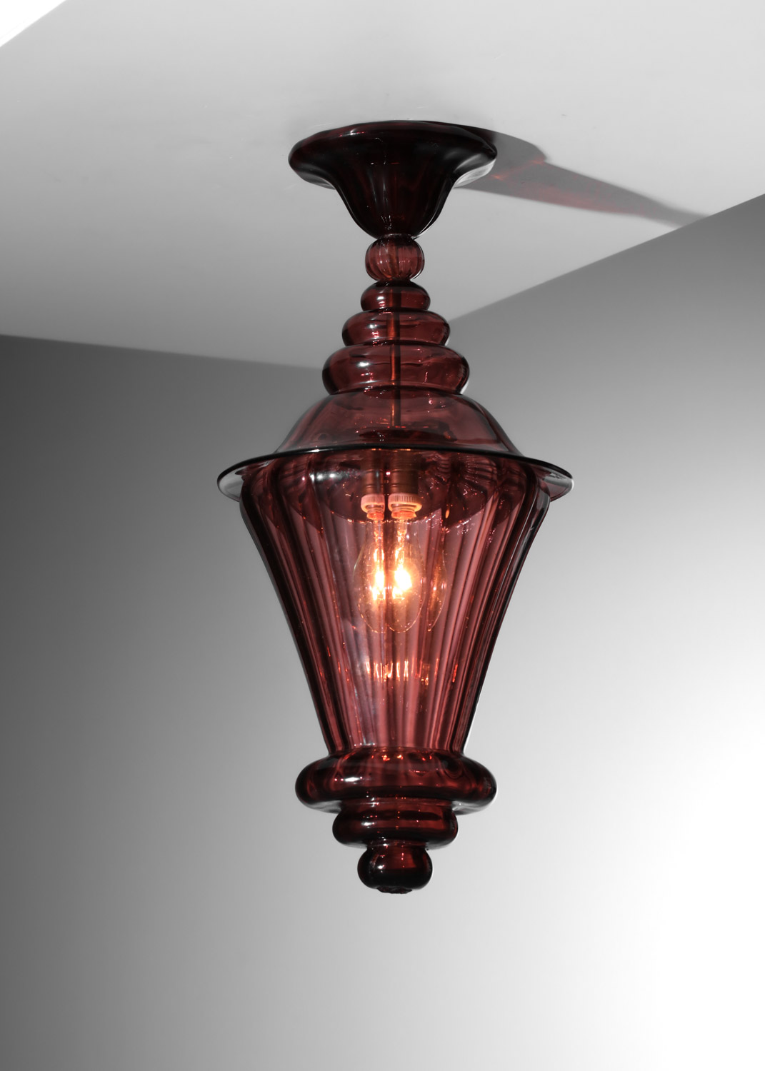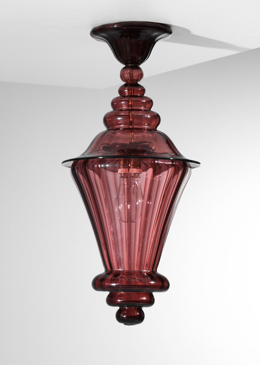 Suspension italienne façon lanterne des années 40 entièrement en verre de Murano violet transparent. Très bel état vintage, à noter de légères traces du temps. Nous recommandons une ampoule LED type E27. Si besoin nous pouvons rallonger la suspension avec une chaîne au niveau de l’accroche.