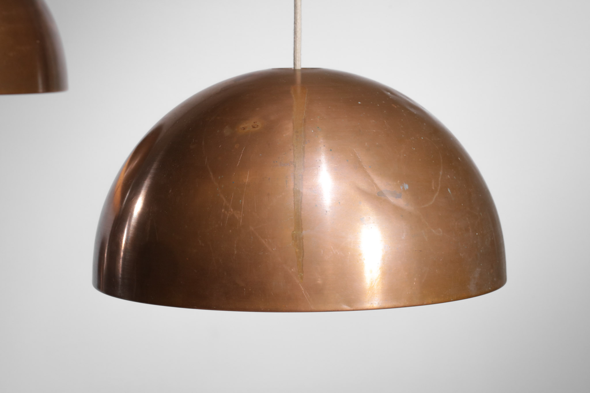 Lot de trois suspensions scandinaves des années 60 du designer danois Jo Hammerborg. Abat-jour en cuivre et diffuseurs en plastique blanc nécessitant trois ampoules par suspension. Bel état vintage, à noter des traces d’usage et du temps sur les abat-jour (Cf photos).