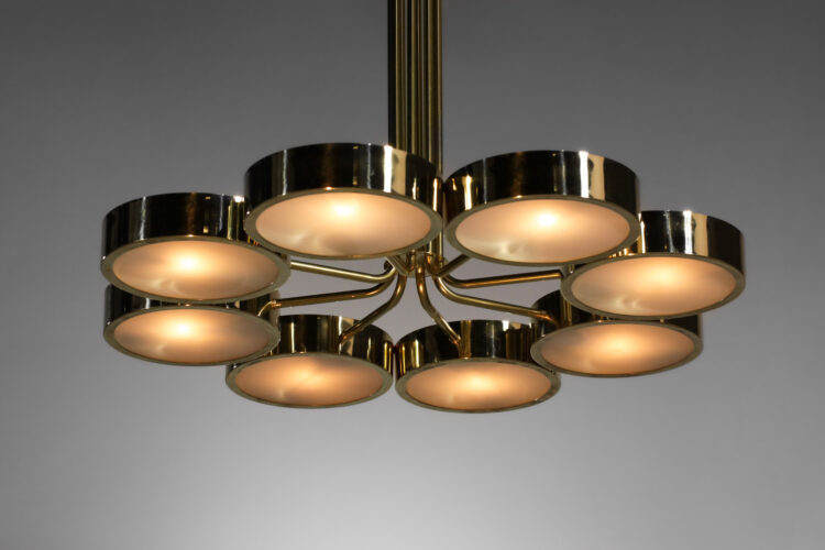 Très beau lustre moderne « Loula », fabriqué par notre artisan italien. Structure en laiton massif composée de huit branches disposées en couronne terminant chacunes par un diffuseur en laiton massif avec un disque de verre dépoli. Très bel effet de lumière une fois allumé. Ampoules LED recommandées type E14.