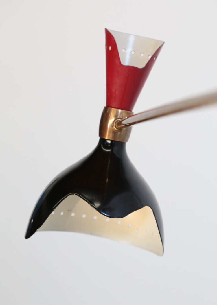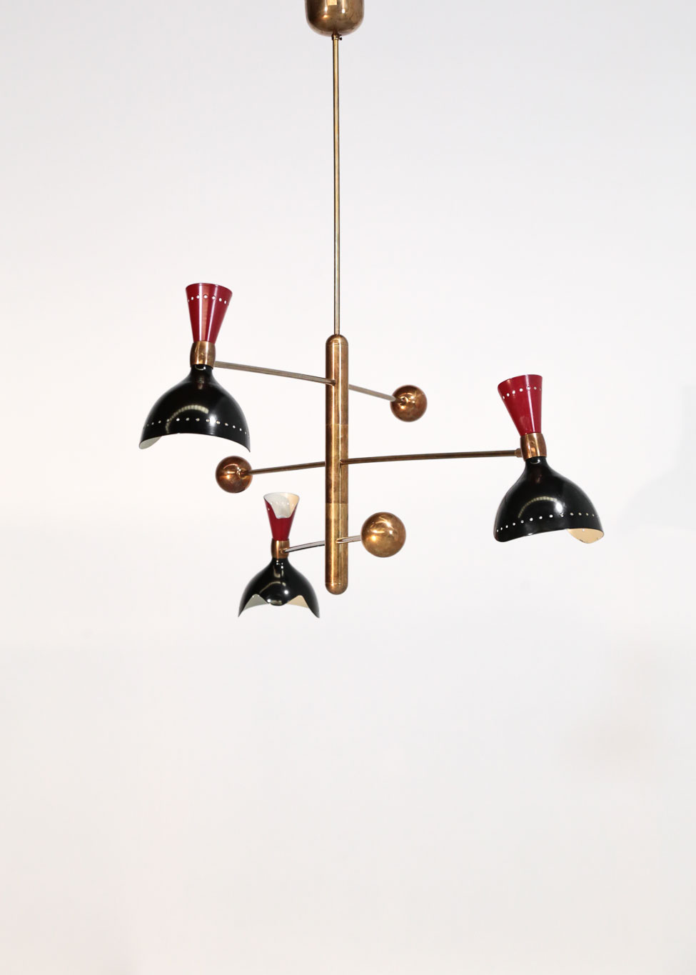 Rare lustre italien des années 60 en laiton attribué à Stilnovo. Le lustre est composé de 3 bras modulables avec contrepoids pour équilibrer l’ensemble. structure en laiton massif et abat jour en tôle d’acier ciselée et perforée. ampoule type E14 sur la partie haute et E24 sur la partie basse.